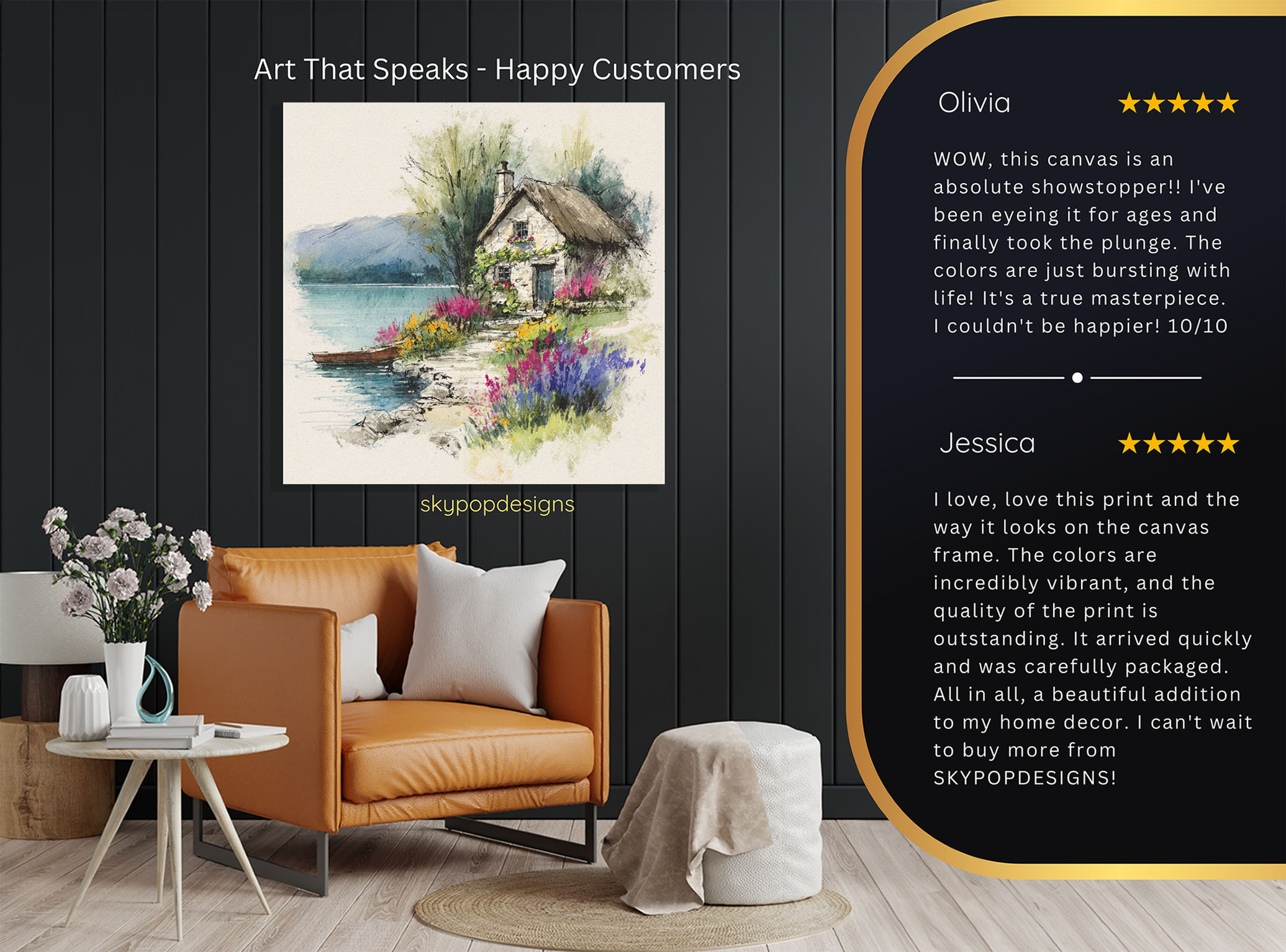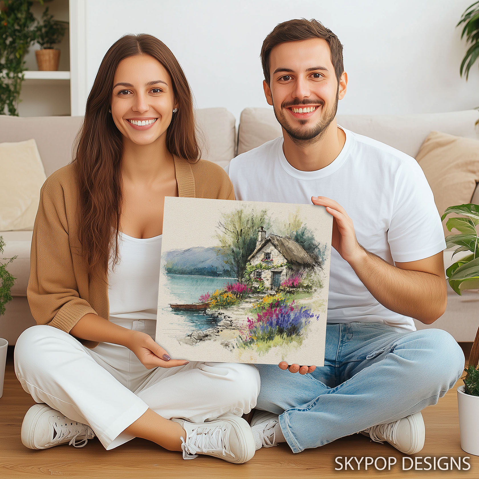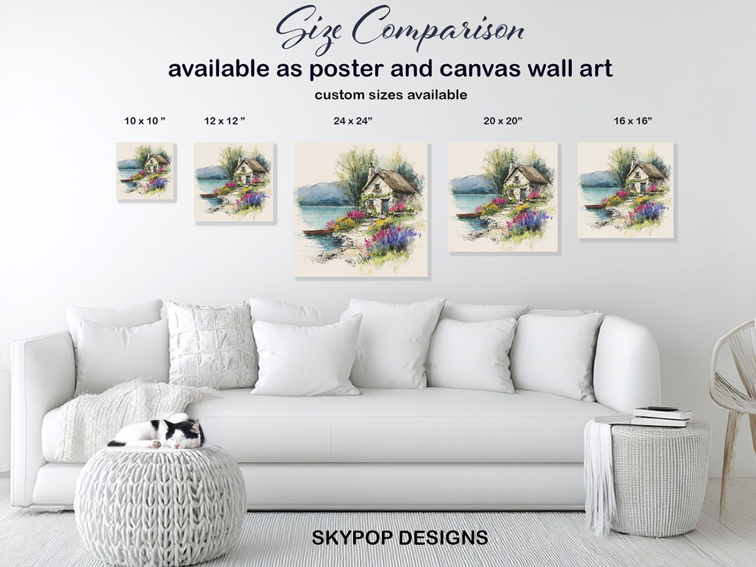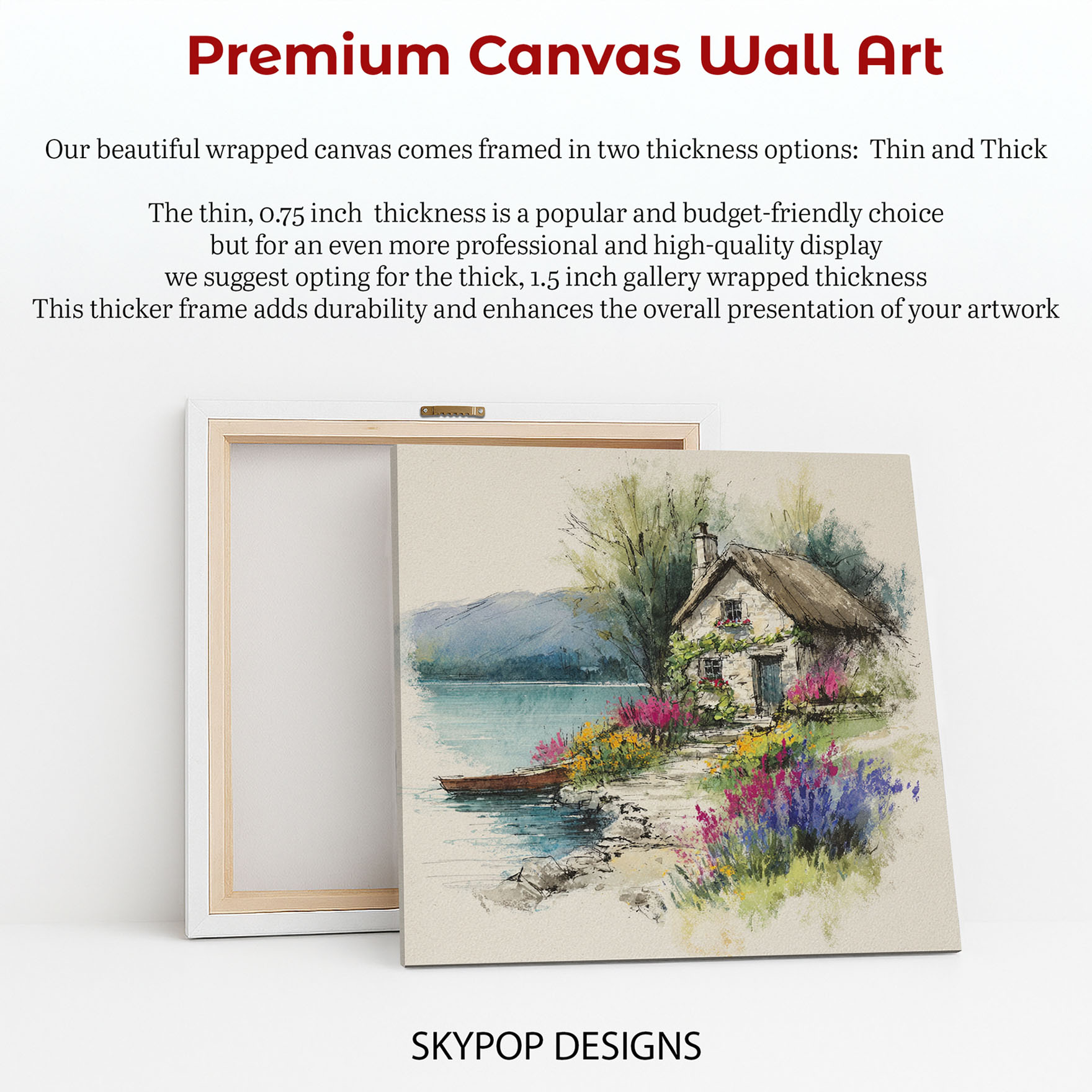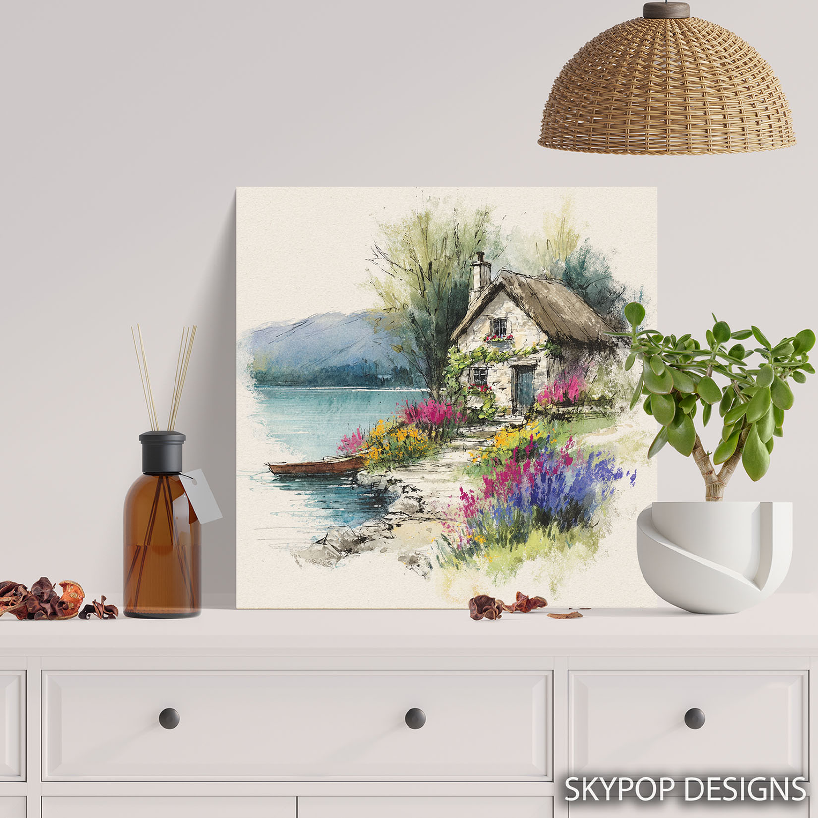 Bring the charm of a rustic getaway into your home with this enchanting lakeside cottage canvas wall art. This beautiful poster or canvas wall art captures the essence of a serene countryside scene, featuring a quaint cottage nestled beside tranquil blue waters, vibrant wildflowers, and lush greenery. The impressionistic style and nature art elements create a captivating focal point that will transform any living room or bedroom. The interplay of blues, greens, and pops of multicolor flowers evokes a feeling of peace and natural beauty, making it ideal for country, rustic, or farmhouse decor styles. This versatile canvas art piece is perfect for adding character to your dining room or as a welcoming statement in your entryway. High-quality printing ensures the delicate watercolor textures and vibrant colors are beautifully preserved on every canvas print, delivering a stunning visual experience. This artwork is a wonderful gift for housewarmings, birthdays, or holidays, bringing the serenity of nature indoors. Elevate your home with this beautiful nature-inspired wall art that celebrates the simple elegance of a quiet lakeside retreat. Transform your space and create a calming ambiance with this exquisite cottage canvas art today.