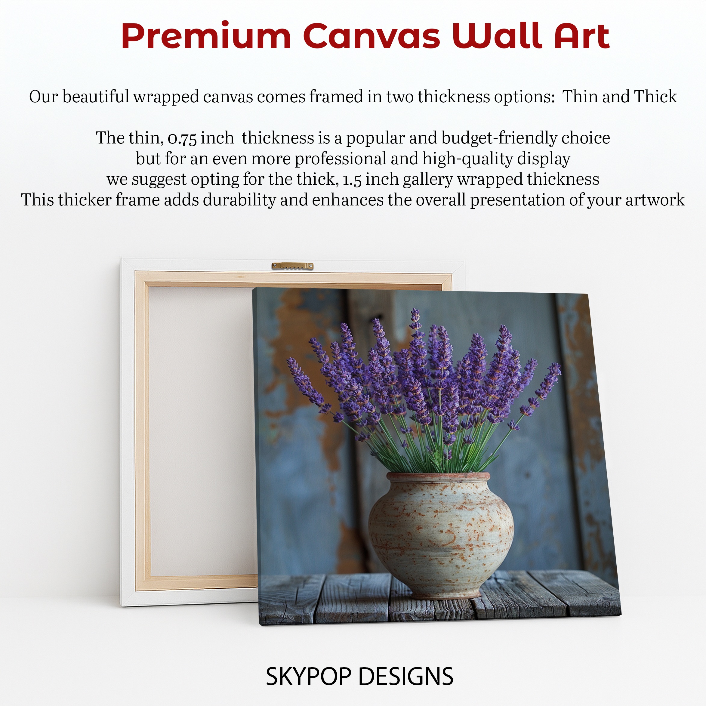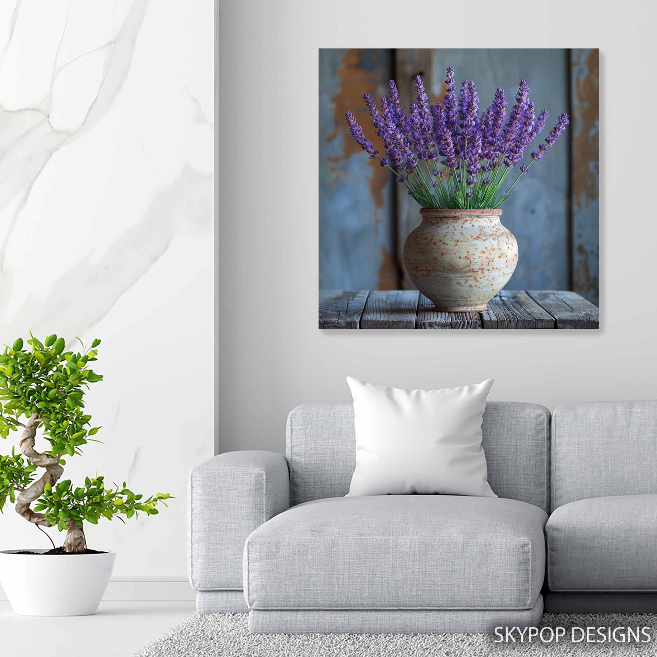 Transform your space with this beautiful lavender canvas wall art, capturing the serene essence of nature in a rustic still life. This poster or canvas wall art is perfect for adding a calming presence to living room decor or creating a tranquil bedroom atmosphere. The vibrant purple lavender blooms pop against the earthy tones of the distressed vase and wooden backdrop, evoking a sense of peace and natural beauty. Ideal for farmhouse, rustic, and bohemian interiors, this floral artwork brings a touch of nature’s charm to any home. The characteristic fragrance and visual appeal of lavender are expertly rendered, offering a sensory experience that enhances any room. High-quality printing ensures every detail, from the delicate texture of the lavender florets to the rustic finish of the vase, is vividly displayed. This versatile floral art piece is perfect for dining rooms or sunrooms, infusing the space with a refreshing and uplifting mood. It makes a thoughtful housewarming gift, birthday present, or holiday surprise for anyone who appreciates the simple elegance of nature. The color palette of purple and green with neutral accents complements a wide range of decor styles, adding a sophisticated yet relaxed feel. Elevate your home with this stunning lavender canvas wall art that brings the calming beauty of a garden indoors. This piece is a must-have for those seeking timeless floral wall art that inspires tranquility and everyday joy. Add a touch of rustic charm and natural elegance to your walls today.