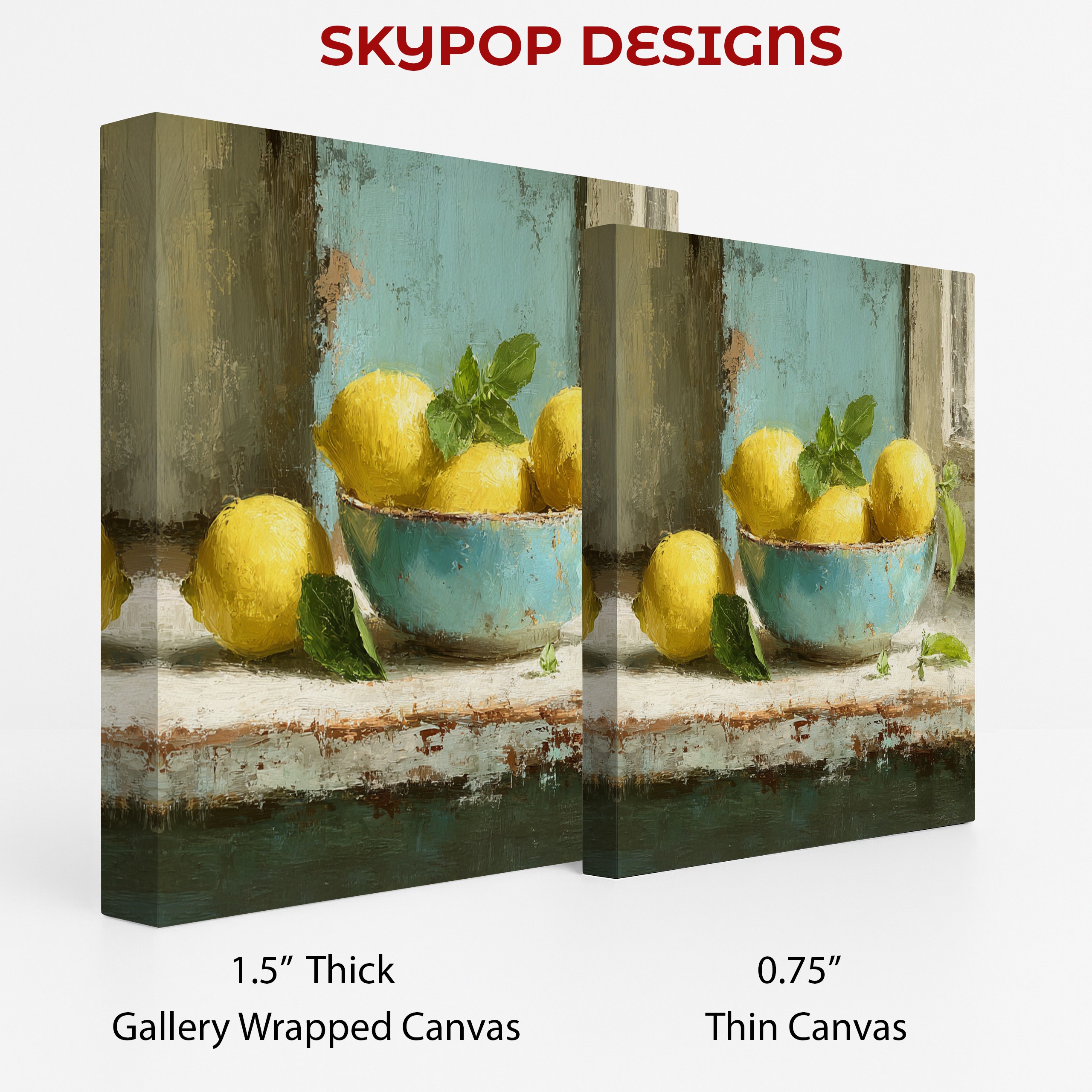 Brighten your space with this vibrant lemon canvas wall art, capturing the essence of a sun-drenched kitchen. This stunning still life poster transforms any room with its fresh, inviting appeal. The artwork showcases ripe yellow lemons nestled in a rustic blue bowl, perfectly complementing farmhouse and country decor styles. Ideal for kitchens, dining rooms, or sunrooms, this canvas wall art brings a zesty pop of color to your walls. The impressionistic brushstrokes add texture and depth, creating a captivating visual experience that draws the eye. Green basil leaves provide a refreshing contrast, enhancing the overall composition. This versatile piece works beautifully in both modern and traditional settings, making it a perfect housewarming gift or kitchen decor update. The soft blue background evokes a sense of calm, while the vibrant lemons symbolize energy and positivity. High-quality printing ensures every detail shines, from the lemons’ textured skin to the bowl’s weathered charm. Whether you’re looking to add a touch of rustic charm or brighten a neutral space, this lemon art poster delivers. Elevate your home’s atmosphere with this timeless still life that celebrates the simple beauty of fresh citrus. Transform your walls and infuse your space with the refreshing essence of lemon art today.