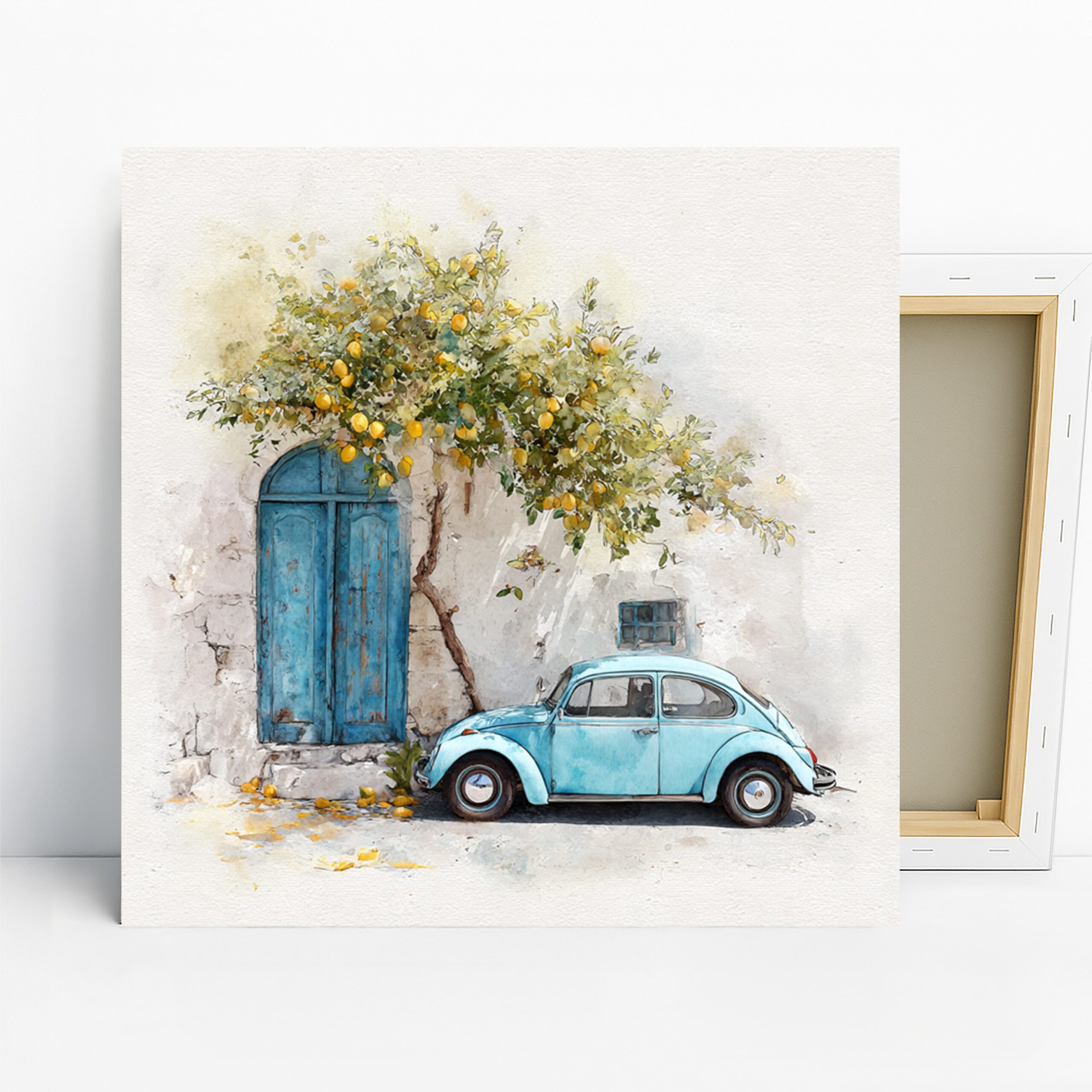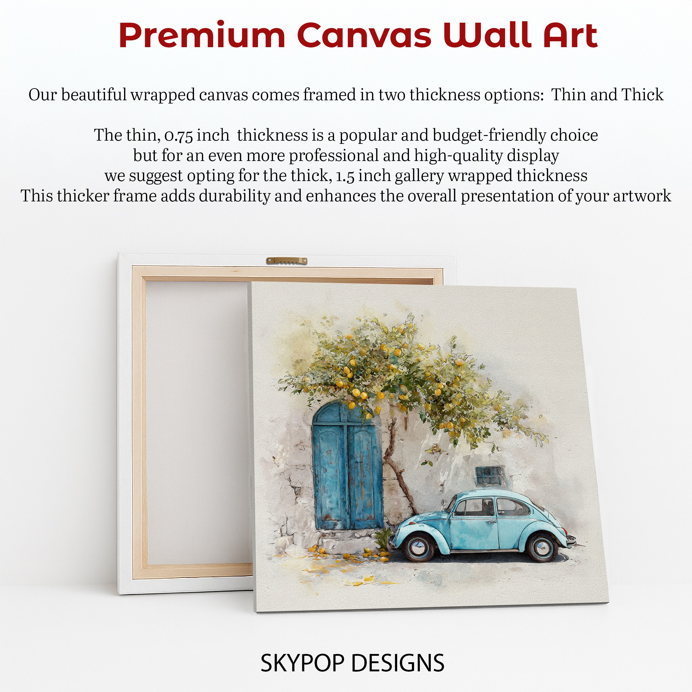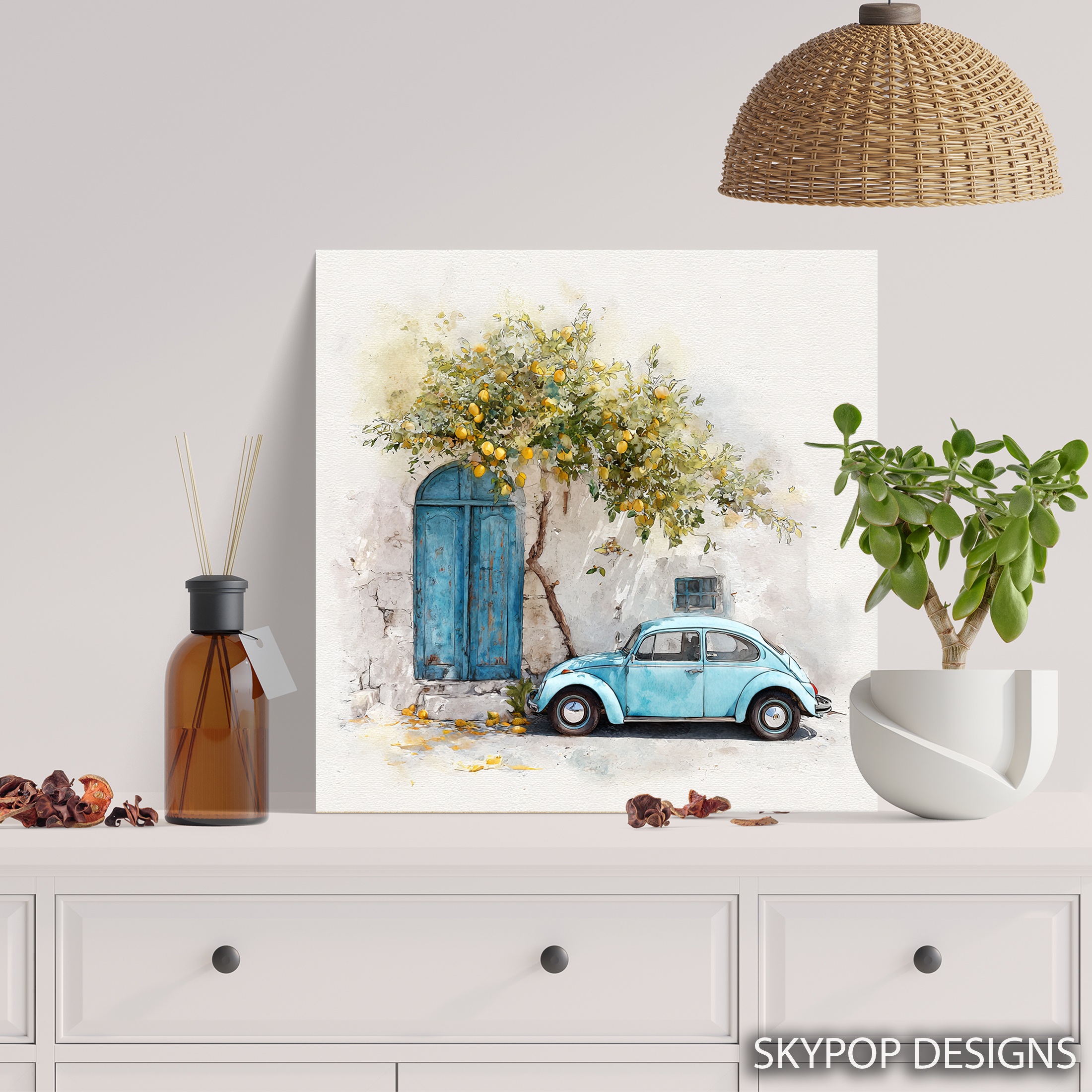 Transform your space with this charming vintage-inspired canvas wall art featuring a classic Volkswagen Beetle parked beneath a lush lemon tree. This eye-catching poster combines the nostalgia of a retro car with the fresh, vibrant energy of Mediterranean scenery. Perfect for brightening up living rooms, bedrooms, or kitchens, this piece adds a pop of cheerful color and whimsical charm to any decor style. The striking contrast between the powder blue Beetle and the sun-ripened lemons creates a visually appealing focal point that draws the eye and sparks conversation. Ideal for coastal or rustic interiors, this canvas art evokes memories of carefree summer days and exotic getaways. The weathered blue door and textured white wall add depth and character, enhancing the overall Mediterranean ambiance. This versatile artwork serves as an excellent gift for car enthusiasts, travel lovers, or anyone looking to add a touch of warmth to their home. The high-quality printing captures every delicate detail, from the car’s classic curves to the intricate leaves of the lemon tree. Whether displayed in a cozy breakfast nook or a welcoming entryway, this poster brings a slice of sun-drenched paradise into your daily life. Elevate your home’s atmosphere with this unique blend of vintage charm and natural beauty that celebrates life’s simple pleasures. Make this delightful Volkswagen and lemon tree artwork the centerpiece of your wall decor collection today.