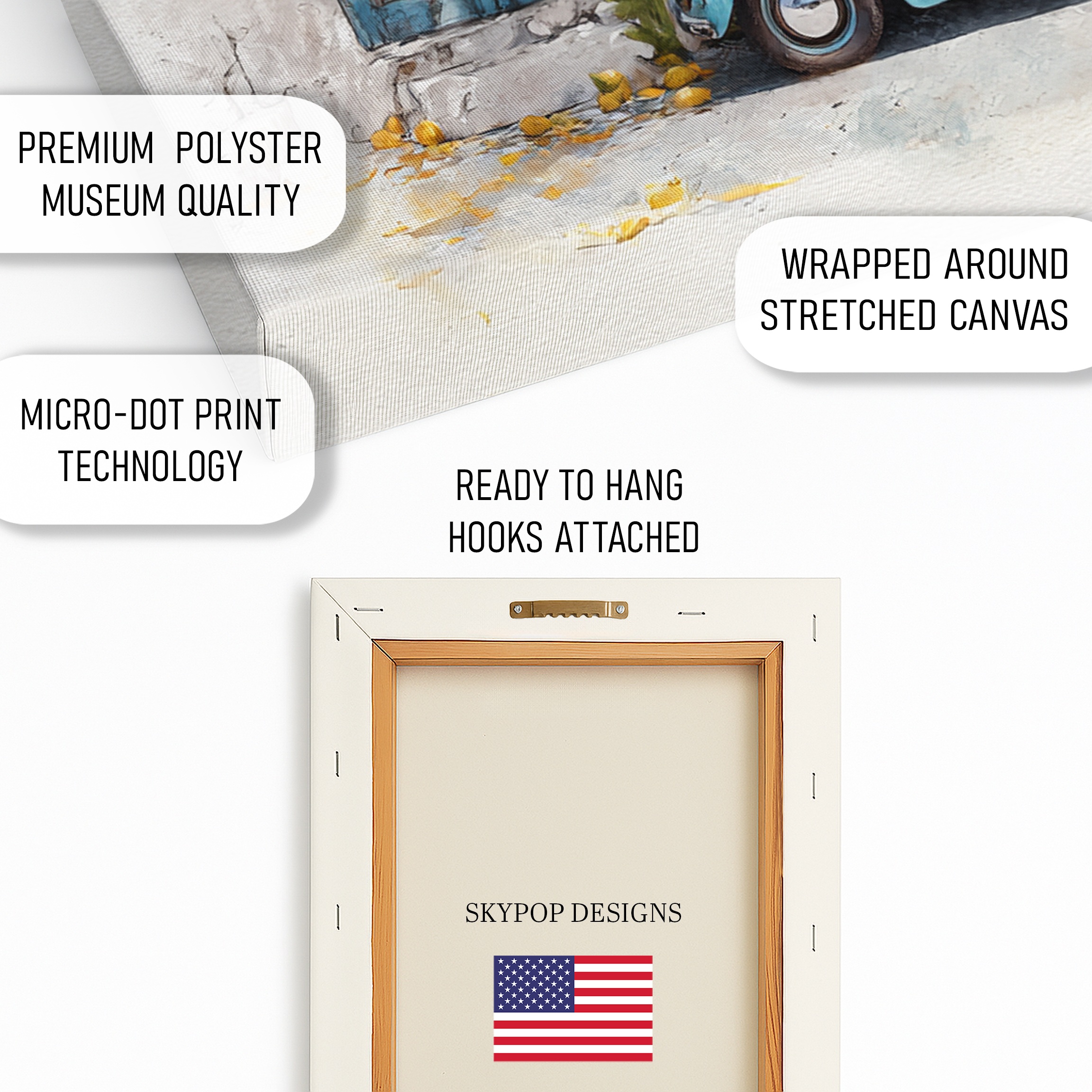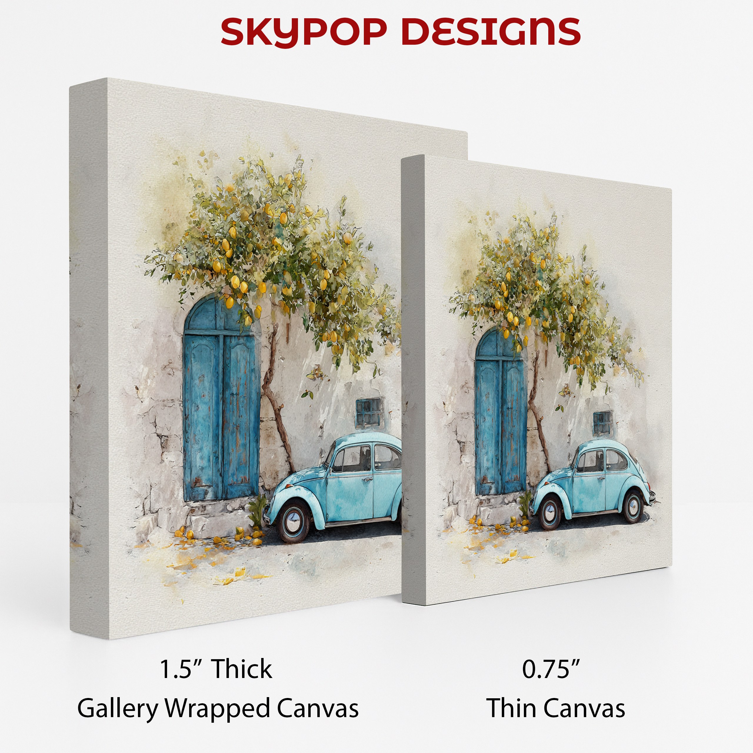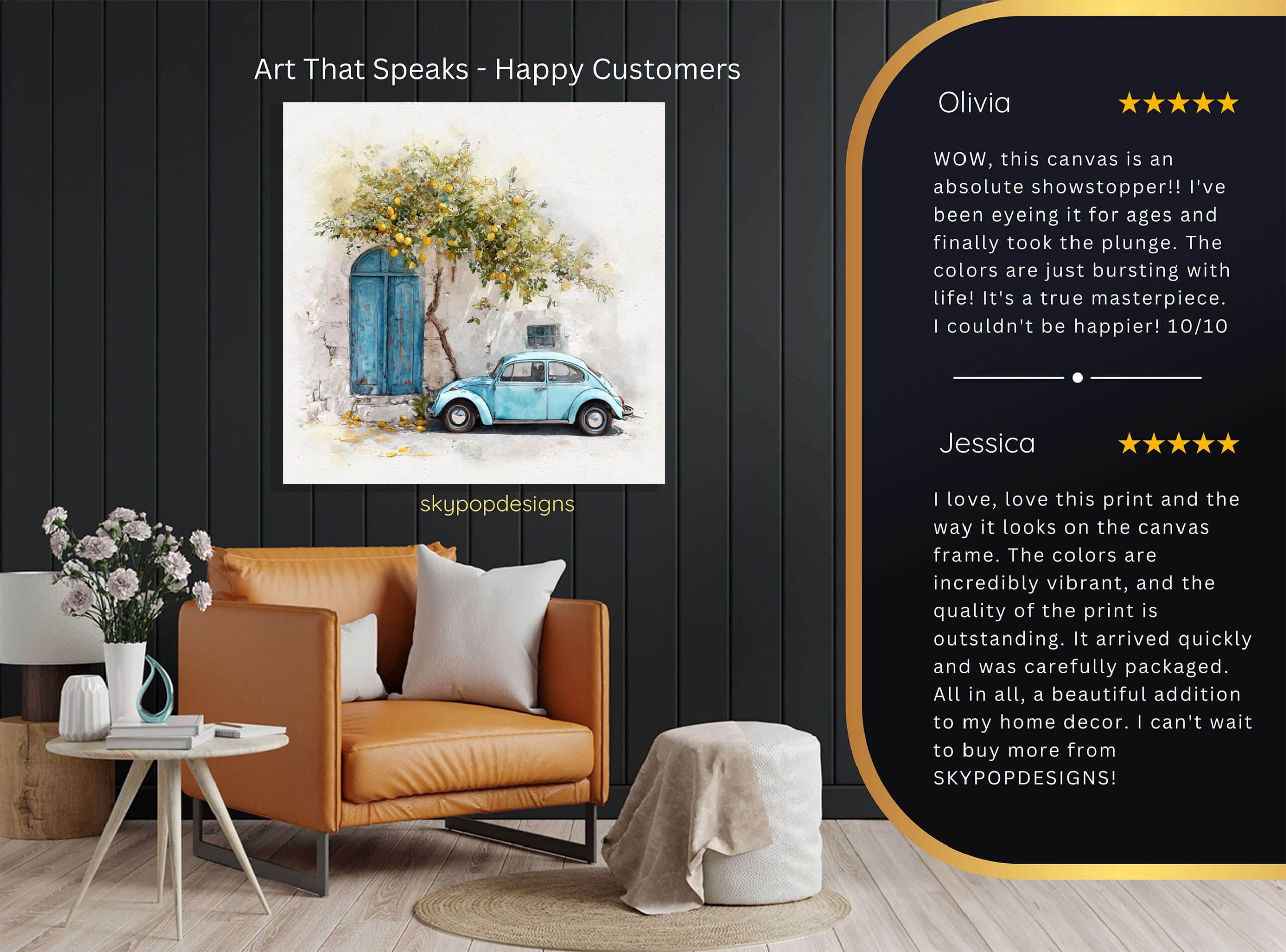 Transform your space with this charming vintage-inspired canvas wall art featuring a classic Volkswagen Beetle parked beneath a lush lemon tree. This eye-catching poster combines the nostalgia of a retro car with the fresh, vibrant energy of Mediterranean scenery. Perfect for brightening up living rooms, bedrooms, or kitchens, this piece adds a pop of cheerful color and whimsical charm to any decor style. The striking contrast between the powder blue Beetle and the sun-ripened lemons creates a visually appealing focal point that draws the eye and sparks conversation. Ideal for coastal or rustic interiors, this canvas art evokes memories of carefree summer days and exotic getaways. The weathered blue door and textured white wall add depth and character, enhancing the overall Mediterranean ambiance. This versatile artwork serves as an excellent gift for car enthusiasts, travel lovers, or anyone looking to add a touch of warmth to their home. The high-quality printing captures every delicate detail, from the car’s classic curves to the intricate leaves of the lemon tree. Whether displayed in a cozy breakfast nook or a welcoming entryway, this poster brings a slice of sun-drenched paradise into your daily life. Elevate your home’s atmosphere with this unique blend of vintage charm and natural beauty that celebrates life’s simple pleasures. Make this delightful Volkswagen and lemon tree artwork the centerpiece of your wall decor collection today.