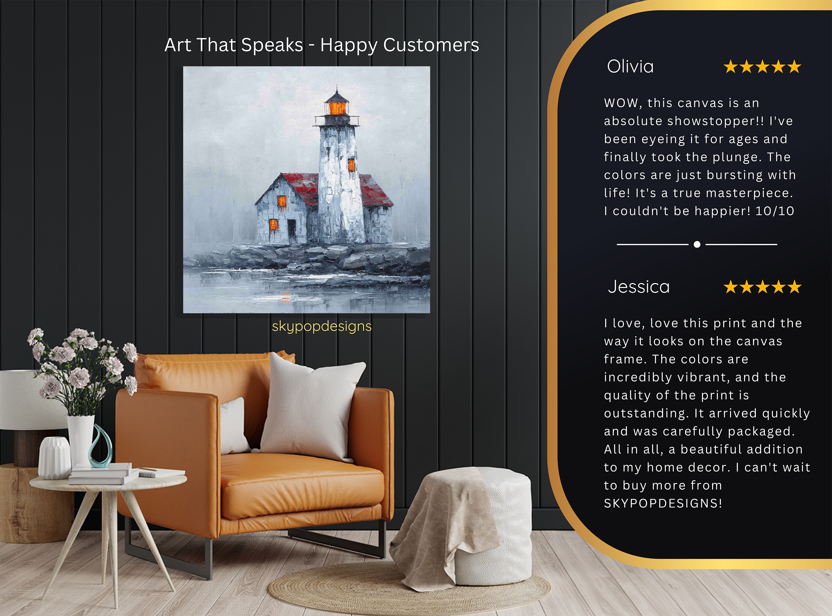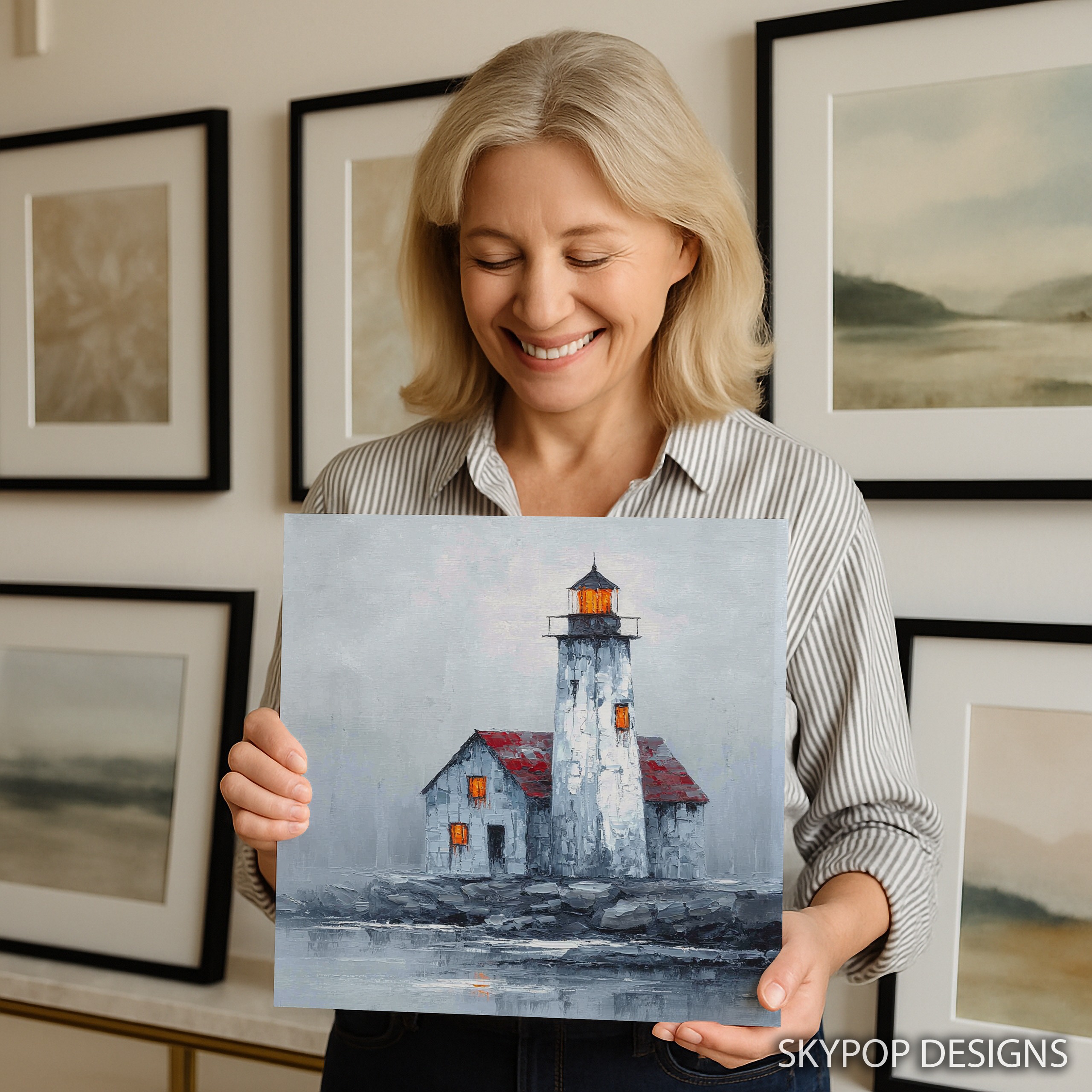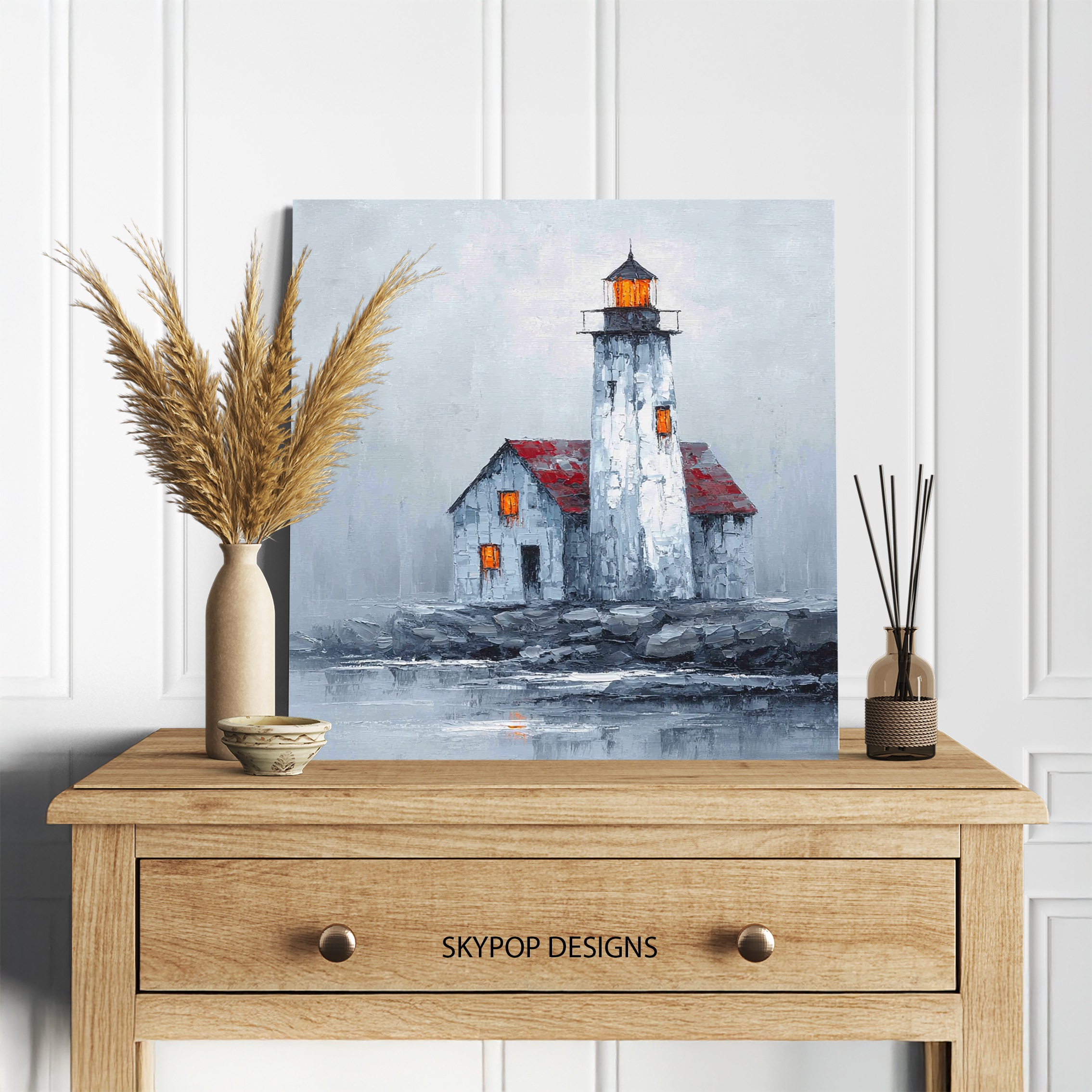 Illuminate your space with this striking lighthouse canvas wall art, capturing the timeless allure of coastal living. This captivating poster transforms any room into a serene seaside retreat, perfect for those seeking a touch of maritime charm. The impressionistic brushstrokes bring the weathered lighthouse to life, its brilliant white tower standing tall against a misty grey backdrop. Vibrant splashes of orange from the warm beacon and glowing windows create a welcoming contrast, drawing the eye and evoking a sense of safety and guidance. Ideal for coastal-inspired living rooms or as a focal point in a nautical-themed bedroom, this canvas art adds depth and character to your decor. The rustic red roof and rocky shoreline enhance the authentic, weathered feel, making it a perfect fit for traditional or farmhouse interiors. Whether you’re decorating a beach house or bringing coastal vibes to an urban apartment, this versatile piece adapts beautifully to various styles. As a thoughtful housewarming gift or a personal indulgence, this lighthouse artwork inspires calm and reflection. The high-quality printing ensures every textured brushstroke is preserved, allowing you to appreciate the artist’s technique up close. Elevate your home office with this serene seascape or create a welcoming entryway that hints at adventures to come. Transform your living space today with this timeless lighthouse canvas art, a beacon of style and tranquility for any home.