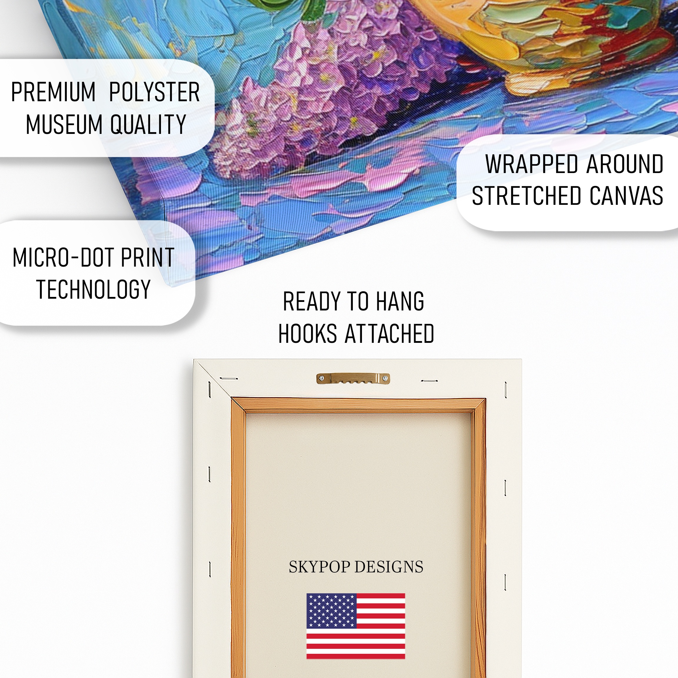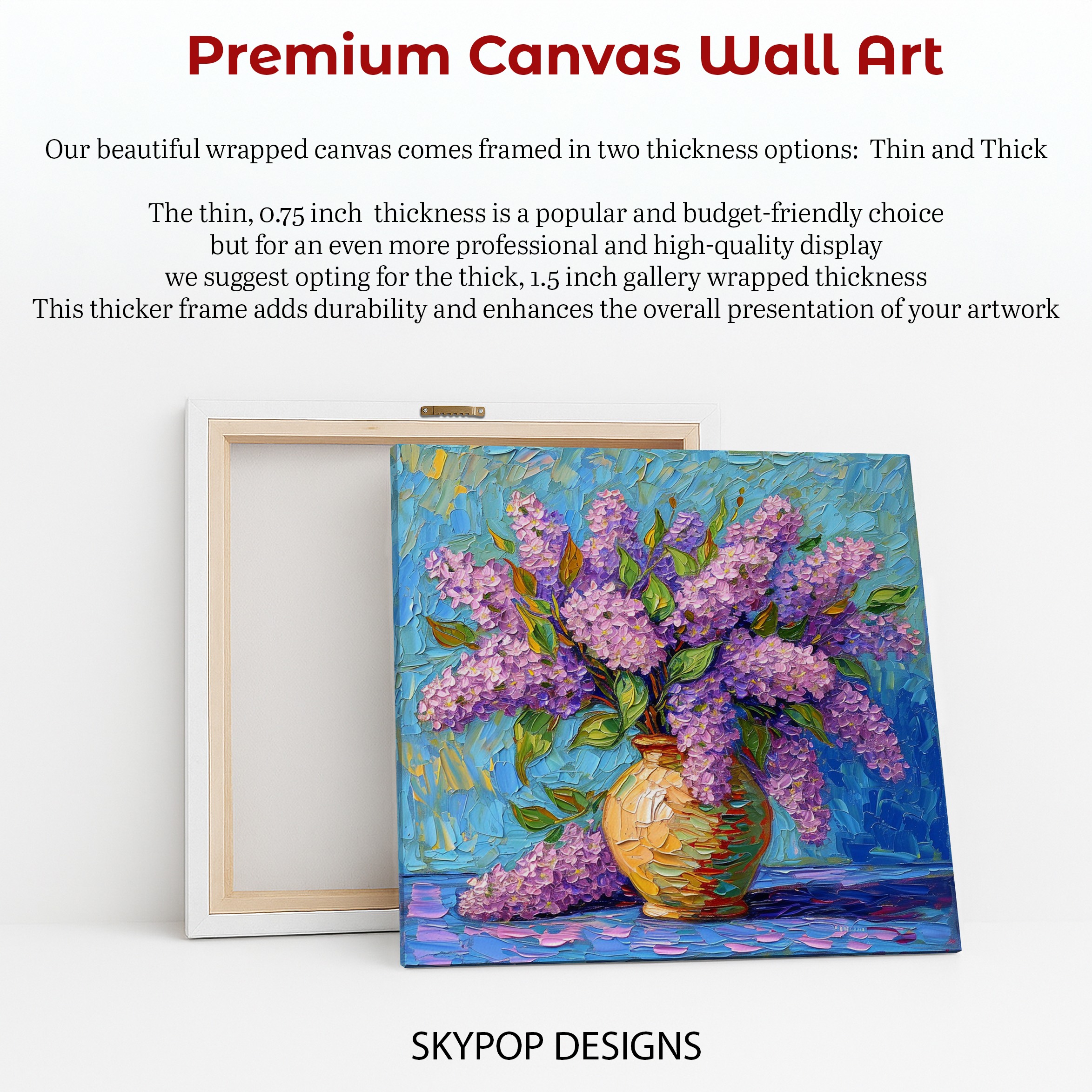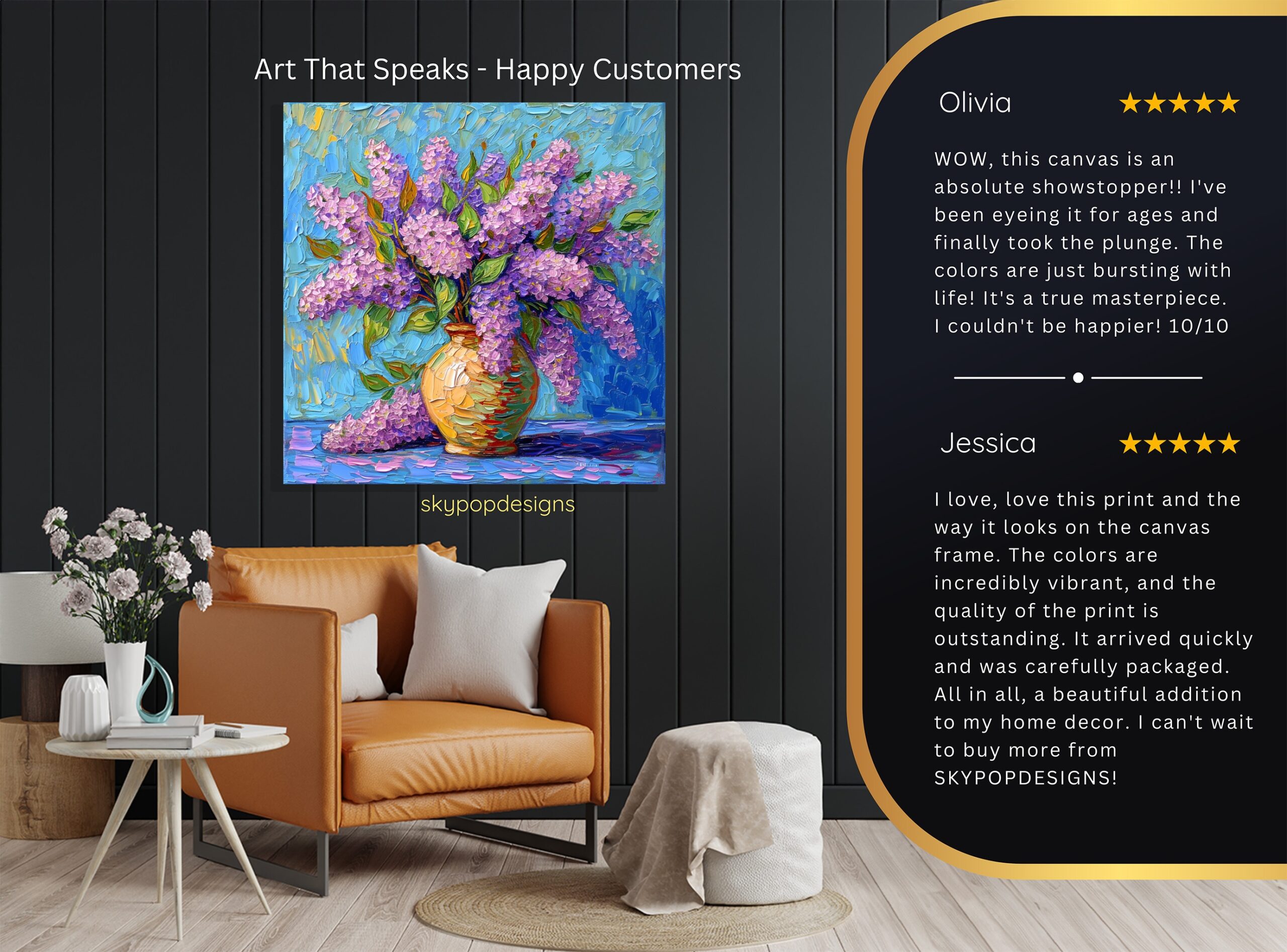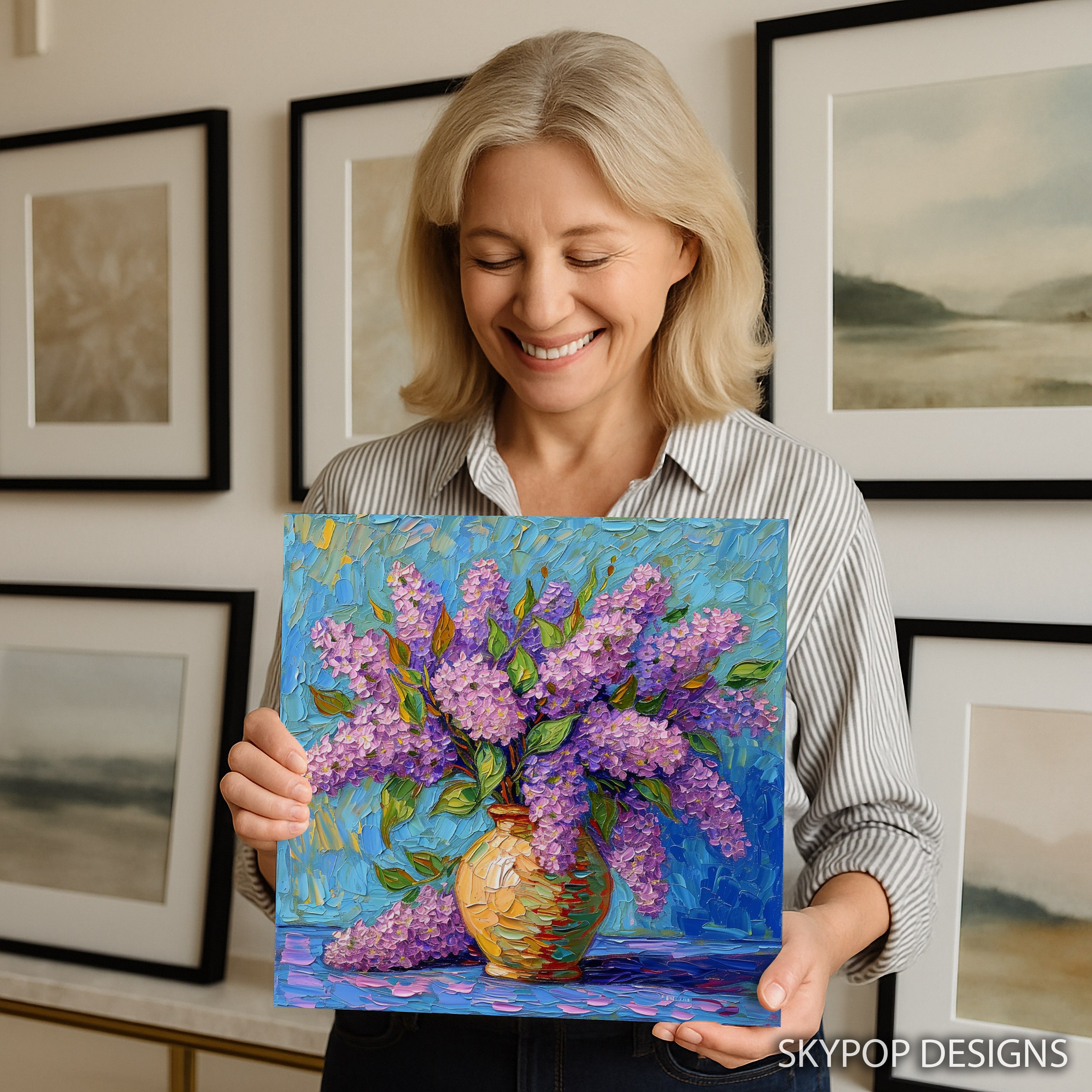 Bring the outdoors in with this stunning lilac canvas wall art, a perfect statement piece to transform your home decor. This vibrant poster or canvas wall art captures the beauty of a lush lilac bouquet with bold, impressionistic brushstrokes. The rich purple hues of the lilacs and the bright blue background create a captivating visual that adds energy and life to any space. Ideal for modern and bohemian living rooms, this floral artwork also complements Scandinavian decor with its fresh, natural aesthetic. The textured application of paint in this canvas wall art gives the lilacs a dimensional quality, making them almost seem to bloom off the wall. This piece is perfect for enhancing your bedroom’s atmosphere, adding a touch of color to your dining room, or welcoming guests in your entryway. Use this beautiful floral art to brighten neutral spaces or complement existing colorful decor schemes. Its striking color palette and expressive style make it a wonderful housewarming gift or a thoughtful present for birthdays and holidays. High-quality printing ensures the vibrancy and detail of this fine art canvas are appreciated for years to come. Elevate your walls with the cheerful and artistic charm of this lilac bouquet poster, a true celebration of nature’s beauty. Add a touch of artisanal quality and captivating color to your art collection today.