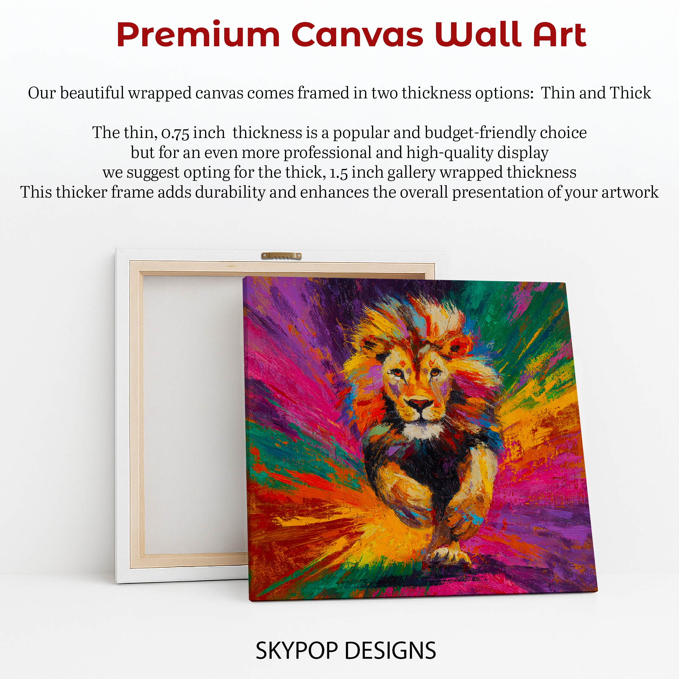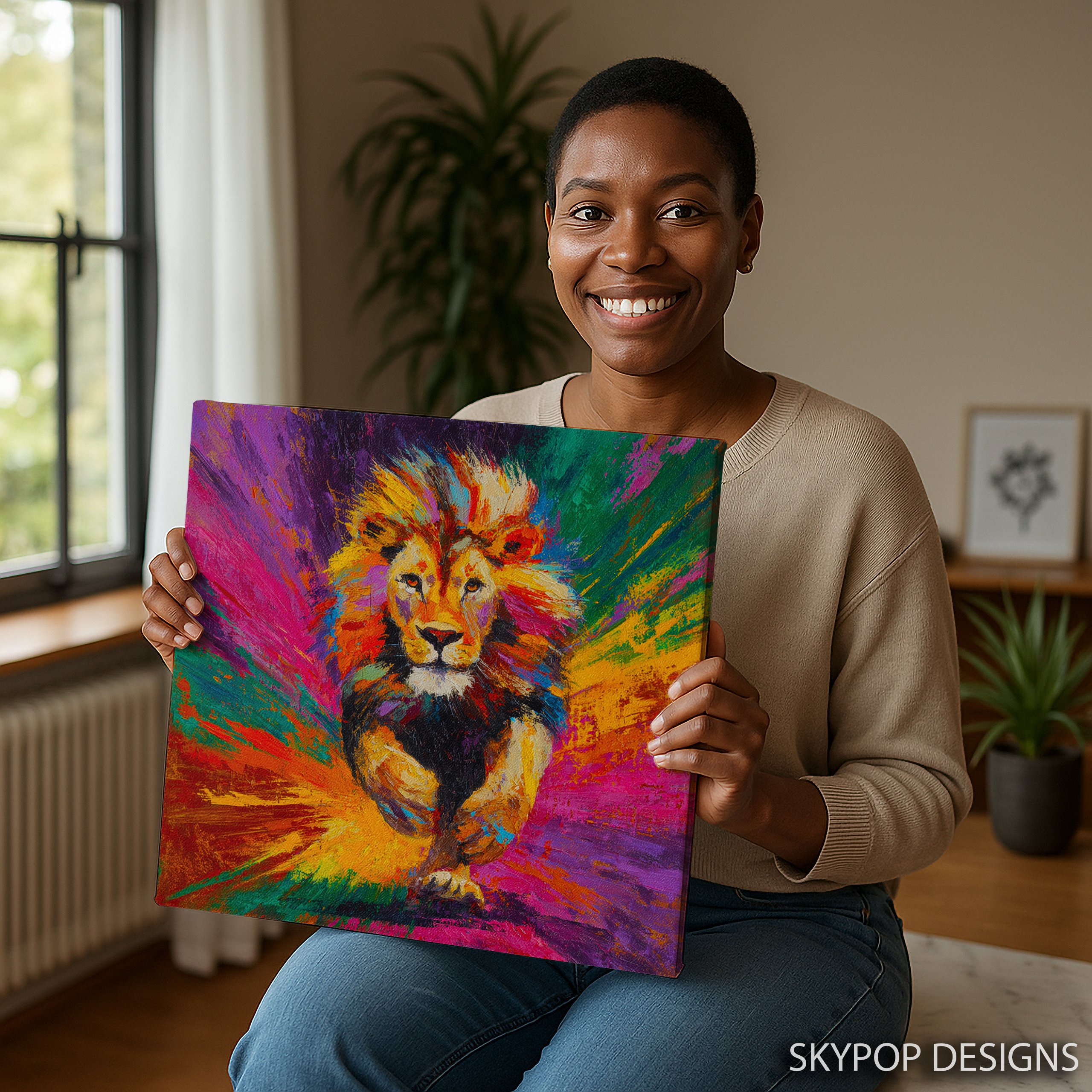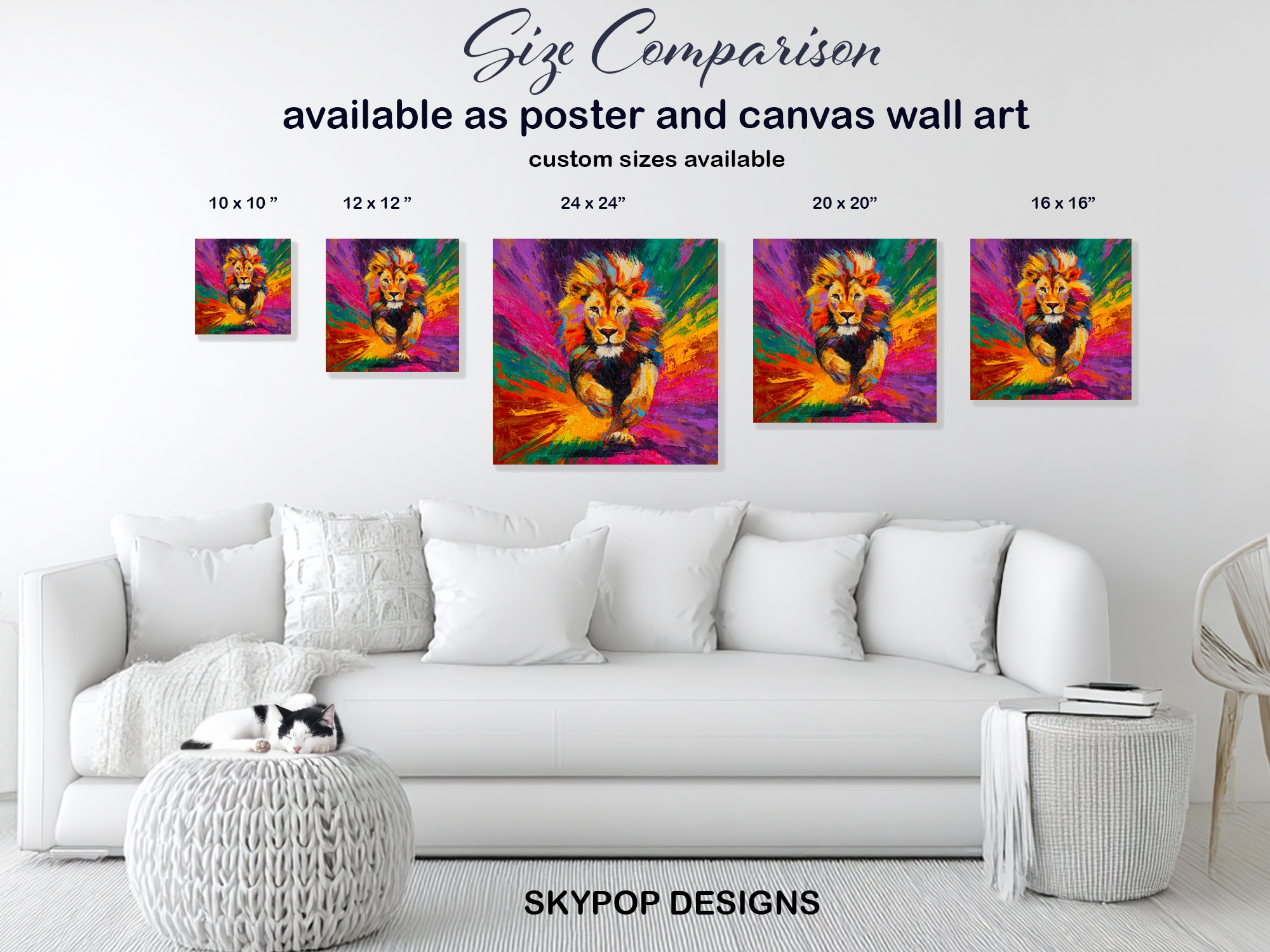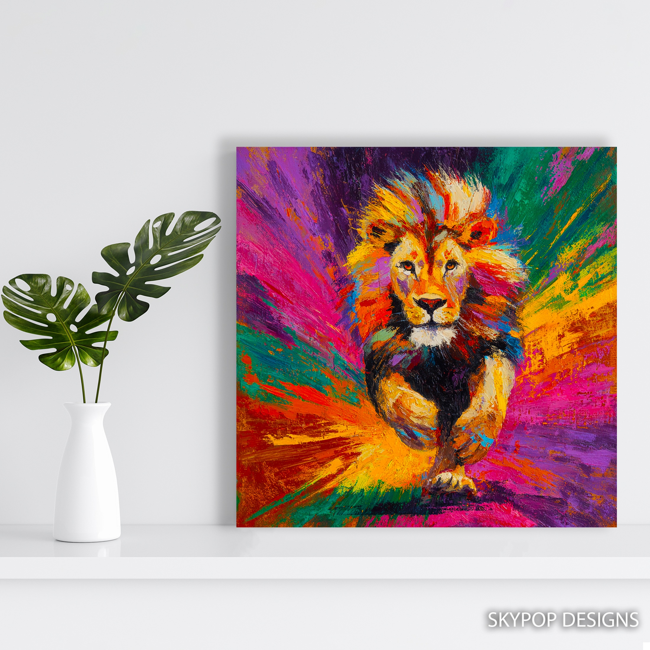 Transform your space with this vibrant lion canvas wall art that bursts with energy and color. This striking poster or canvas print features a majestic lion rendered in a kaleidoscope of bold hues, perfect for adding a pop of excitement to any room. The contemporary style blends seamlessly with modern decor, while the artistic flair appeals to those with bohemian or eclectic tastes. Ideal for living rooms seeking a statement piece or offices in need of inspiring wall decor, this artwork commands attention and sparks conversation. The lion’s piercing gaze and vivid mane radiate strength and creativity, making it a powerful addition to bedroom or kids room walls. The rainbow palette of yellows, oranges, purples, and greens creates a mood-lifting atmosphere, instantly brightening your space. High-quality printing ensures every brushstroke and color splash is captured in stunning detail, whether you choose a poster or canvas format. This versatile piece works well as a focal point in minimalist interiors or as part of a colorful gallery wall. Gift it to art lovers or animal enthusiasts for birthdays or housewarmings. The dynamic composition and expressive style make this lion art a timeless yet trendy choice for home decor. Elevate your walls and inject personality into your space with this eye-catching, contemporary animal artwork today.