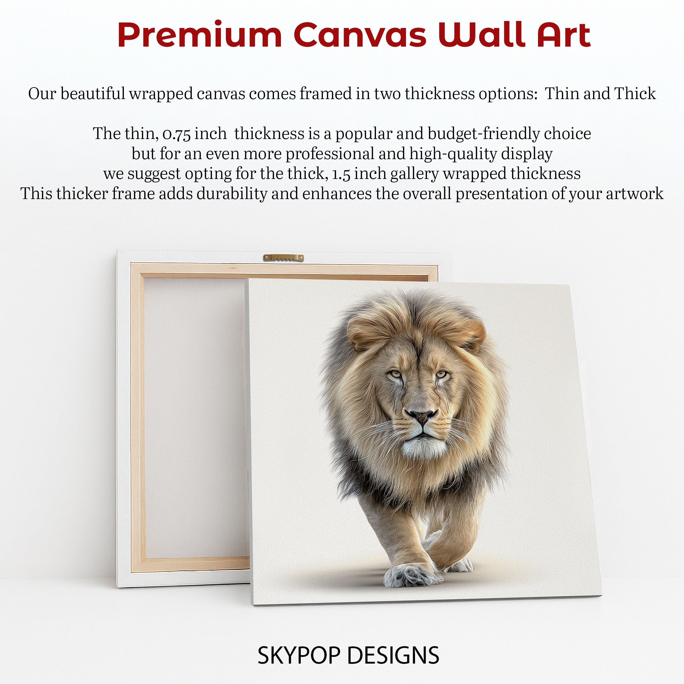 Bring the power and majesty of the wild into your home with this stunning lion canvas wall art. This striking portrait captures the essence of a noble lion, its piercing gaze and magnificent mane demanding attention in any room. Perfect for modern living room wall decor or as a bold statement piece in a minimalist office, this canvas print exudes strength and confidence. The soft, warm tones of beige and gold create a harmonious blend that complements a wide range of interior styles, from Scandinavian-inspired spaces to contemporary bedrooms. This lion poster or canvas art serves as an inspiring focal point, symbolizing courage and leadership – ideal for those seeking motivation in their workspace or a touch of wild elegance in their living areas. The intricate details of the lion’s fur are beautifully rendered, showcasing the quality and craftsmanship of this premium wall art. Whether you’re a nature enthusiast or simply appreciate powerful animal imagery, this lion wall art adds a touch of the savanna to your urban jungle. Available in various sizes, it’s versatile enough to make an impact in small entryways or become a centerpiece in spacious living rooms. Transform your space today with this captivating lion artwork, a perfect gift for animal lovers or anyone looking to infuse their decor with natural charisma and timeless appeal.