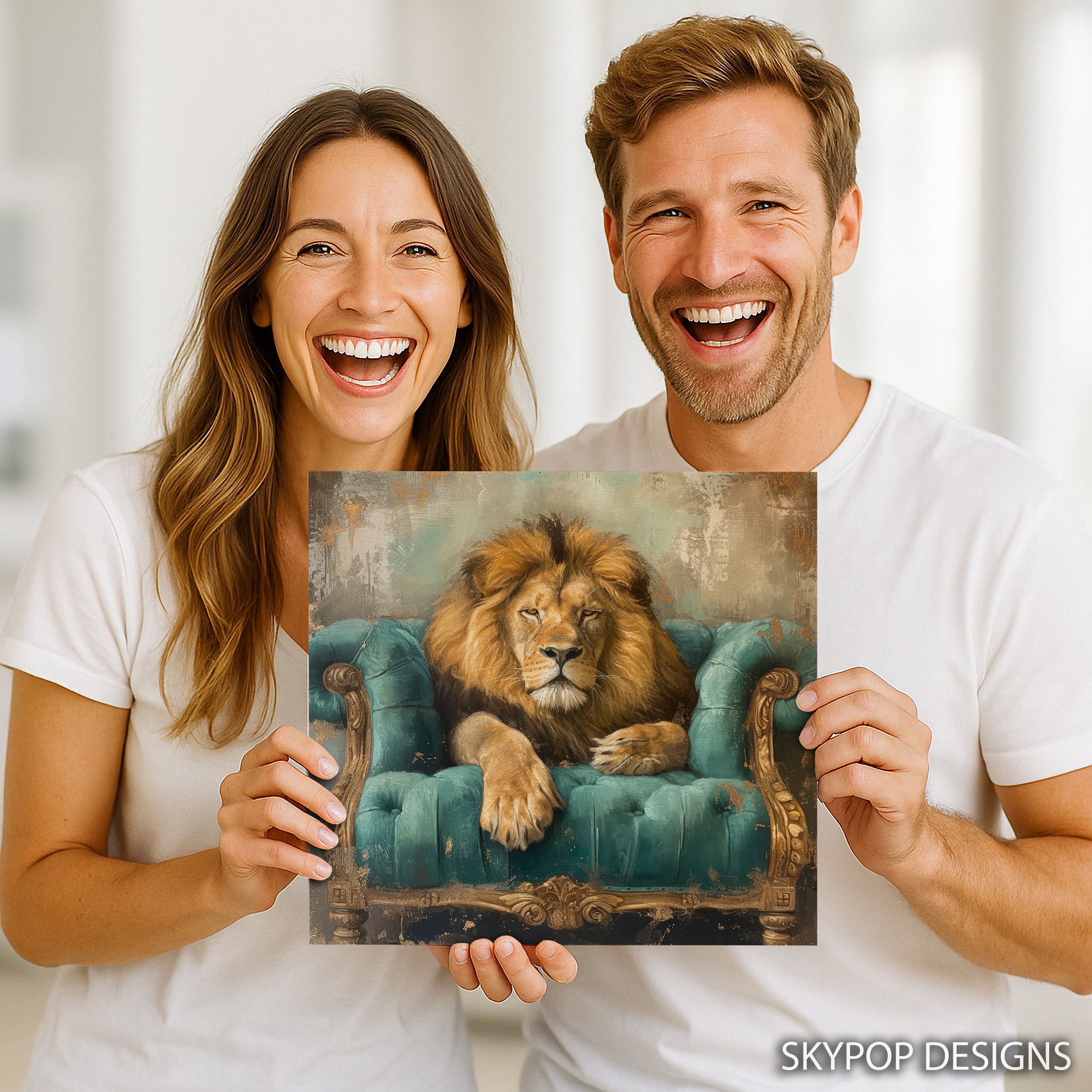 Keywords: Contemporary art, Figurative art, Nature art, Glam decor, Modern decor, Traditional decor, Living room art, Bedroom art, Office art, Guest room decor, Teal wall art, Brown art, Gold accents, Black art, Lion art, Animal wall art, Regal lion, Velvet couch art, Canvas wall art, Wall art print, Luxury home decor, Statement art, Sophisticated art, Powerful art, Inspiring art, Gift for animal lovers, Gift for nature lovers, Home decor, Fine art print, Majestic lion art
