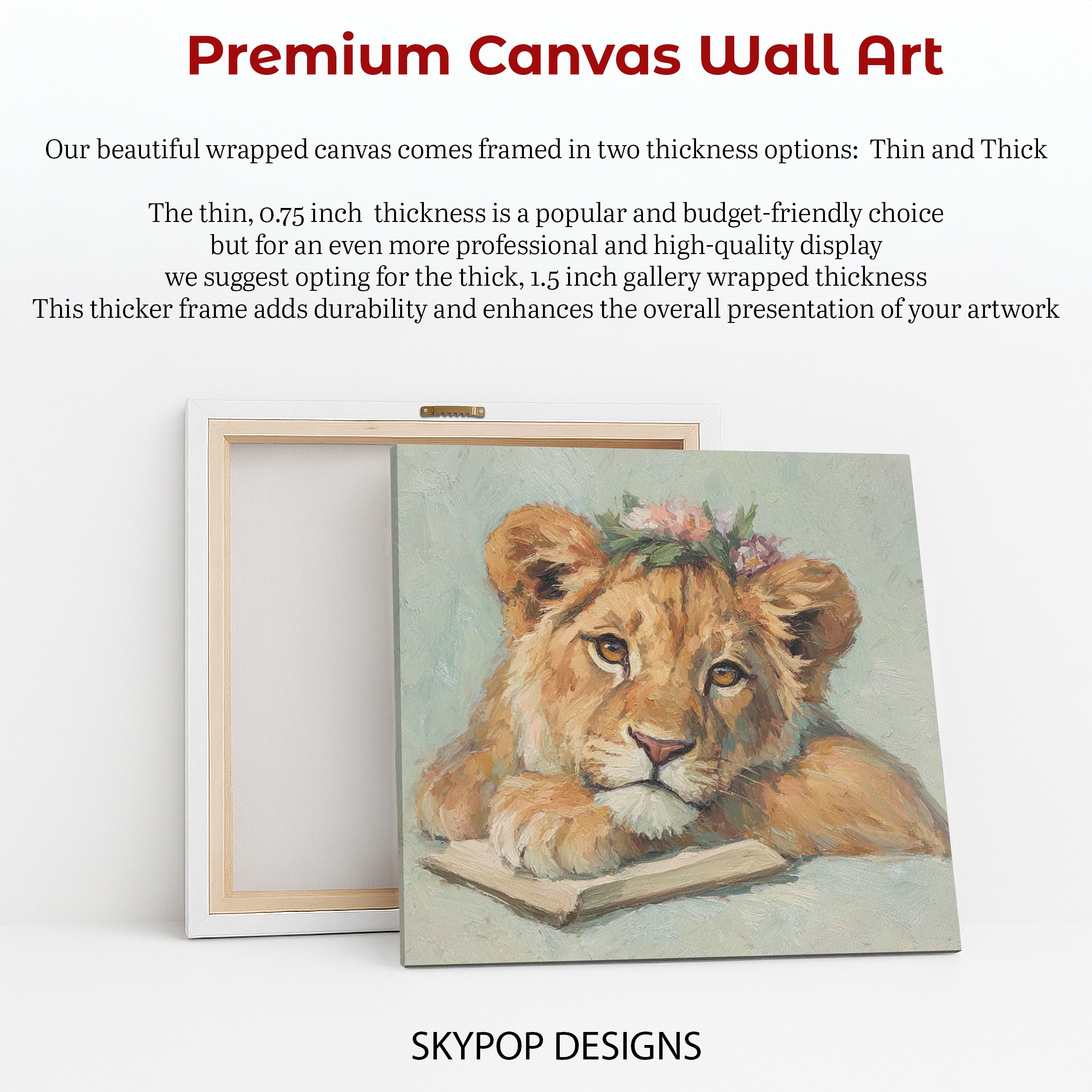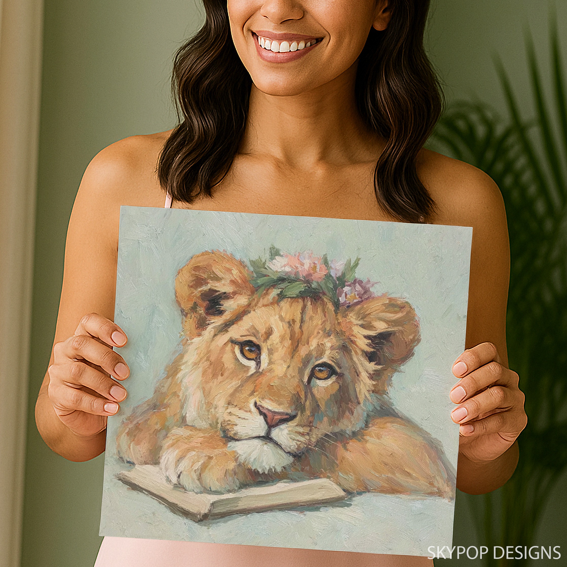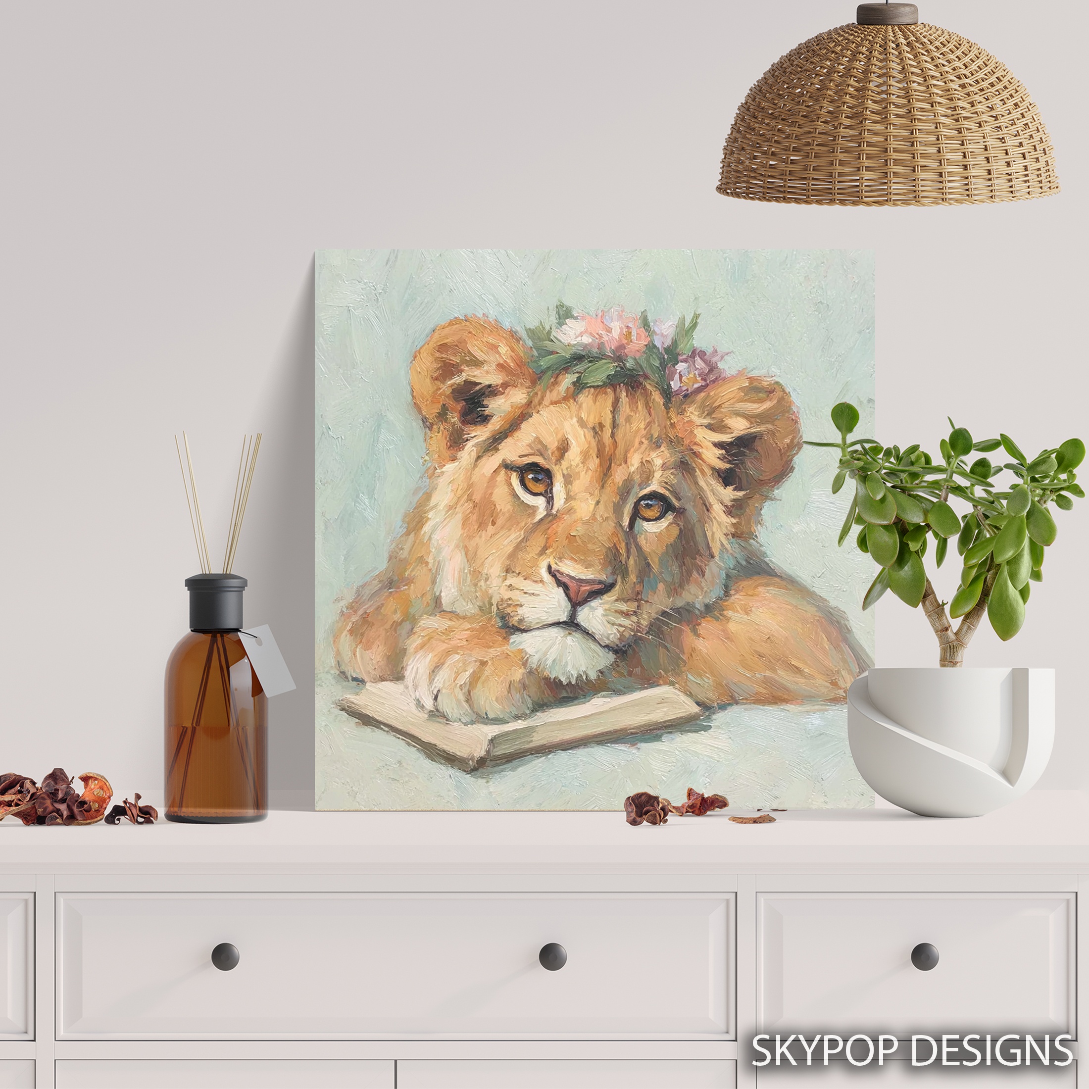 Bring a touch of whimsy to your space with this charming lion canvas wall art. This unique piece features a young lion cub wearing a delicate floral crown while resting its paws on an open book. Perfect for animal lovers and book enthusiasts alike, this poster transforms any room into a cozy reading nook. The soft, earthy color palette of browns and greens, accented with gentle pinks, creates a warm and inviting atmosphere. Ideal for modern living rooms, bohemian bedrooms, or children’s reading corners, this canvas art adds character and imagination to your walls. The lion’s expressive eyes and fluffy mane are captured in stunning detail, making this piece a captivating focal point. Whether you’re decorating a home office, nursery, or library, this versatile artwork fits seamlessly into various decor styles. The combination of a fierce animal with delicate flowers and a book creates an intriguing contrast, sparking conversation and imagination. Gift this enchanting lion art to book lovers, new parents, or anyone who appreciates quirky animal portraits. Available in multiple sizes, this high-quality canvas print ensures vibrant colors and crisp details that will last for years. Elevate your home decor with this playful and sophisticated lion art that celebrates the joy of reading and the beauty of nature.