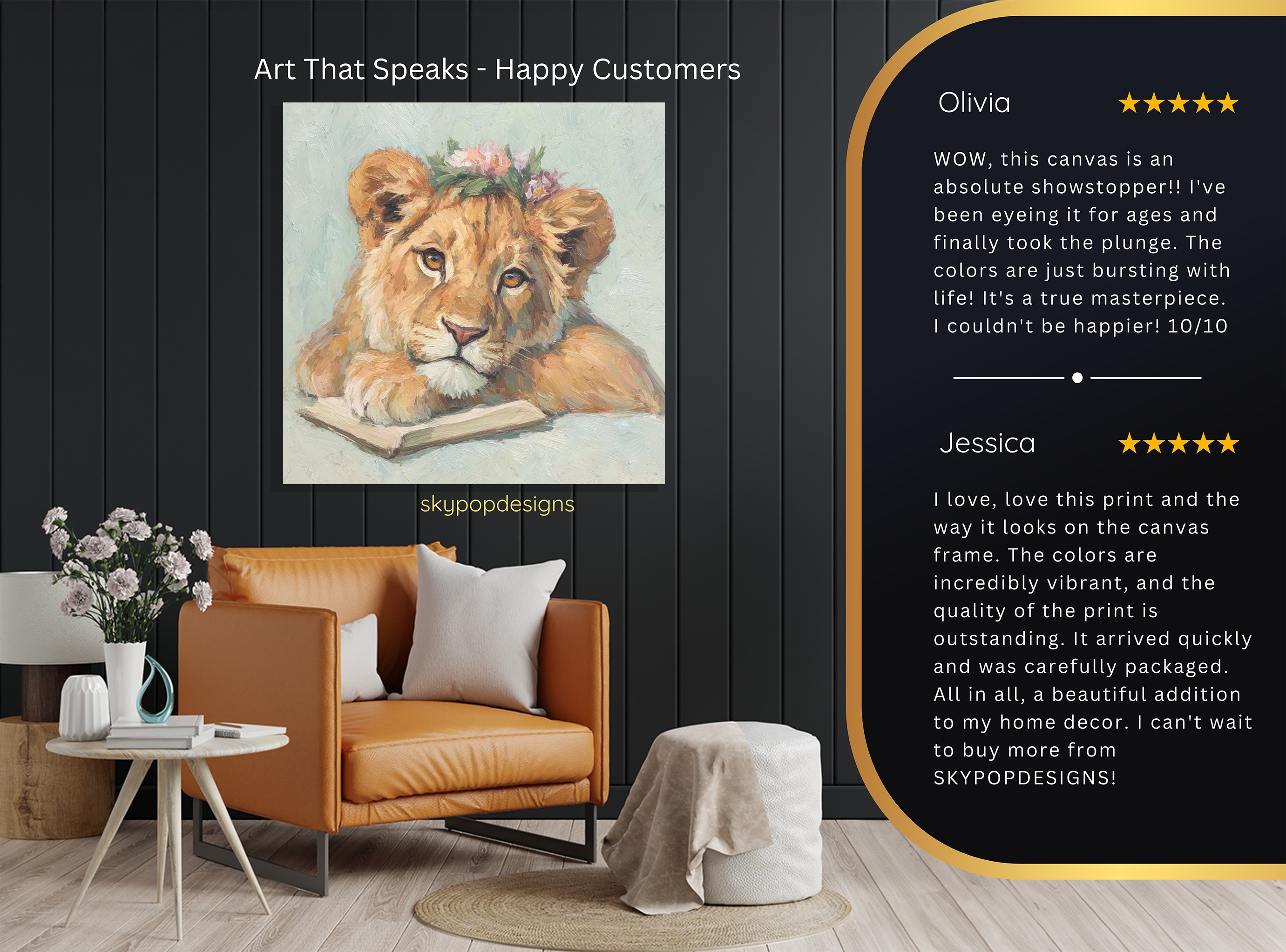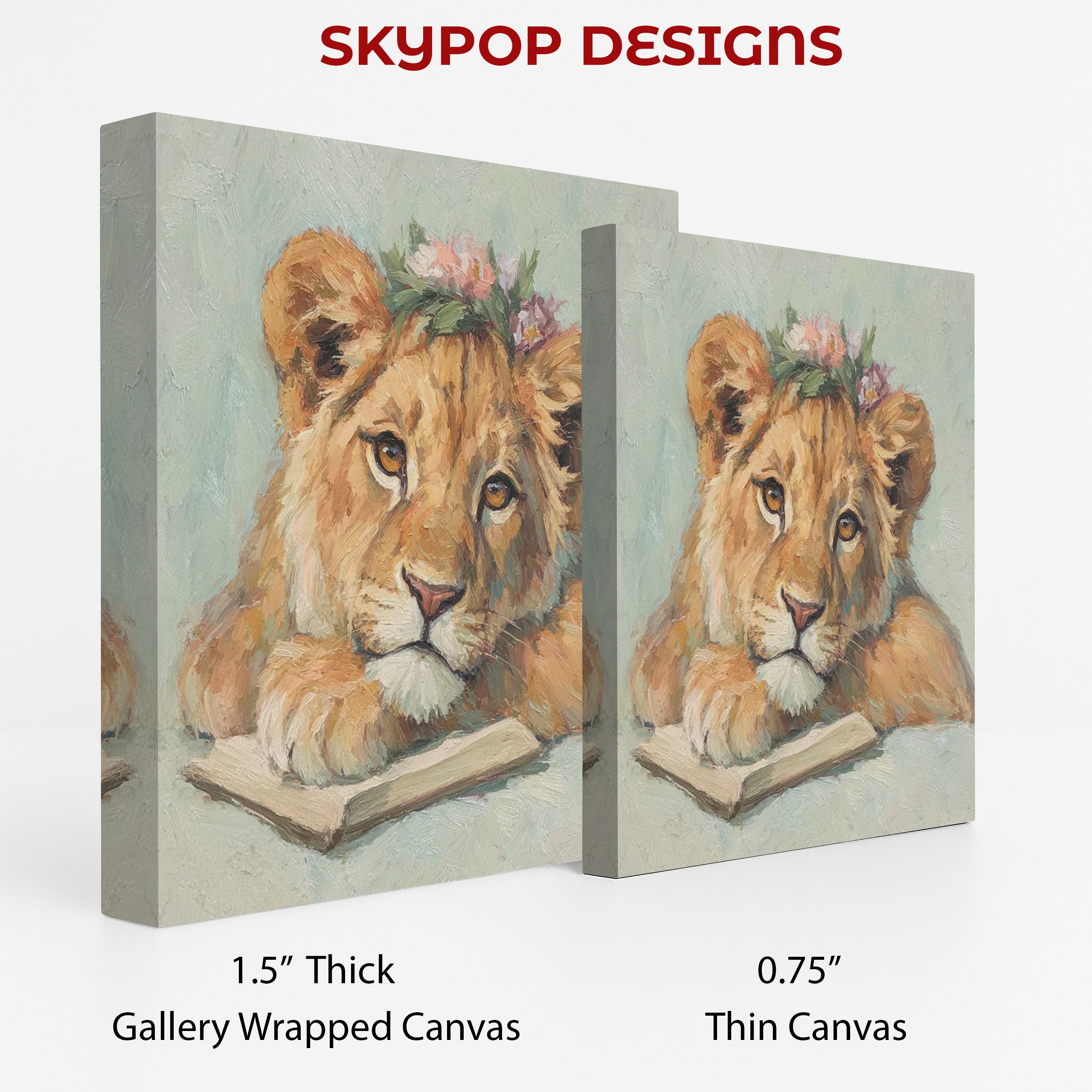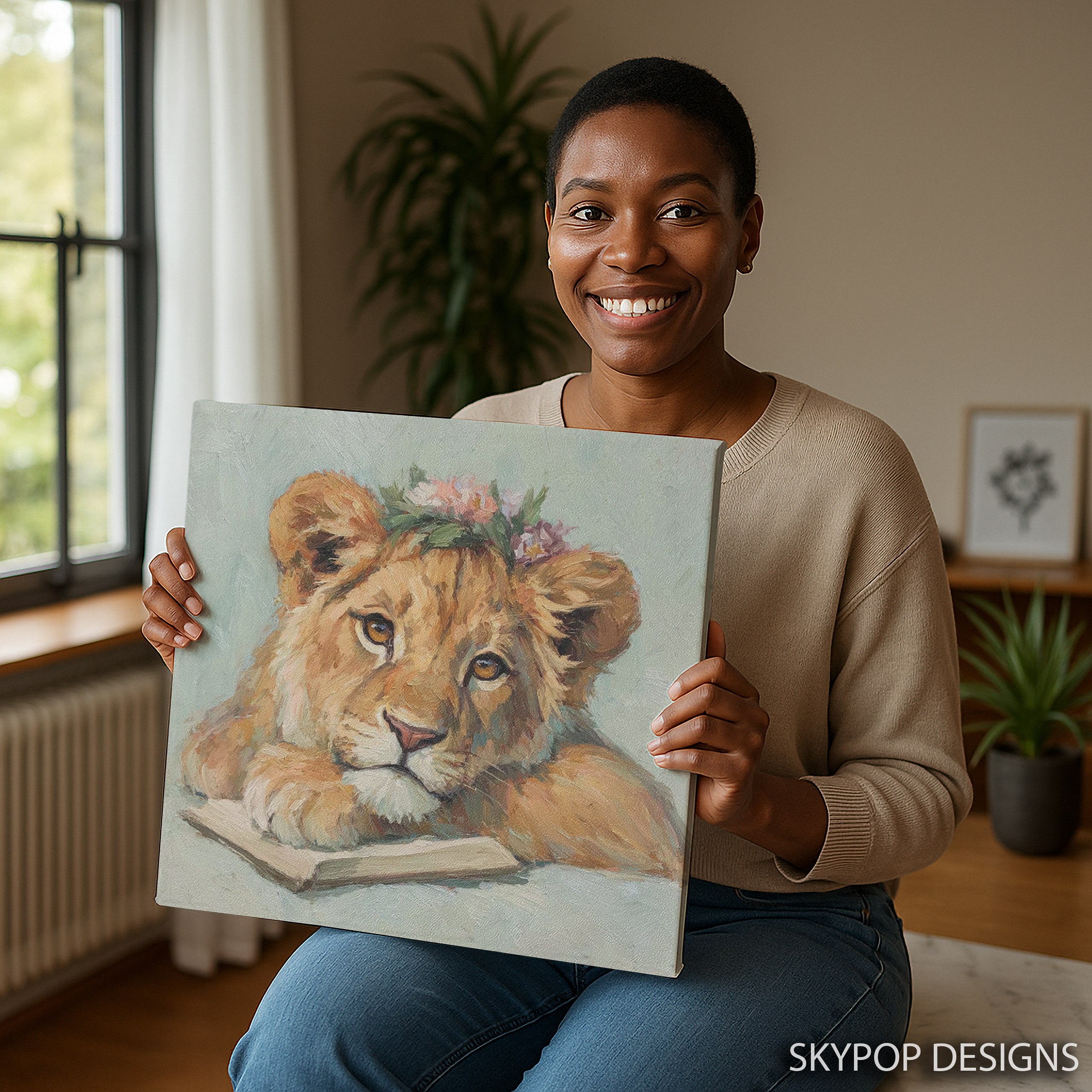 Bring a touch of whimsy to your space with this charming lion canvas wall art. This unique piece features a young lion cub wearing a delicate floral crown while resting its paws on an open book. Perfect for animal lovers and book enthusiasts alike, this poster transforms any room into a cozy reading nook. The soft, earthy color palette of browns and greens, accented with gentle pinks, creates a warm and inviting atmosphere. Ideal for modern living rooms, bohemian bedrooms, or children’s reading corners, this canvas art adds character and imagination to your walls. The lion’s expressive eyes and fluffy mane are captured in stunning detail, making this piece a captivating focal point. Whether you’re decorating a home office, nursery, or library, this versatile artwork fits seamlessly into various decor styles. The combination of a fierce animal with delicate flowers and a book creates an intriguing contrast, sparking conversation and imagination. Gift this enchanting lion art to book lovers, new parents, or anyone who appreciates quirky animal portraits. Available in multiple sizes, this high-quality canvas print ensures vibrant colors and crisp details that will last for years. Elevate your home decor with this playful and sophisticated lion art that celebrates the joy of reading and the beauty of nature.