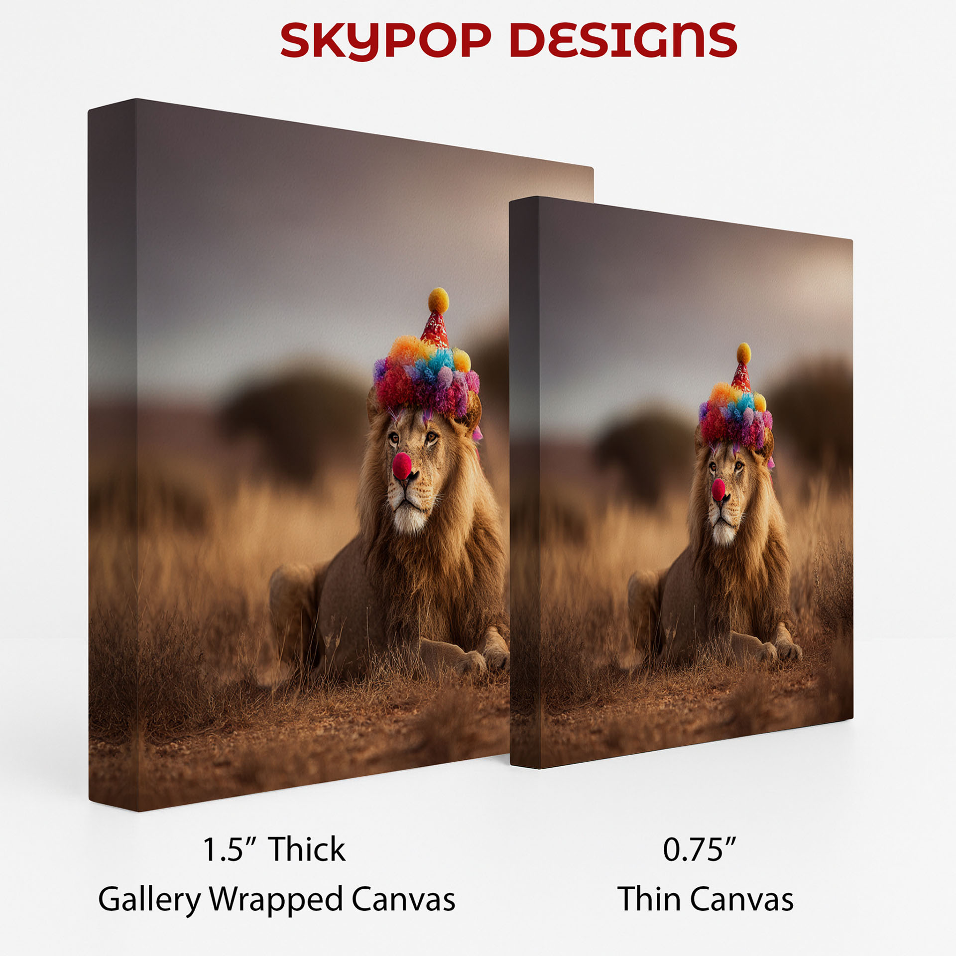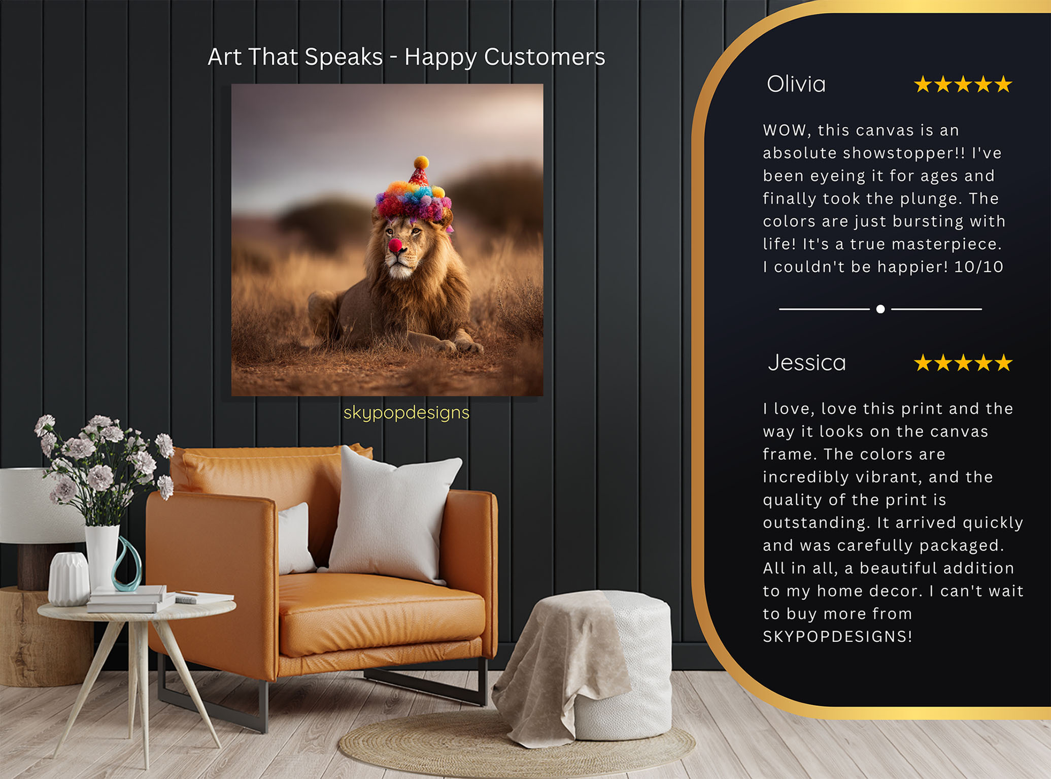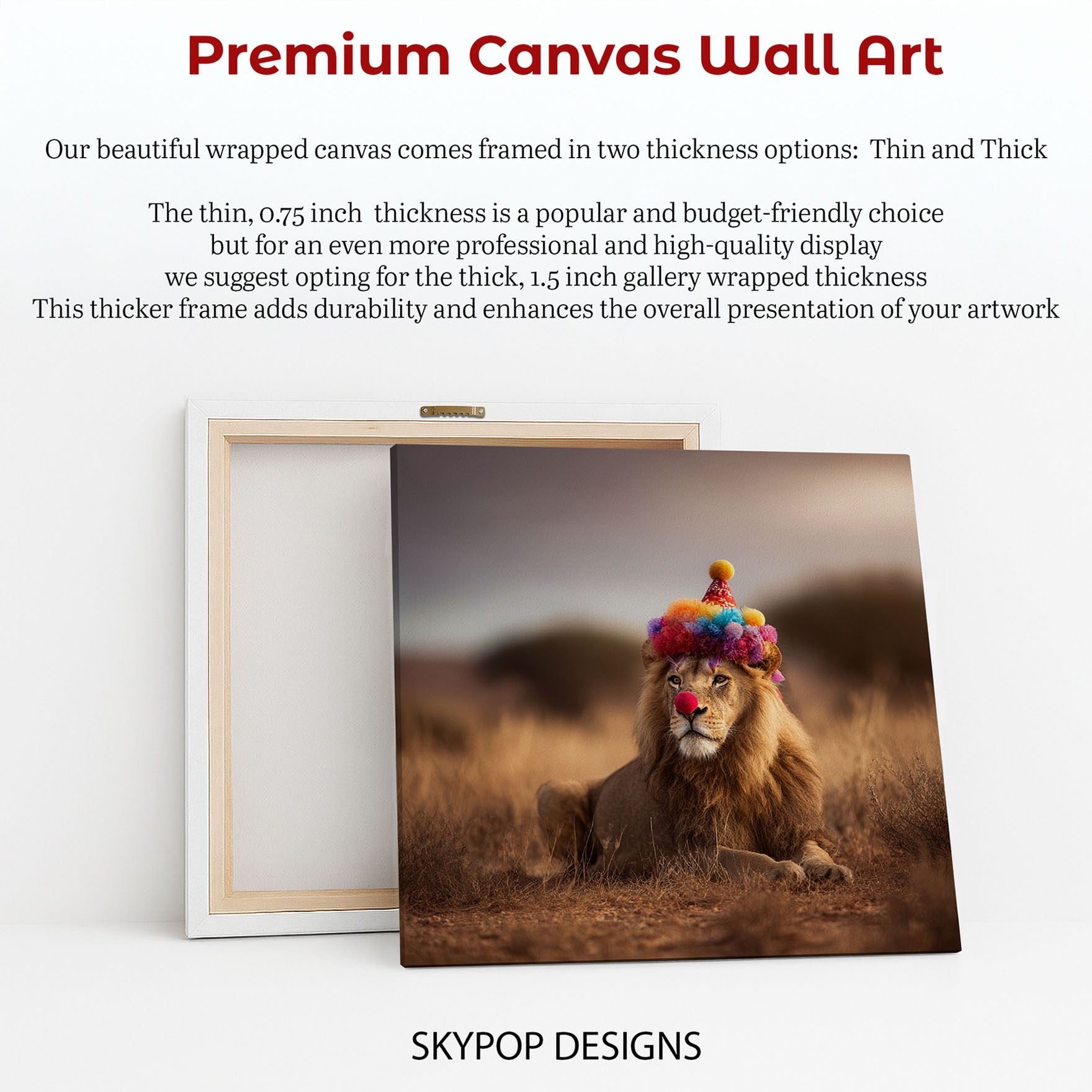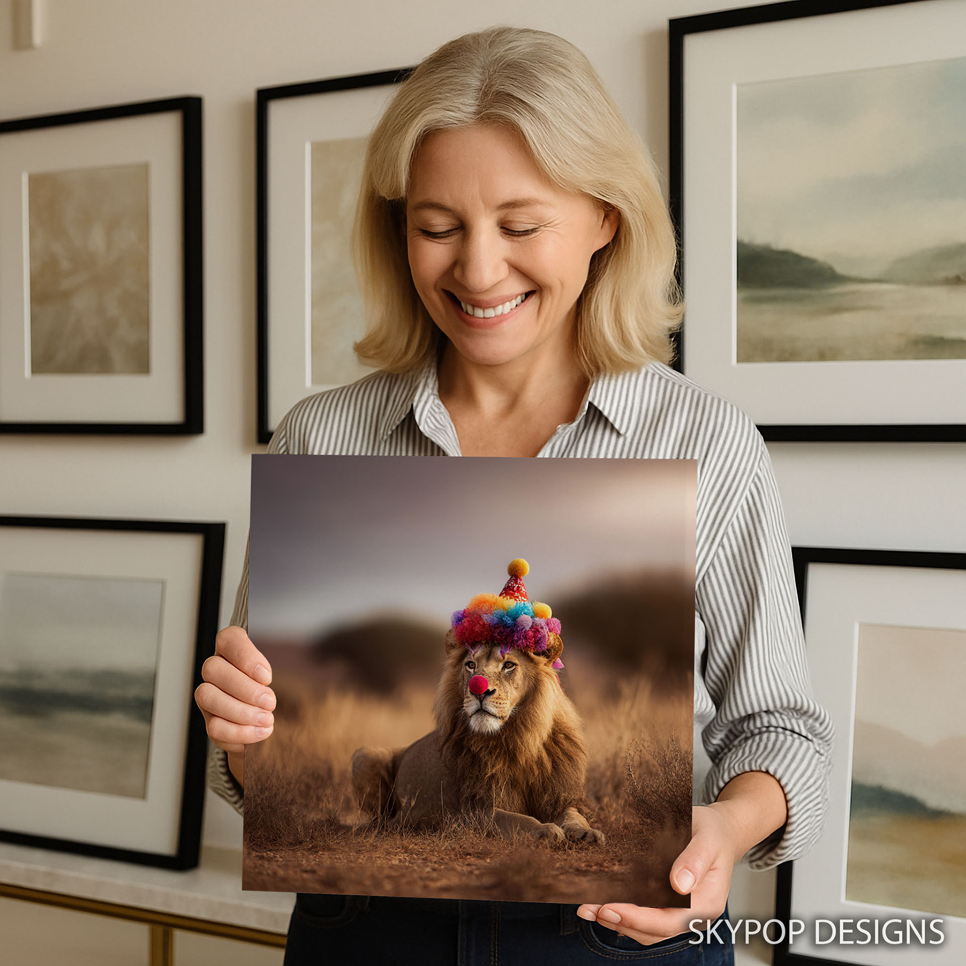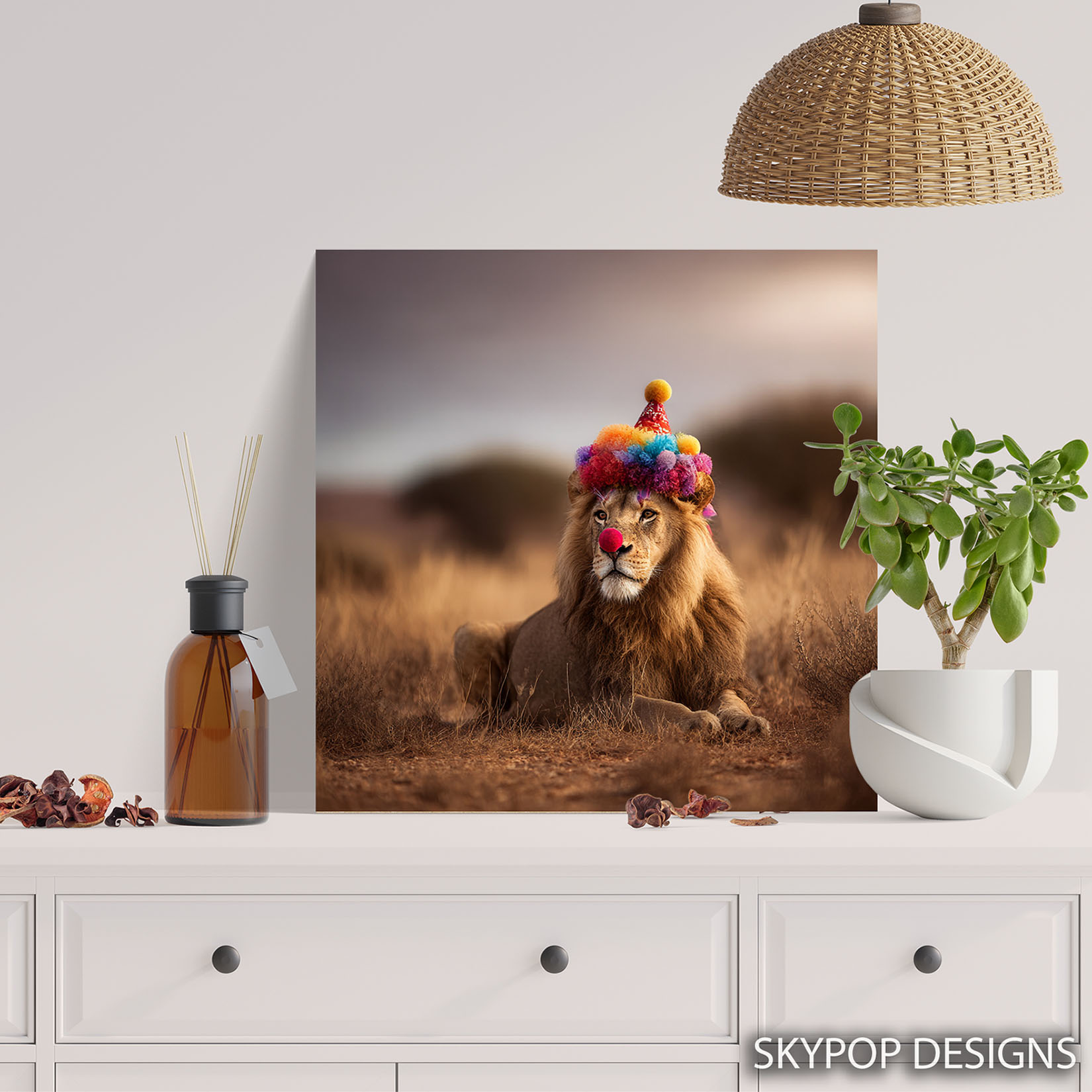 Bring a smile to your face with this whimsical lion canvas wall art, featuring a majestic lion sporting a vibrant clown costume. This eye-catching poster or canvas wall art transforms any space into a playful and unique environment. The striking colors of the clown wig and red nose pop against the lion’s warm tones, creating a captivating visual that embodies joyful expression. Perfect for contemporary living rooms or fun game rooms, this animal art piece is sure to be a conversation starter. It introduces a touch of whimsical decor to bohemian settings and adds a surprising element to modern interiors. The detail in the lion’s mane and expressive eyes, combined with the playful costume, makes this a truly memorable piece of art. Ideal for children’s rooms, this canvas wall art sparks imagination and happiness, while its unique nature also suits adult spaces seeking to add personality. This poster is also a fantastic gift idea for birthdays or housewarmings, offering a unique way to celebrate someone’s fun-loving spirit. High-quality printing ensures the rich colors and textures are preserved, making this lion canvas art a lasting addition to your decor. Elevate your home with this joyful and bold artwork that captures a moment of delightful absurdity. Make a statement with this unique lion wall art and let the roaring laughter fill your room. Transform your home today with this unforgettable piece of animal art.
