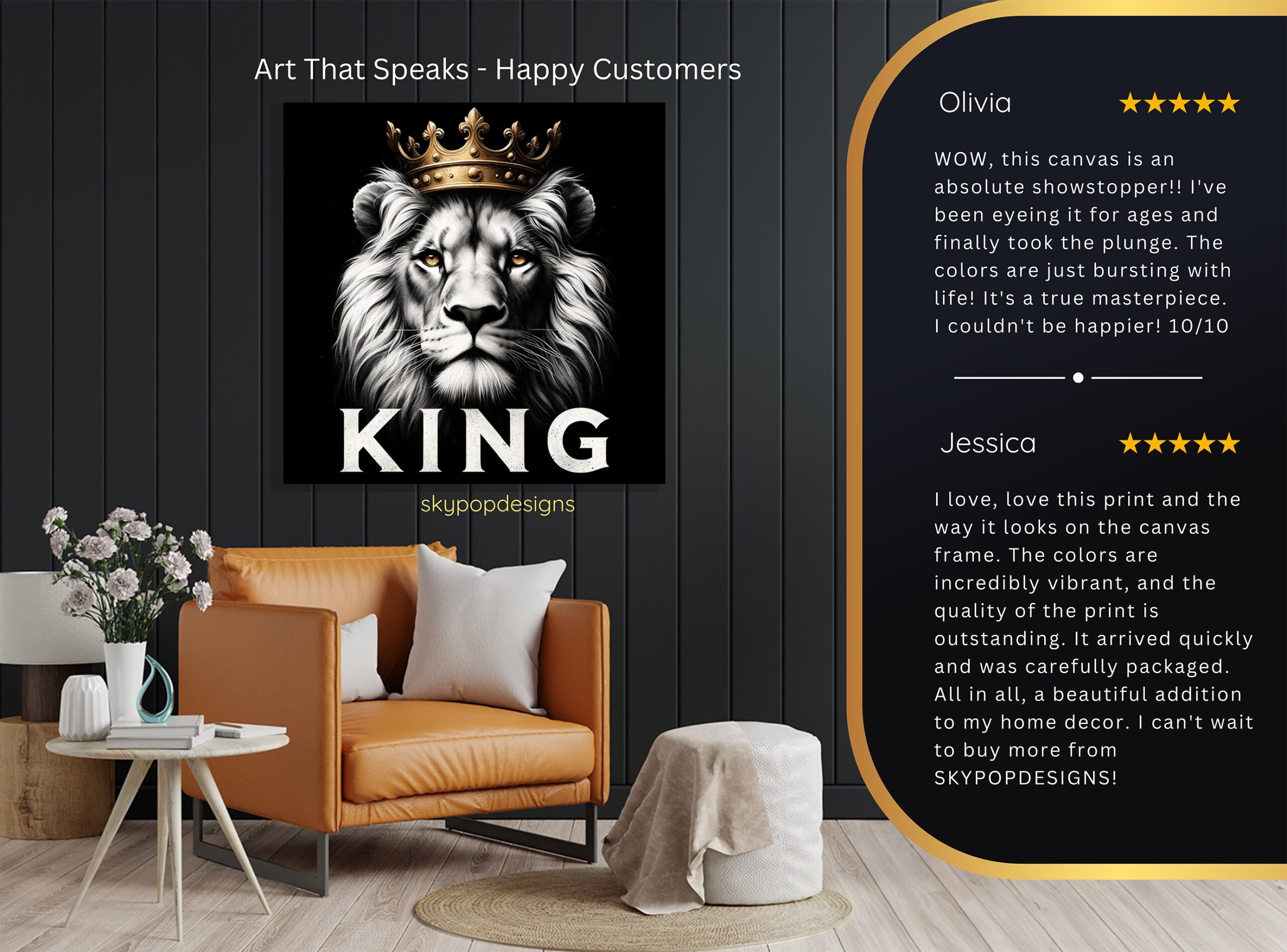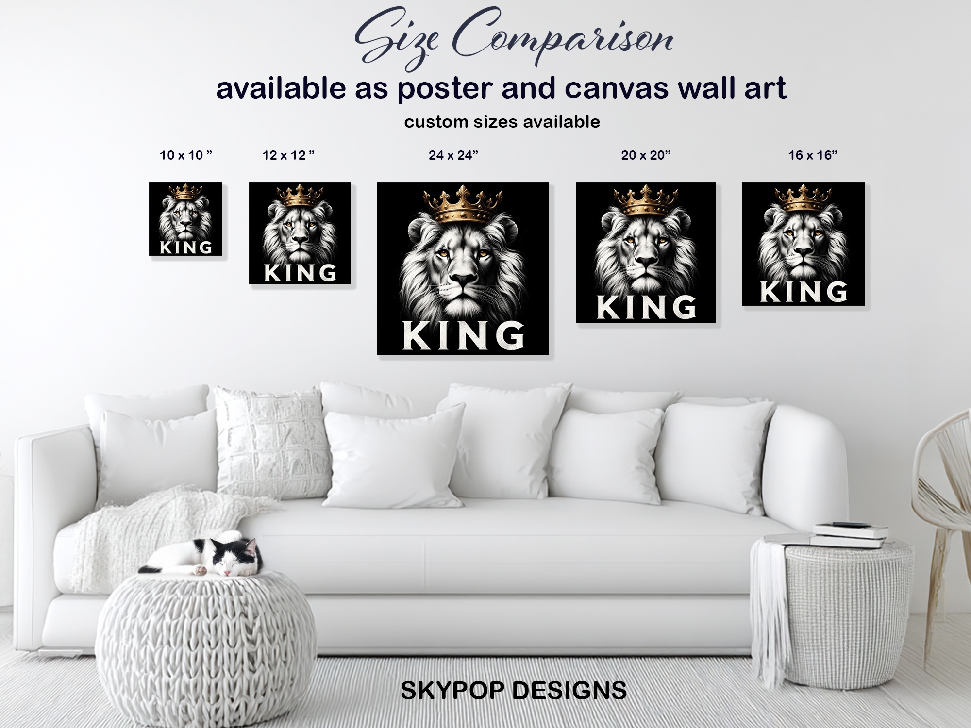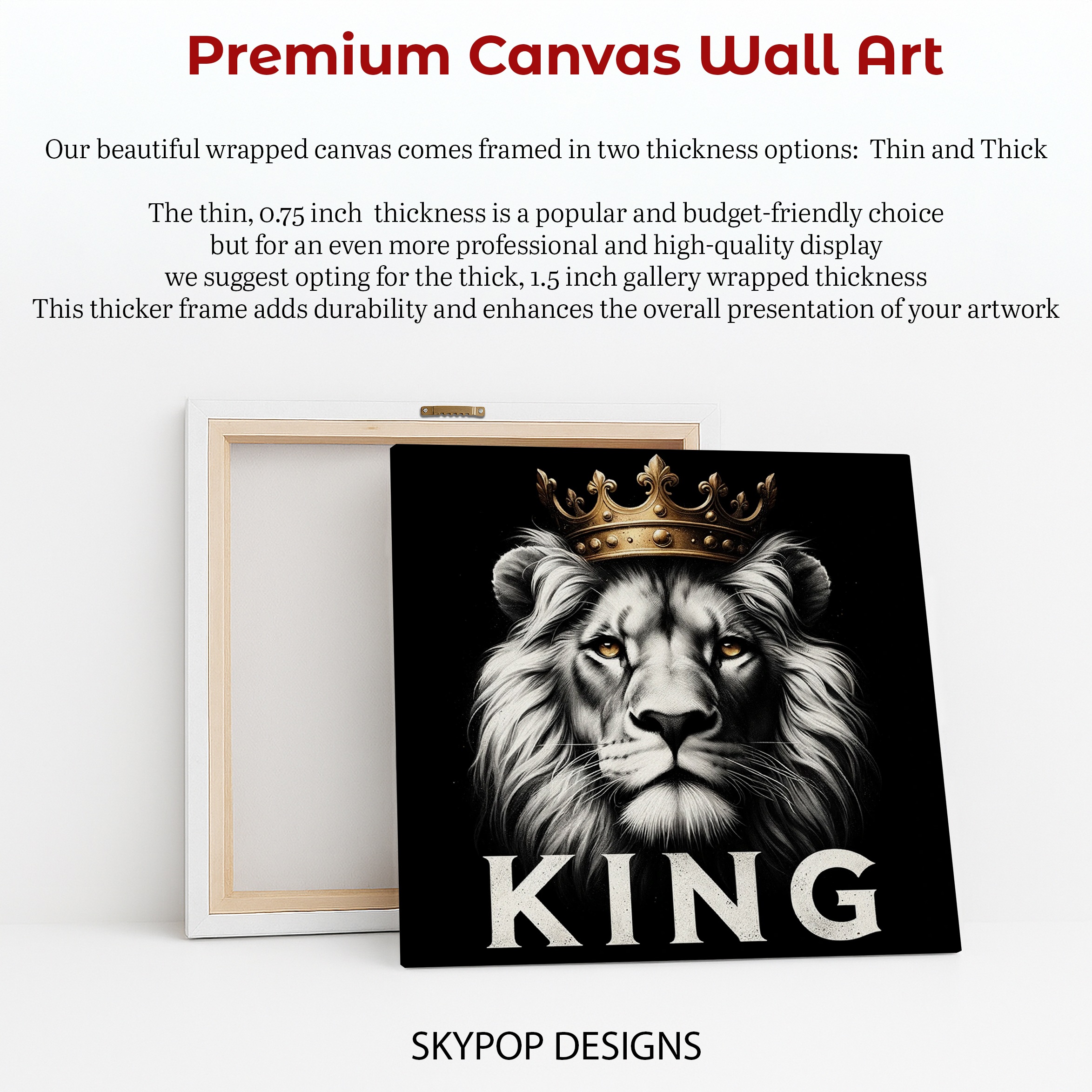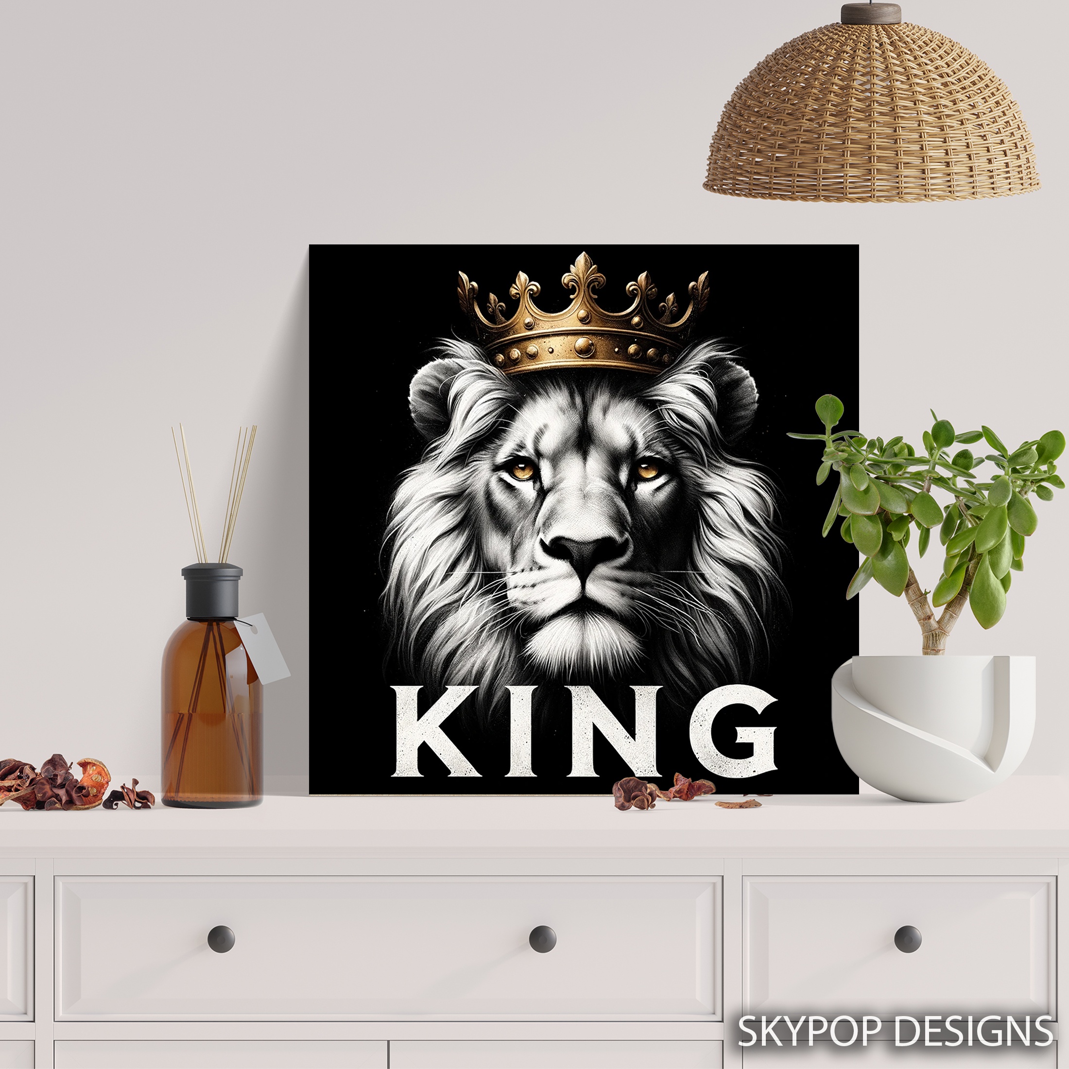 Elevate your space with this striking lion canvas wall art featuring a majestic lion wearing a golden crown. This powerful poster combines regal imagery with modern design, creating an instant focal point for any room. Perfect for contemporary living rooms or bold office decor, this canvas art piece exudes strength and authority. The contrasting black and white lion portrait with piercing golden eyes captivates viewers, while the shimmering crown adds a touch of luxury. Ideal for those who love animal-inspired wall decor with a twist, this artwork symbolizes leadership and confidence. The detailed fur textures and intense gaze of the lion bring depth and character to your walls, making it a conversation starter in any setting. Great as a motivational piece for a home office or as statement art in a modern bedroom, this lion king poster adapts to various interior styles. High-quality printing ensures every whisker and crown detail pops, whether you choose a canvas or poster format. The bold “KING” typography anchors the composition, reinforcing the theme of power and royalty. Transform your space with this eye-catching blend of nature and urban sophistication. Whether you’re a lion lover or simply drawn to impactful wall art, this piece commands attention and admiration. Add a touch of majesty to your home decor collection today with this unforgettable lion king canvas art.