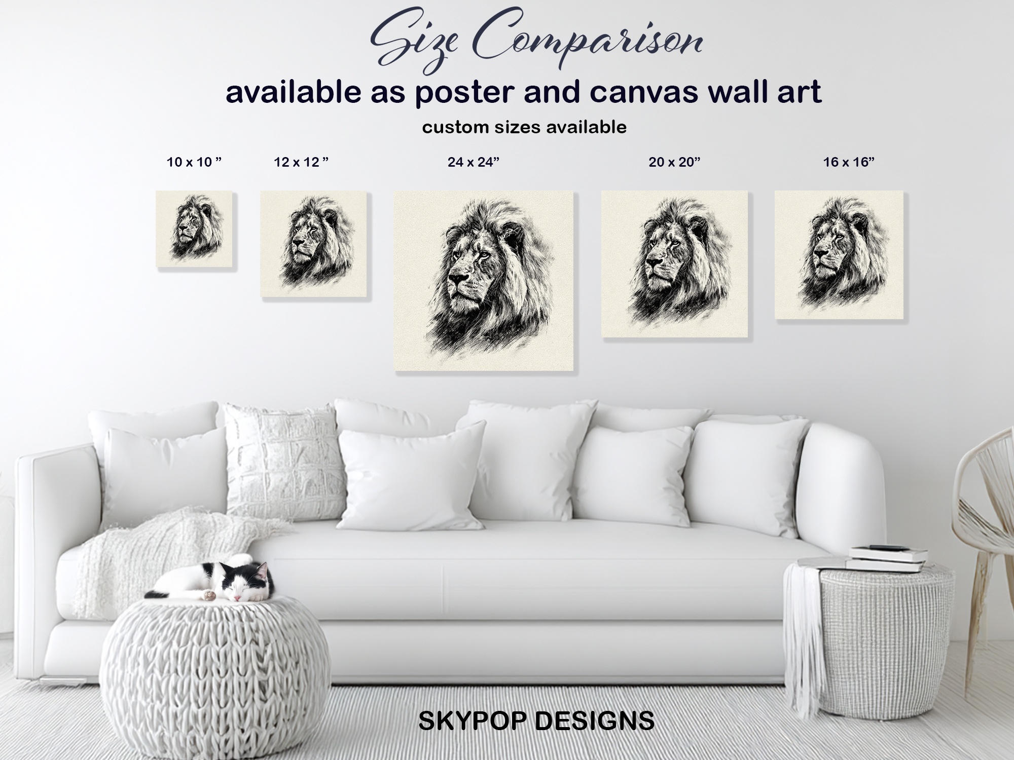 Bring the power and majesty of the wild into your home with this striking lion portrait canvas wall art. This captivating black and white poster showcases the regal face of a lion, its piercing gaze and majestic mane rendered in exquisite detail. Perfect for modern living room wall decor or as a statement piece in a minimalist office, this lion canvas art commands attention and respect. The intricate line work and subtle shading create a sense of depth and texture, making the lion’s features come alive on your wall. Ideal for nature enthusiasts and animal lovers, this lion wall art adds a touch of wilderness to any space. The monochromatic palette ensures versatility, complementing a wide range of interior styles from rustic to contemporary. Whether displayed as a standalone piece or as part of a gallery wall, this lion poster elevates your decor with its raw power and timeless appeal. The high-quality printing captures every whisker and fur detail, ensuring a stunning visual impact from any angle. Transform your bedroom, dining room, or living area with this bold and sophisticated lion canvas that sparks conversation and admiration. Make a statement in your home or give a memorable gift that celebrates the beauty of the animal kingdom. Enhance your space today with this awe-inspiring lion wall art that brings the spirit of the savannah into your everyday life.