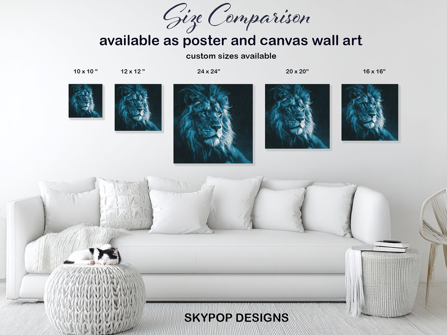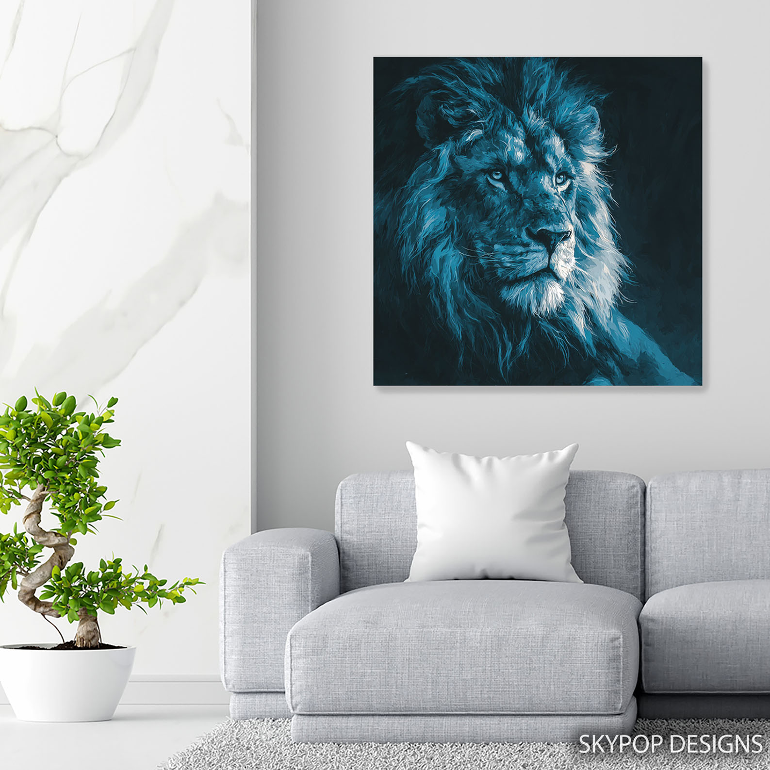 Lion Portrait Art, Canvas or Poster, Contemporary Minimalist Glam Decor, Living Room Bedroom Office Entryway Wall Art, Blue Black White Teal