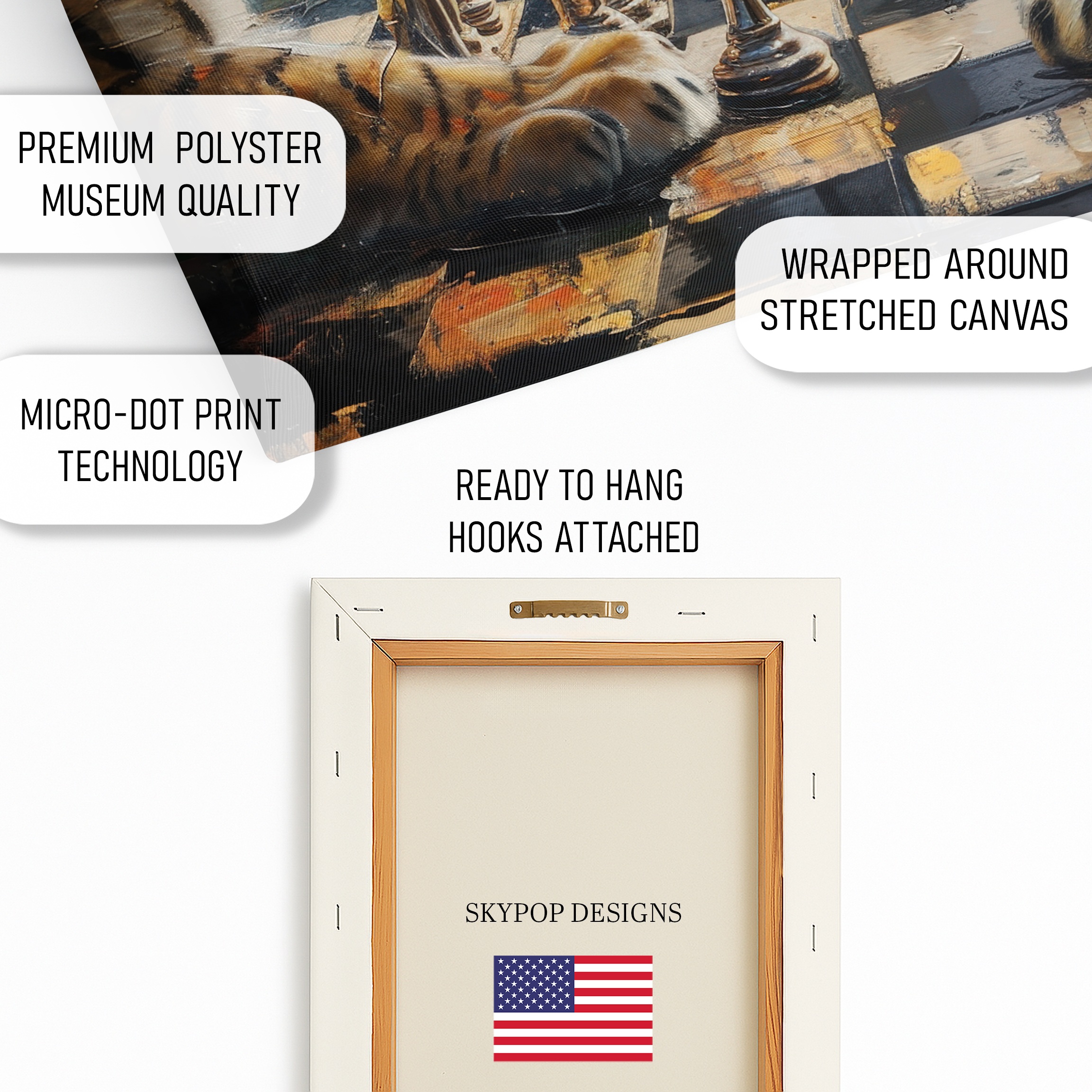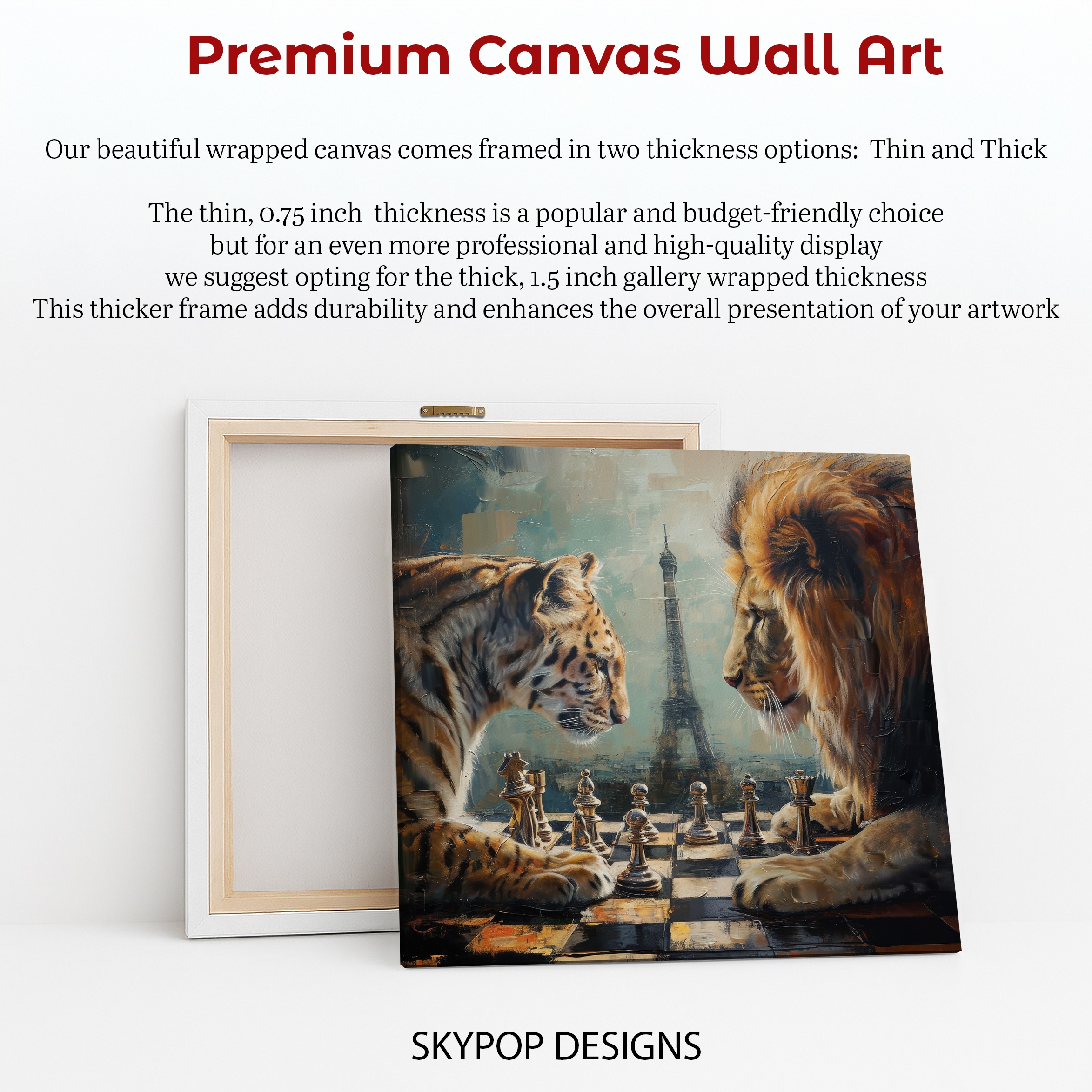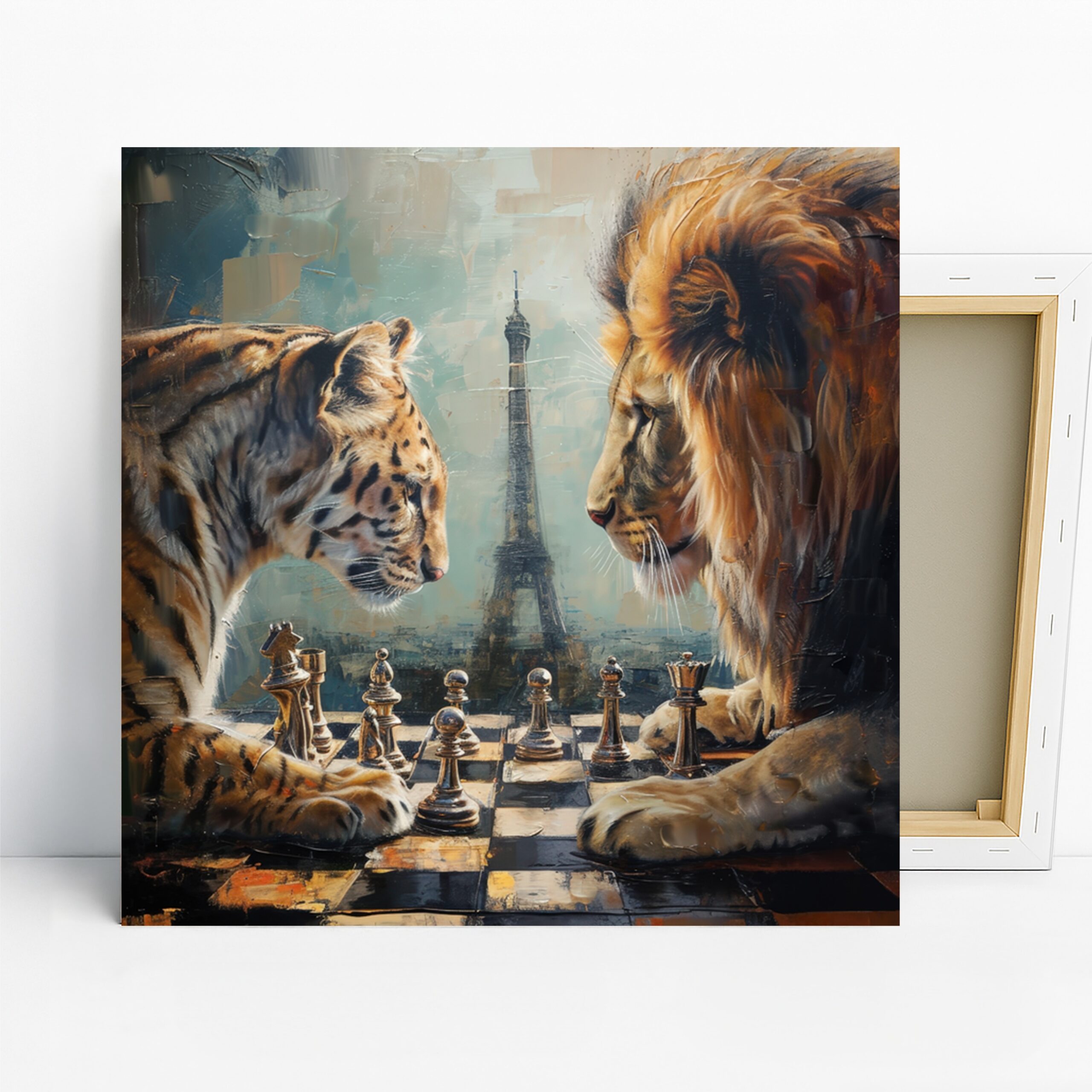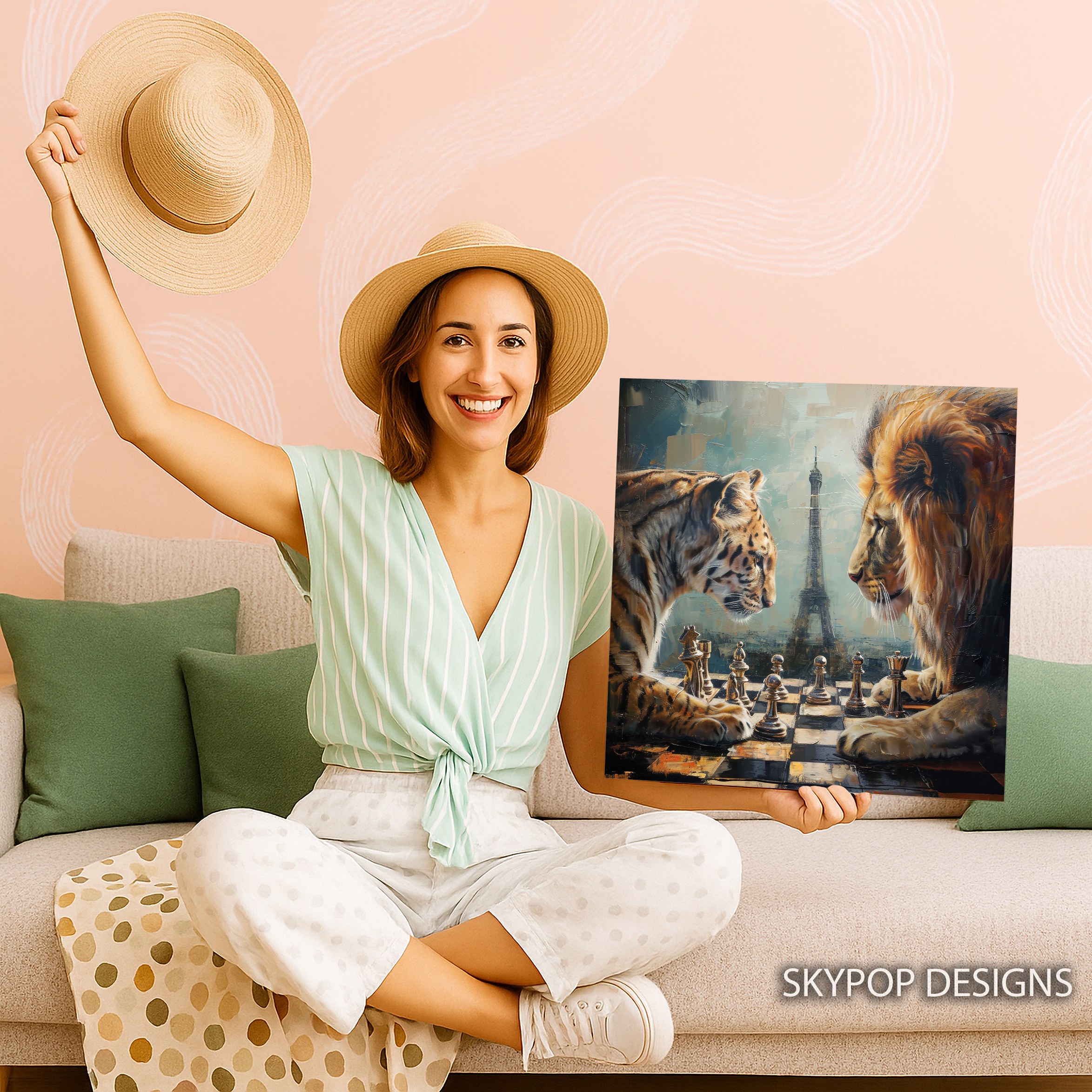 Transform your space with this captivating lion and tiger canvas wall art, showcasing a dramatic chess match with the Eiffel Tower in the background. This striking piece of contemporary animal art elevates any room, acting as a bold statement for modern living rooms or sophisticated offices. The rich, warm tones and textural brushstrokes create a sense of depth and power, making this poster a true conversation starter. Perfect for those who appreciate impactful wall decor or unique gifts for birthdays or housewarmings. The interplay of light and shadow on the animals and the dramatic cityscape enhances the powerful mood. This vibrant canvas wall art blends abstract elements with striking figurative art, offering a unique perspective on nature’s grandeur. Ideal for modern or glamorous decor styles, it adds an element of drama and intrigue to your home. The detailed depiction of the chess pieces and the animals’ intense focus makes this a compelling piece. This wall art is perfect for creating an elevated atmosphere in your game room or as striking decor for your entryway. Experience the allure of this unique artwork that captures a moment of strategic brilliance and wild power. Elevate your interior design with this stunning blend of urban and natural elements, a true masterpiece of canvas wall art that inspires. Bring the majestic fusion of the jungle and the city into your home for a truly unforgettable look. Discover the art that speaks volumes about strategy, power, and iconic locations.