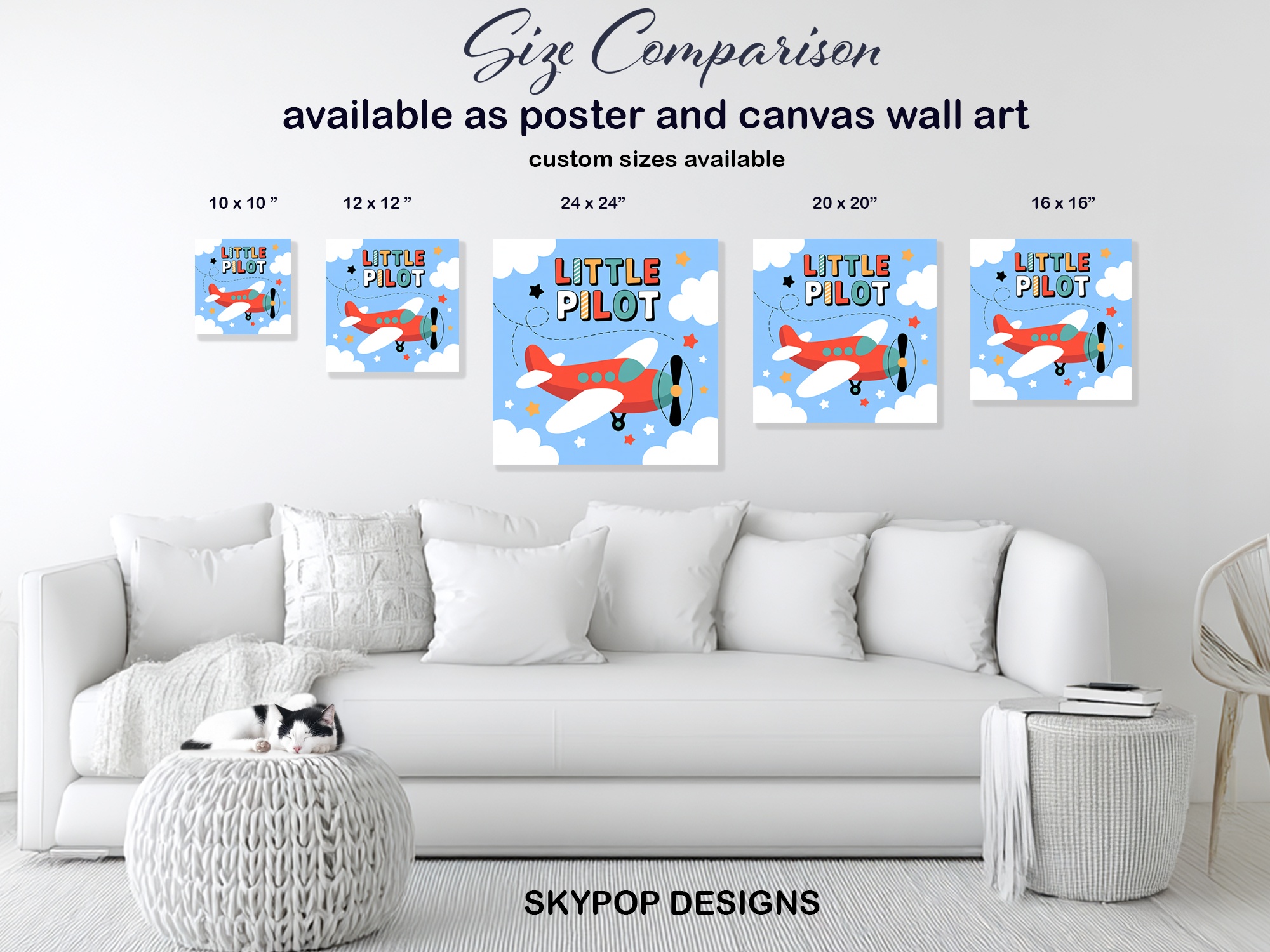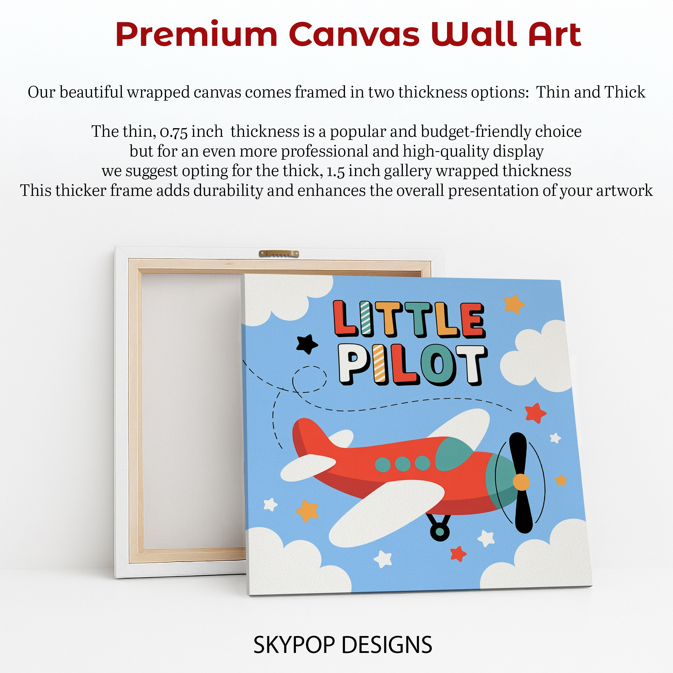 Take flight with this adorable “Little Pilot” canvas wall art, perfect for inspiring young adventurers! This charming poster features a vibrant red cartoon airplane soaring through a clear blue sky, surrounded by fluffy white clouds and twinkling stars. The playful, retro-inspired design captures the imagination and adds a pop of color to any room. Ideal for modern nurseries or contemporary children’s bedrooms, this whimsical artwork creates a focal point that grows with your child. The bold, chunky letters spelling out “LITTLE PILOT” in a mix of bright colors add a fun, educational element to the piece. This canvas art isn’t just decorative – it can spark conversations about aviation, travel, and dreams of flying. The minimalist yet engaging style makes it a versatile addition to various decor themes, from aviation-inspired rooms to general playful spaces. High-quality printing ensures every detail, from the plane’s propeller to the dotted flight path, stands out beautifully. Whether you’re preparing for a new arrival or updating a toddler’s room, this Little Pilot art print offers the perfect blend of childhood wonder and modern design. Give the gift of imagination with this delightful airplane-themed wall art, or use it to complete your own little pilot’s dream room. Transform your space with this cheerful and inspiring piece that celebrates the joy of childhood and the thrill of adventure!