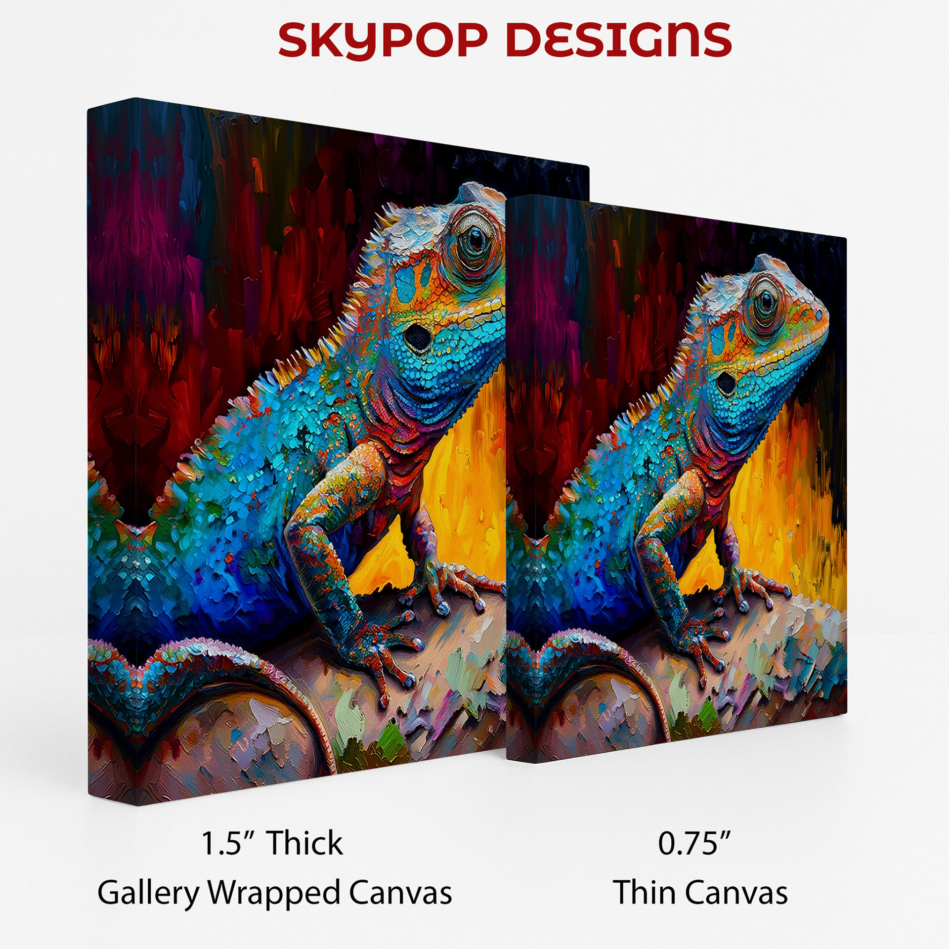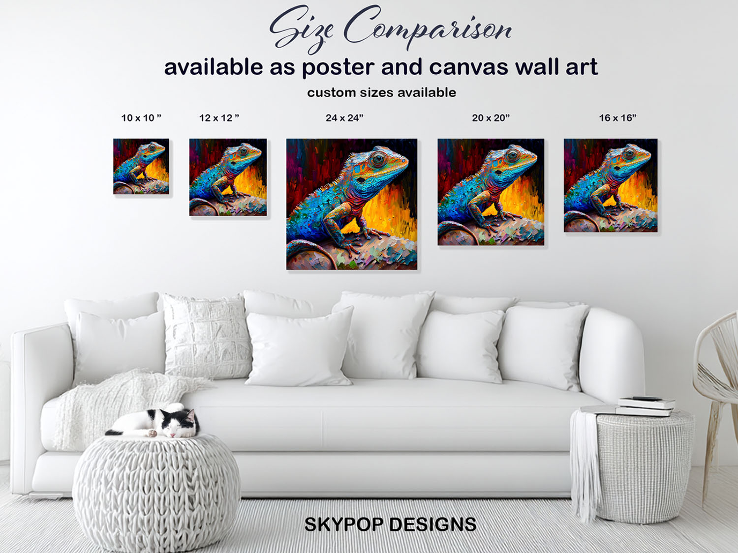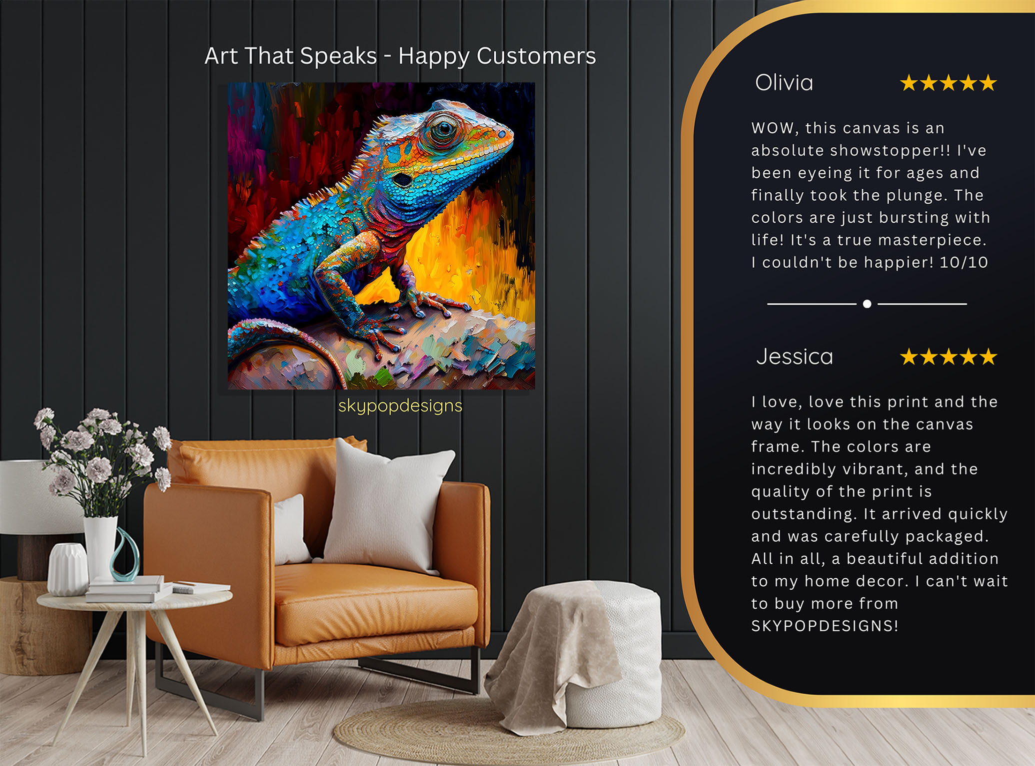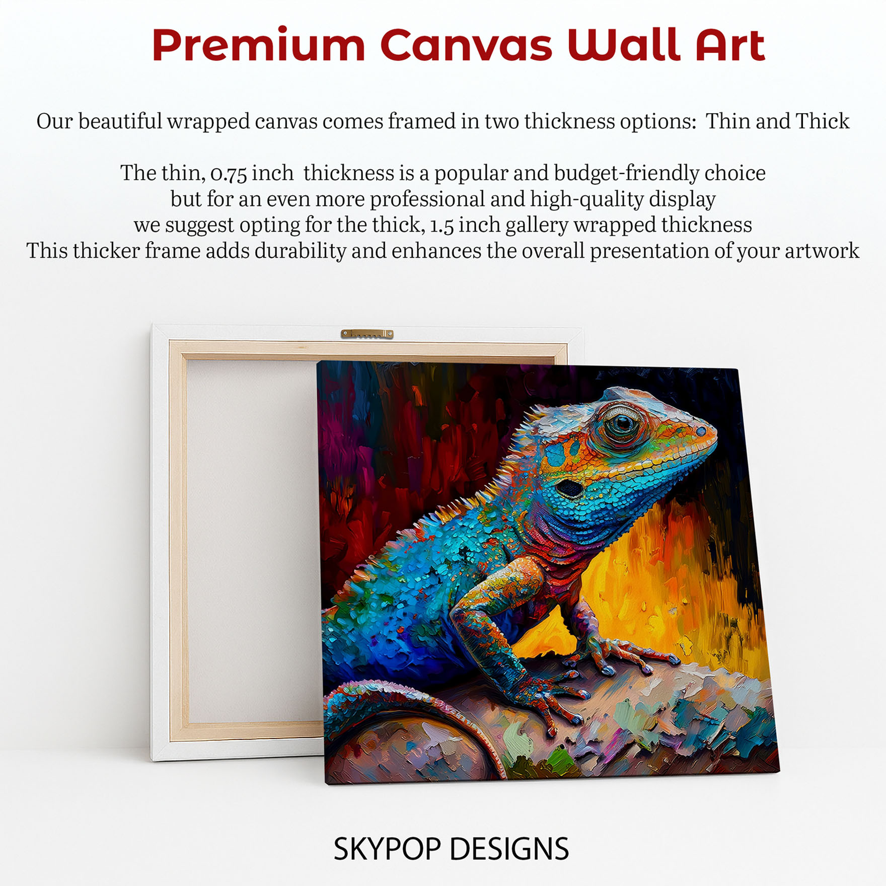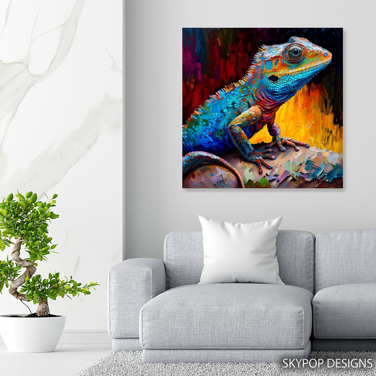 Introduce a burst of color and life into your home with this electrifying lizard canvas wall art. This striking poster or canvas wall art features a vibrantly hued lizard set against a background of rich, textured paint strokes, creating a truly captivating focal point. The contemporary art style and bold multicolor palette inject modern energy into any space, making it perfect for living rooms, offices, or bedrooms. This animal art piece is ideal for bohemian decor enthusiasts looking to add a pop of personality and vibrant wall decor. The dynamic interplay of blues, oranges, and teals evokes a sense of wonder and natural beauty, bringing the essence of the wild indoors. High-quality printing on premium canvas ensures every intricate detail of the lizard’s scales and expressive eyes is rendered with stunning clarity. This versatile piece works exceptionally well as entryway decor, setting a welcoming and artistic tone for guests. It serves as a fantastic housewarming gift or a unique birthday present for art lovers and nature enthusiasts alike. The vivid colors are known to inspire creativity and uplift moods, transforming your environment into a more stimulating and cheerful place. Elevate your home with this eye-catching lizard canvas wall art that seamlessly blends artistry with the wild. Give your walls a contemporary upgrade with this stunning piece of nature-inspired wall art today.