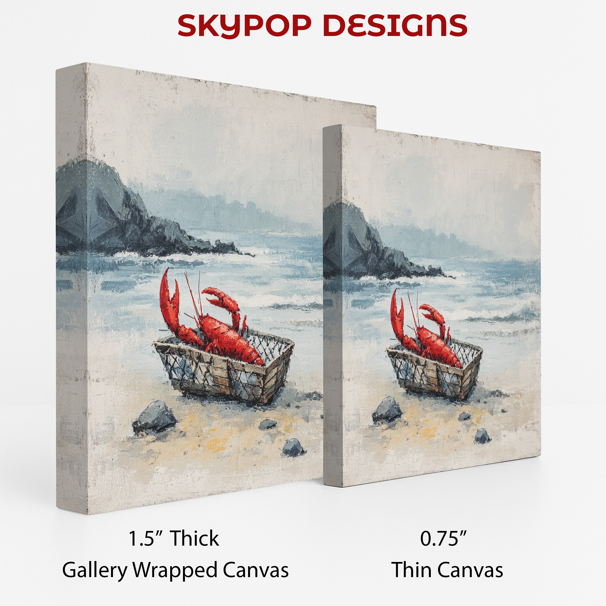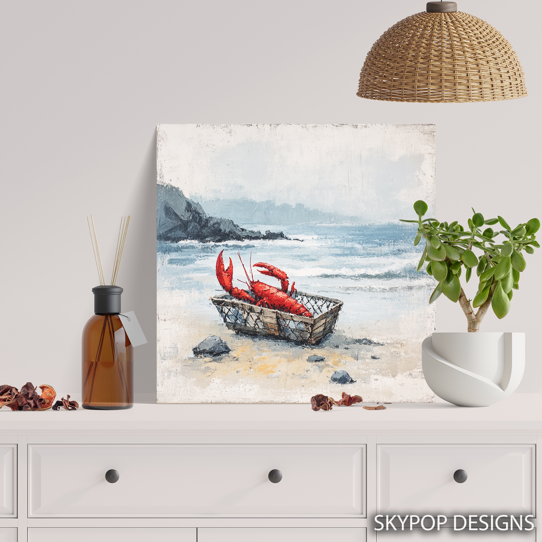 Bring the essence of coastal living into your home with this striking lobster canvas wall art. This contemporary piece captures the charm of a fresh seafood catch, featuring a vibrant red lobster nestled in a rustic wooden basket against a serene coastal backdrop. Perfect for elevating your kitchen decor or adding a touch of maritime flair to your dining room, this poster seamlessly blends nature and still life art. The contrast of the bold red lobster against the muted blue and gray tones of the ocean and sky creates a captivating focal point that draws the eye. Ideal for modern coastal interiors or rustic beach houses, this canvas art brings a slice of seaside life to any space. The textured brushstrokes add depth and character, making the scene come alive with the feel of salty air and crashing waves. This versatile wall art works beautifully in seafood restaurants, vacation rentals, or as a statement piece in a home bar. The high-quality printing ensures every detail is crisp, from the lobster’s intricate shell to the weathered texture of the wooden basket. Whether you’re a seafood enthusiast or simply love coastal aesthetics, this artwork celebrates the beauty of marine life and the timeless allure of the ocean. Transform your space today with this eye-catching lobster art that’s sure to spark conversations and bring a taste of the coast to your everyday life.