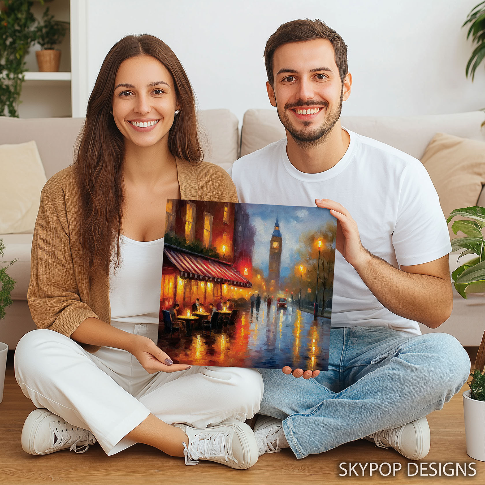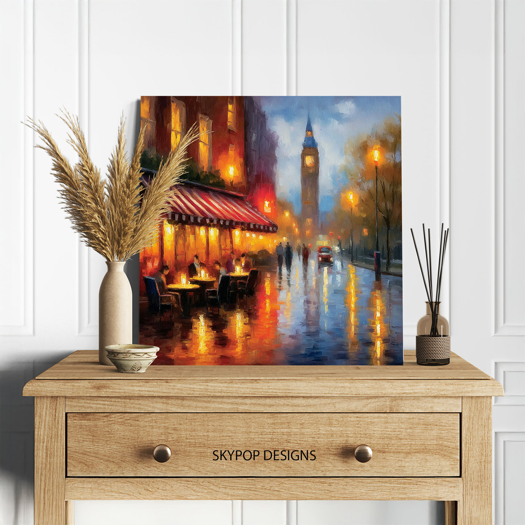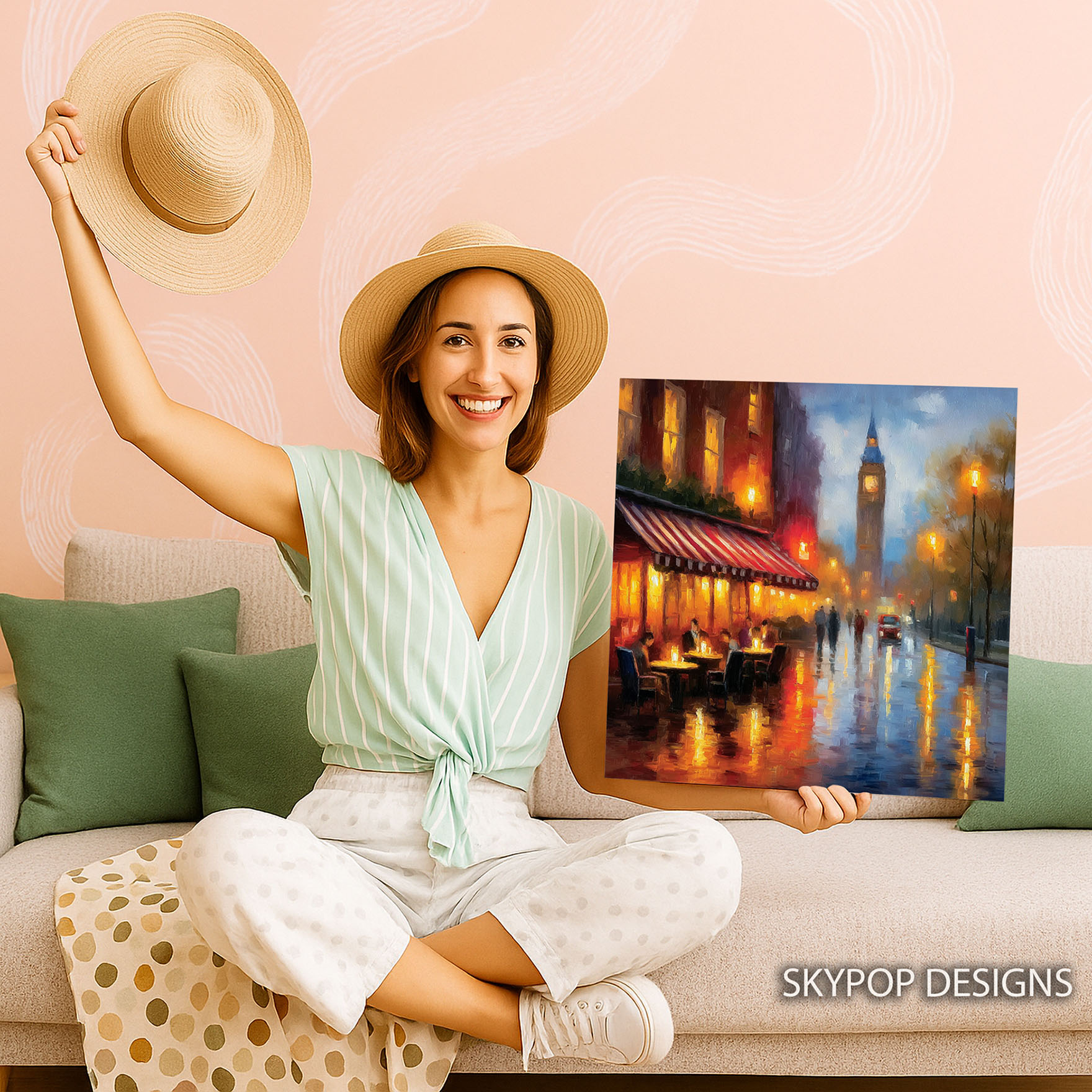 Transform your home with this captivating London cafe canvas wall art, capturing the essence of a rainy evening in the city. This poster or canvas wall art features a vibrant street scene with warm lights reflecting on the wet cobblestones, creating a cozy and inviting atmosphere. The impressionistic brushstrokes and rich colors depict a bustling cafe and the iconic silhouette of Big Ben, bringing a touch of European charm to your living room decor. Ideal for urban and modern spaces, this striking piece elevates any entryway or office, offering an inspiring view that sparks conversation. The interplay of blues and golds creates a sophisticated mood, perfect for enhancing contemporary or minimalist interiors. This versatile wall art is printed on high-quality canvas, ensuring durability and a stunning visual impact. It makes a thoughtful gift for housewarmings, birthdays, or anyone who loves travel-inspired art. The detailed depiction of the rainy street, illuminated by warm lamplight and cafe windows, evokes a sense of romantic nostalgia and city allure. Add a touch of timeless elegance to your home with this beautiful poster, a perfect blend of cityscape and impressionistic style. Elevate your interior design with this unique canvas wall art that brings the vibrant energy of London into your everyday life. Make a statement with this evocative piece that celebrates urban life and artistic expression. Add this stunning London cafe poster to your collection today and transform your walls.