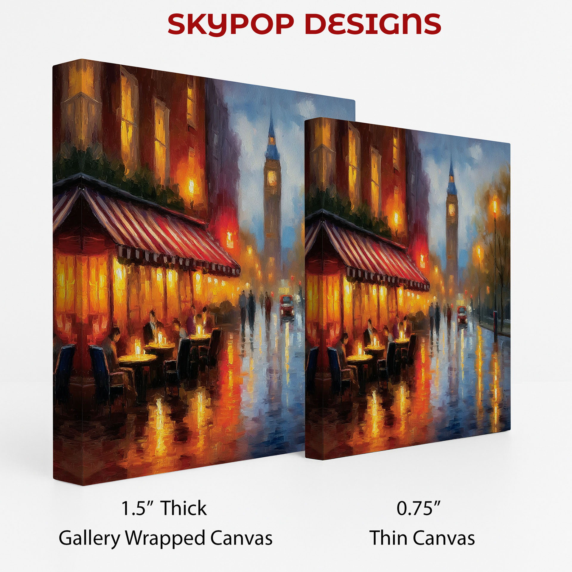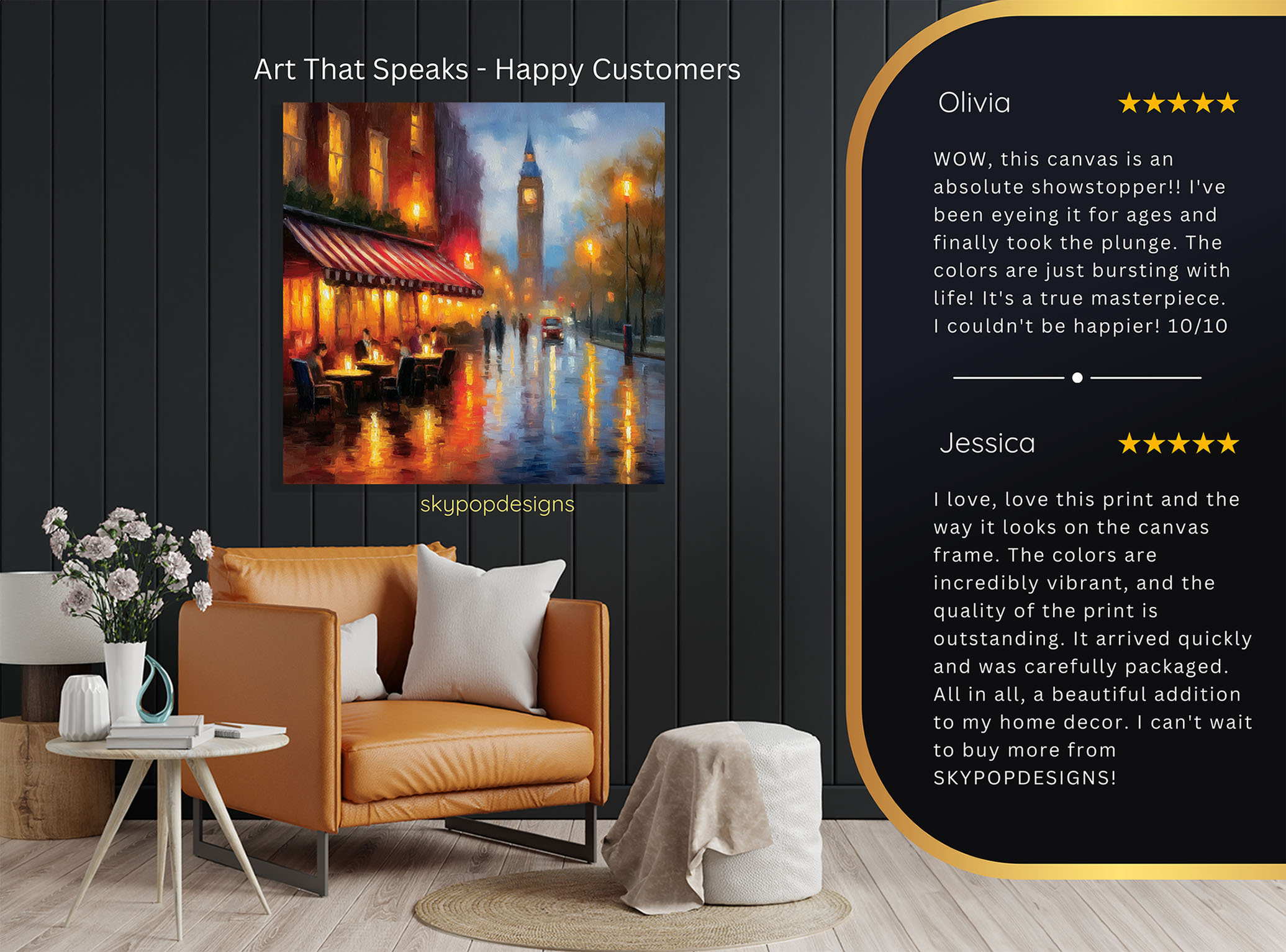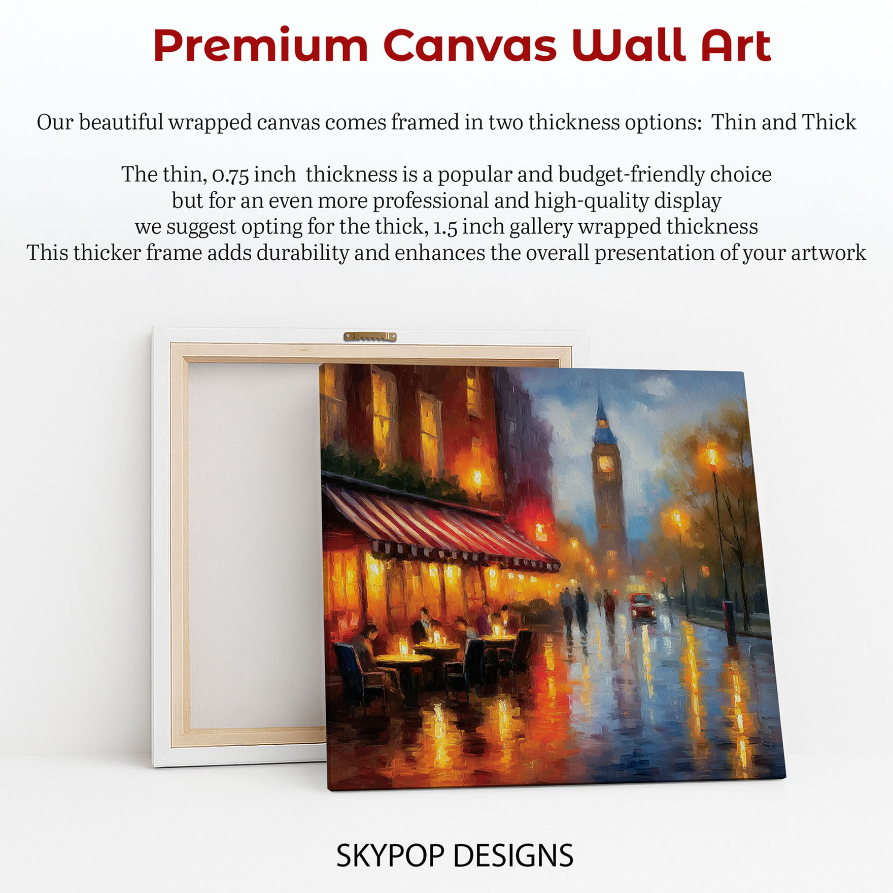 Transform your home with this captivating London cafe canvas wall art, capturing the essence of a rainy evening in the city. This poster or canvas wall art features a vibrant street scene with warm lights reflecting on the wet cobblestones, creating a cozy and inviting atmosphere. The impressionistic brushstrokes and rich colors depict a bustling cafe and the iconic silhouette of Big Ben, bringing a touch of European charm to your living room decor. Ideal for urban and modern spaces, this striking piece elevates any entryway or office, offering an inspiring view that sparks conversation. The interplay of blues and golds creates a sophisticated mood, perfect for enhancing contemporary or minimalist interiors. This versatile wall art is printed on high-quality canvas, ensuring durability and a stunning visual impact. It makes a thoughtful gift for housewarmings, birthdays, or anyone who loves travel-inspired art. The detailed depiction of the rainy street, illuminated by warm lamplight and cafe windows, evokes a sense of romantic nostalgia and city allure. Add a touch of timeless elegance to your home with this beautiful poster, a perfect blend of cityscape and impressionistic style. Elevate your interior design with this unique canvas wall art that brings the vibrant energy of London into your everyday life. Make a statement with this evocative piece that celebrates urban life and artistic expression. Add this stunning London cafe poster to your collection today and transform your walls.