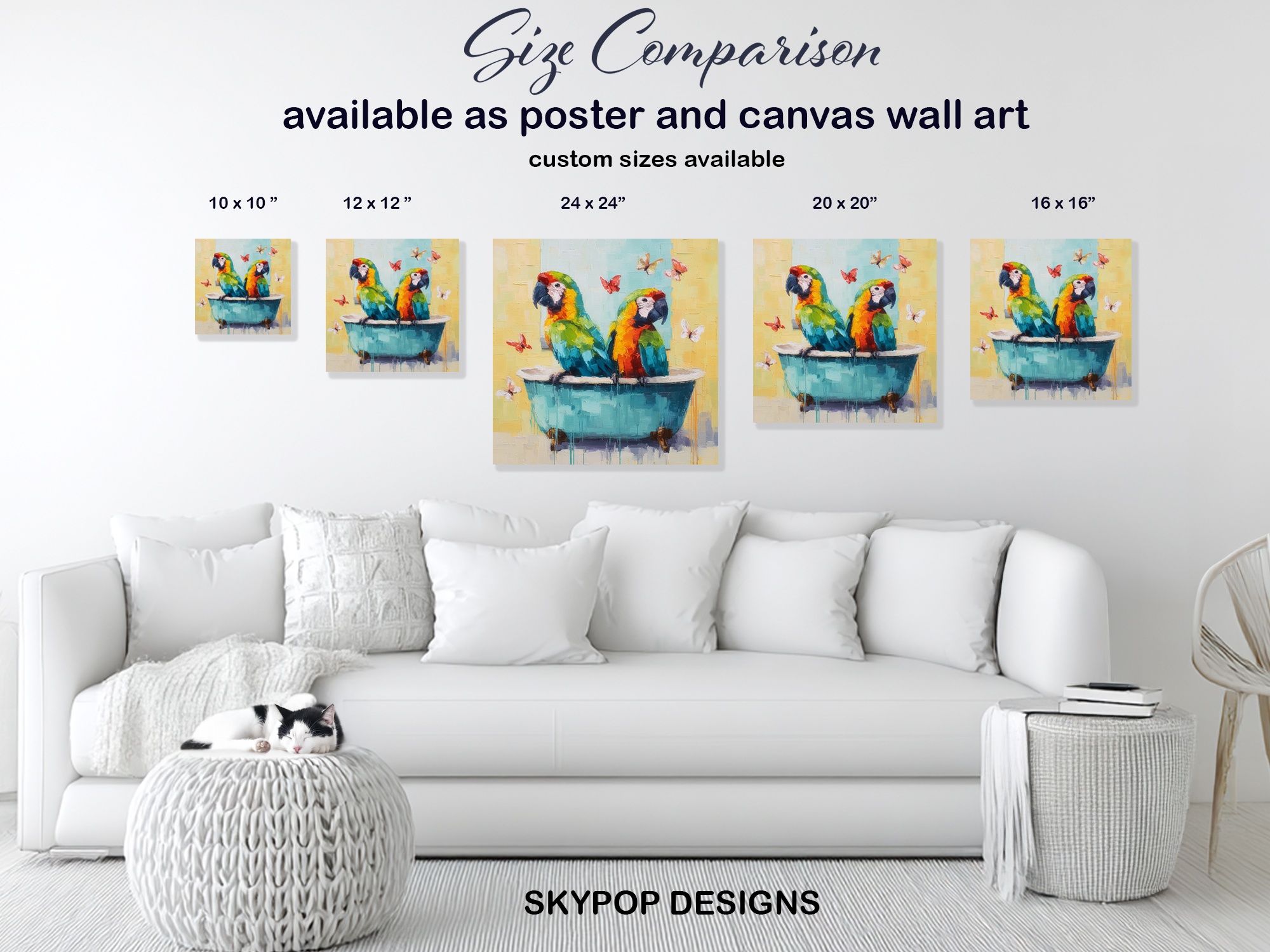 Bring a splash of vibrant color and playful charm to your home with this delightful macaw canvas wall art. This captivating poster features two colorful macaws perched in a vintage teal bathtub, surrounded by whimsical butterflies, creating a scene that’s both unexpected and joyful. The expressive brushstrokes and rich colors of this abstract parrot art make it a stunning focal point for any room. This unique wall art is perfect for transforming your bathroom into a tropical escape or adding a touch of personality to your living room decor. The striking blend of blues, yellows, and reds in this macaw canvas wall art evokes a sense of happiness and wonder. Ideal for those who love bohemian or modern farmhouse decor, this piece adds a cheerful accent to transitional spaces. It’s also a fantastic gift for bird lovers, animal art collectors, or anyone looking to brighten their home with vibrant, conversation-starting decor. The high-quality printing ensures every detail of this parrot poster is rendered beautifully, making it a lasting addition to your art collection. Elevate your space with this unique animal wall art that captures the playfulspirit of nature. This versatile artwork enhances the ambiance of children’s rooms, sunrooms, or guest bathrooms, bringing a sense of fun and whimsy. Showcase your love for nature and vibrant colors with this eye-catching canvas wall art.Transform your living space with this stunning piece today.