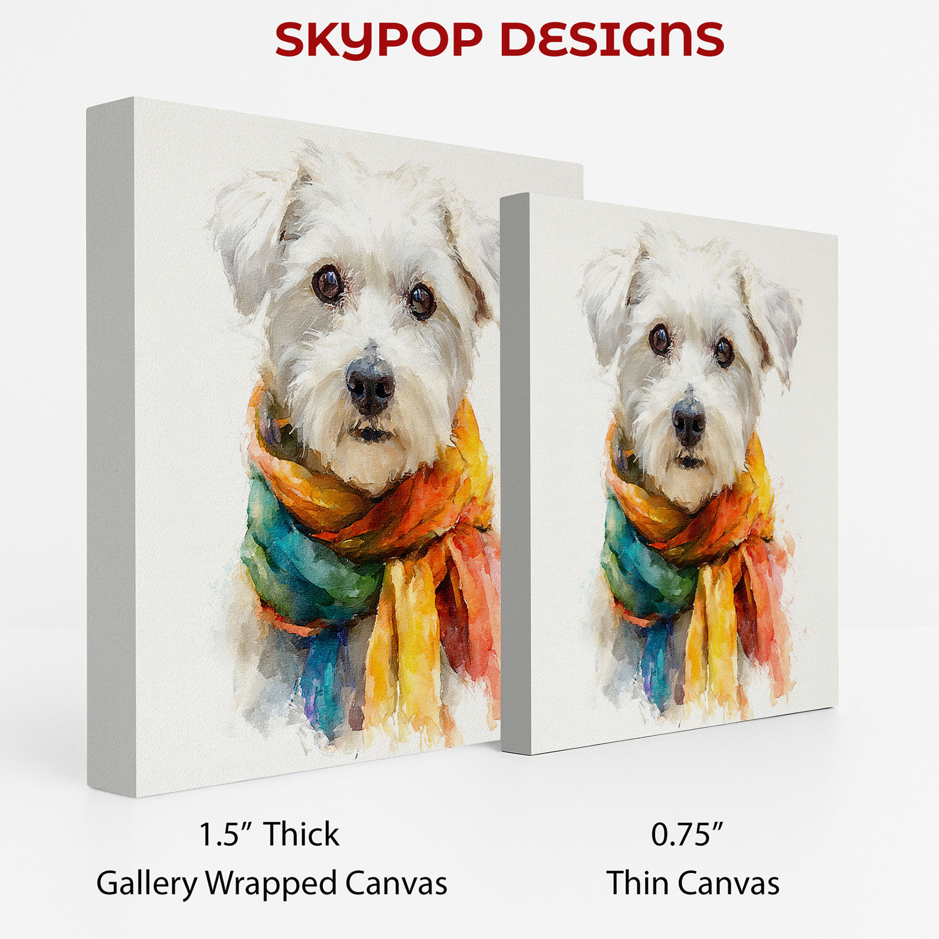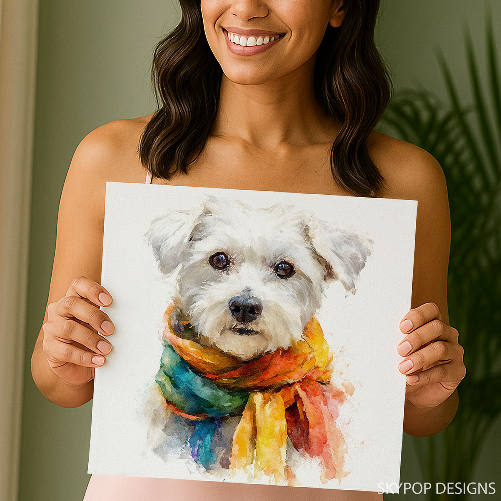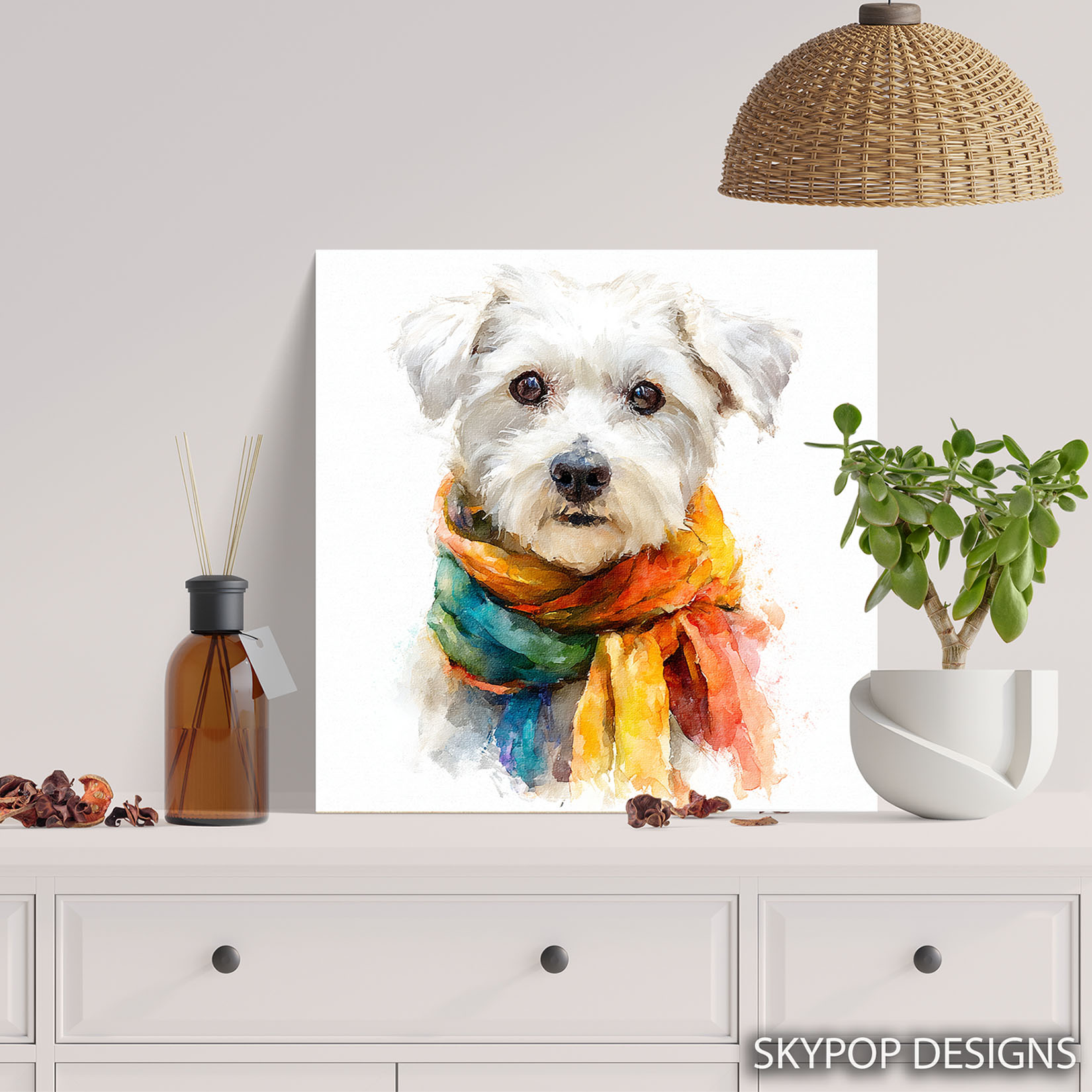 Brighten your space with this charming Maltese canvas wall art, showcasing a fluffy white Maltese dog sporting a vibrant, multicolored scarf. This eye-catching poster or canvas wall art embodies a joyful and whimsical spirit. The striking blend of colors in the scarf, including shades of yellow, orange, blue, and green, draws the viewer in, perfectly complementing the dog’s fluffy white fur against a clean white background. Ideal for contemporary living rooms, cozy Bohemian bedrooms, or cute children’s rooms, this animal art piece adds a pop of personality and warmth. This canvas wall art is perfect for dog lovers and those who appreciate unique decor. The painterly watercolor style gives this poster a soft, artistic feel, making it a delightful addition to entryways or nurseries. Its cheerful demeanor is sure to uplift any mood. This versatile dog wall art is an excellent gift for housewarmings, birthdays, or any occasion for a dog enthusiast. High-quality printing ensures the vibrant colors remain true and the textures are beautifully rendered on this canvas print. Elevate your home with this delightful Maltese canvas art that celebrates companionship and fun. Transform your walls with this captivating dog poster and bring smiles to everyone who sees it. Discover your new favorite wall decor today!