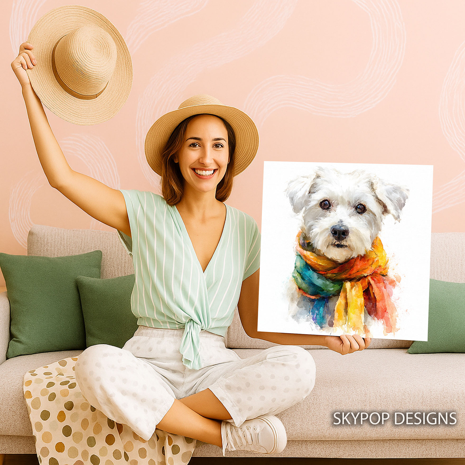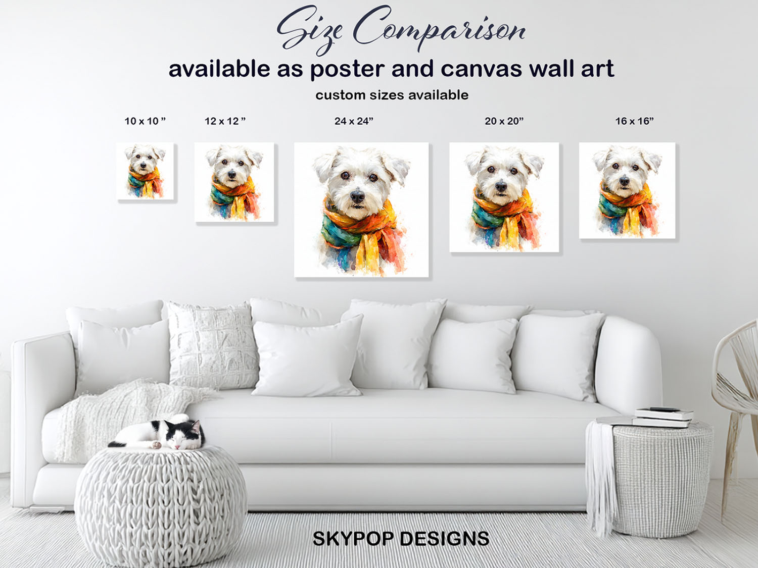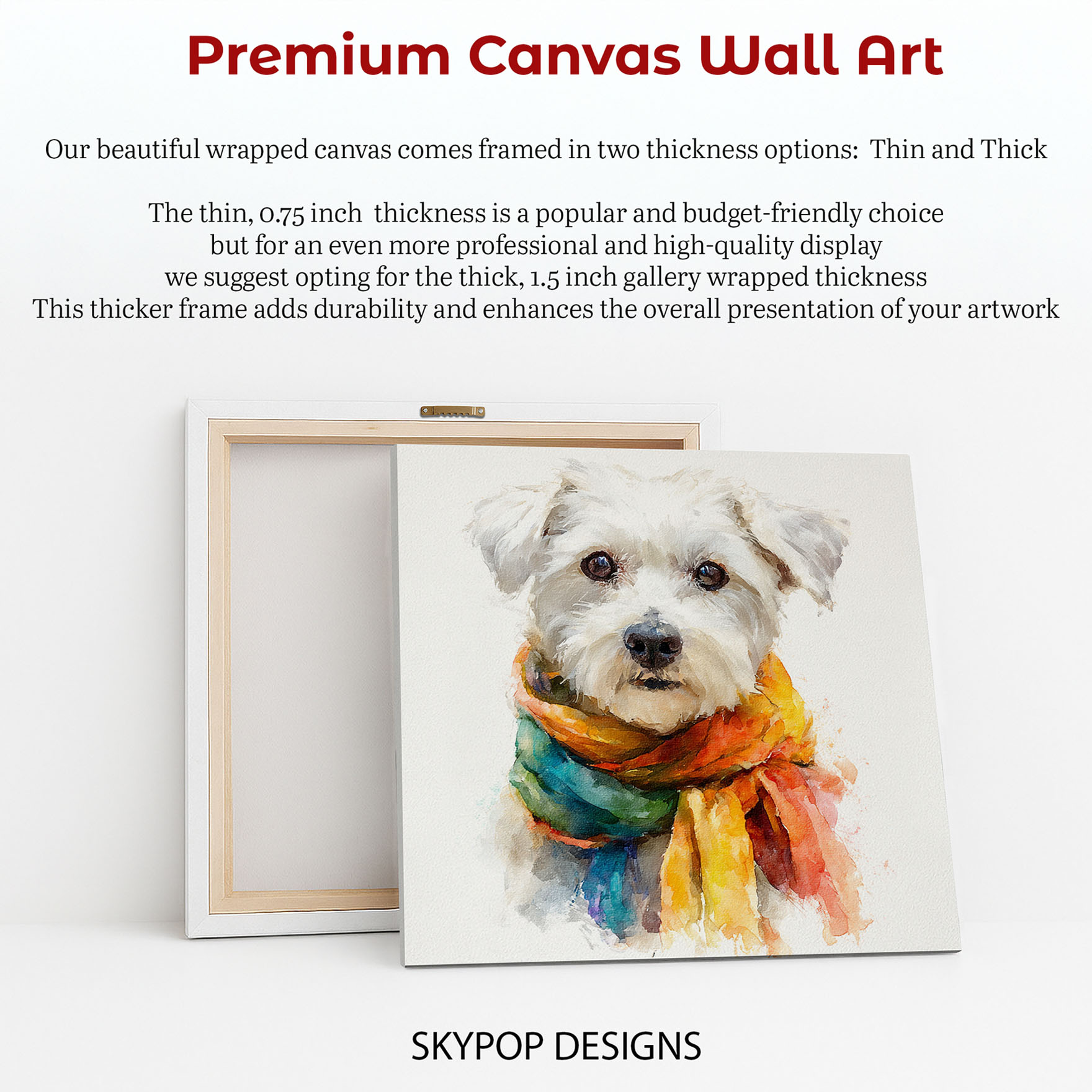 Brighten your space with this charming Maltese canvas wall art, showcasing a fluffy white Maltese dog sporting a vibrant, multicolored scarf. This eye-catching poster or canvas wall art embodies a joyful and whimsical spirit. The striking blend of colors in the scarf, including shades of yellow, orange, blue, and green, draws the viewer in, perfectly complementing the dog’s fluffy white fur against a clean white background. Ideal for contemporary living rooms, cozy Bohemian bedrooms, or cute children’s rooms, this animal art piece adds a pop of personality and warmth. This canvas wall art is perfect for dog lovers and those who appreciate unique decor. The painterly watercolor style gives this poster a soft, artistic feel, making it a delightful addition to entryways or nurseries. Its cheerful demeanor is sure to uplift any mood. This versatile dog wall art is an excellent gift for housewarmings, birthdays, or any occasion for a dog enthusiast. High-quality printing ensures the vibrant colors remain true and the textures are beautifully rendered on this canvas print. Elevate your home with this delightful Maltese canvas art that celebrates companionship and fun. Transform your walls with this captivating dog poster and bring smiles to everyone who sees it. Discover your new favorite wall decor today!