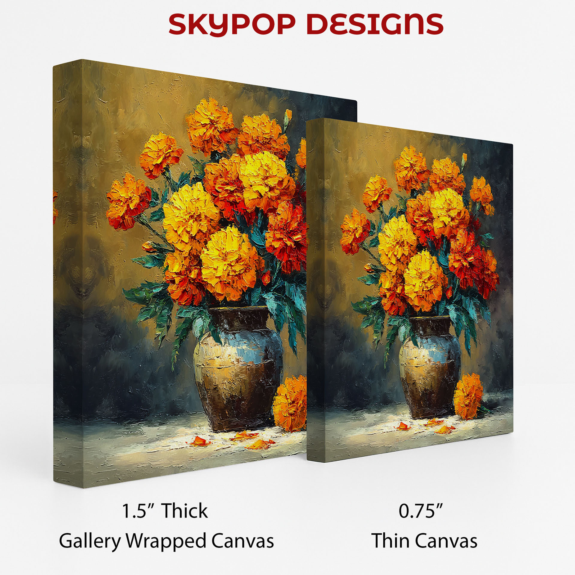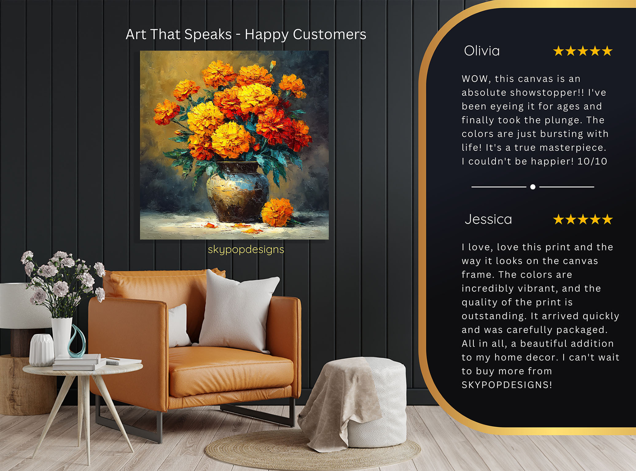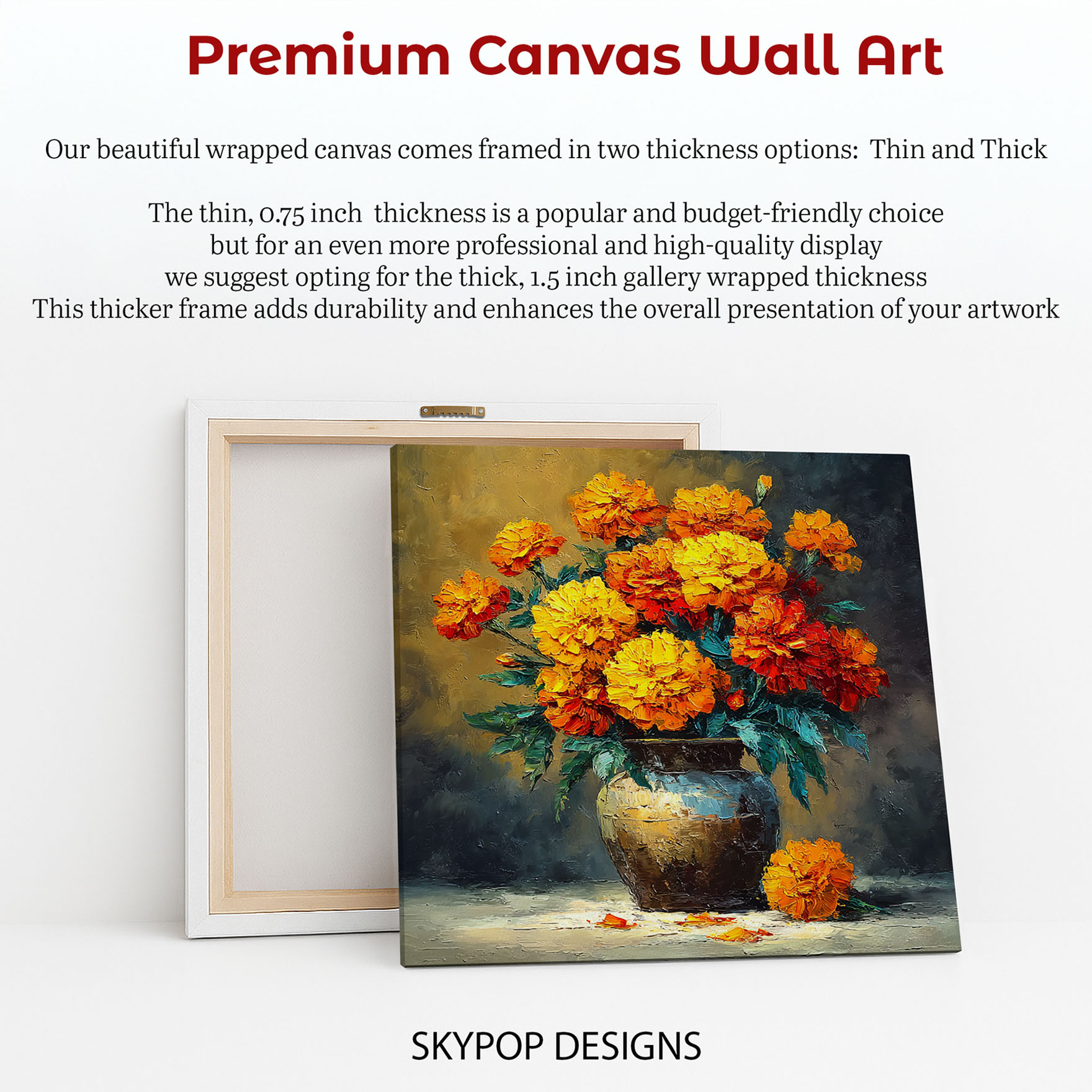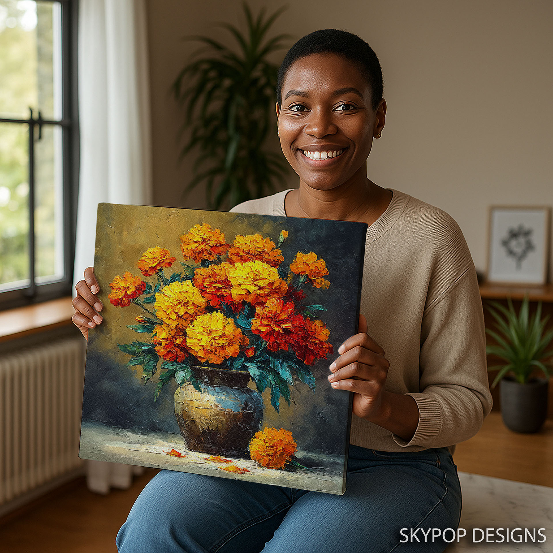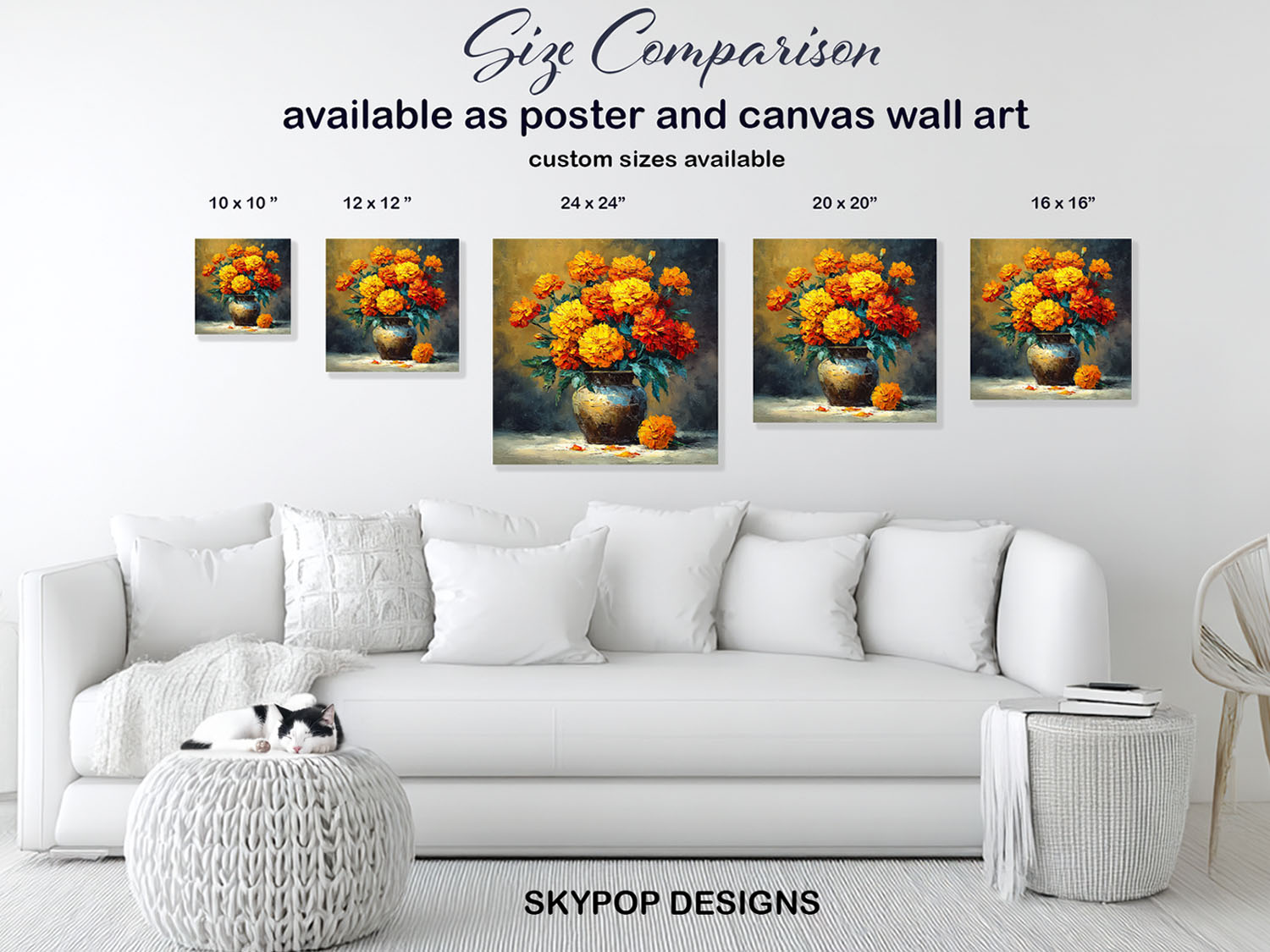 Brighten your home with this stunning marigold canvas wall art, capturing the vibrant beauty of a still life floral arrangement. This poster or canvas wall art is perfect for adding a cheerful splash of color to any space, transforming average living room wall decor into a captivating display. The warm oranges and yellows of the marigolds, set against a textured, rustic background, create a visually striking impression. Ideal for farmhouse, rustic, or Tuscan decor styles, this floral artwork brings an organic and lively feel to dining rooms and entryways. The rich, impasto-like brushstrokes in this canvas art give the flowers a three-dimensional quality, making them appear to bloom right off the wall. Experience the mood-enhancing power of these sunny blooms, symbolizing happiness and passion, bringing warmth and joy to your home. This high-quality print of marigolds is perfect for kitchen walls or as a thoughtful housewarming gift, bringing natural charm indoors. The vibrant color palette of this floral canvas art complements various interior designs, from cozy cottages to modern farmhouses. Elevate your home decor with this exquisite marigold poster that celebrates the simple elegance of nature. Add a touch of timeless beauty and vibrant energy to your walls today with this captivating floral wall art. This piece is a perfect example of how floral art can transform an entire room’s atmosphere. Add this marigold artwork to your collection and enjoy its radiant beauty year-round.