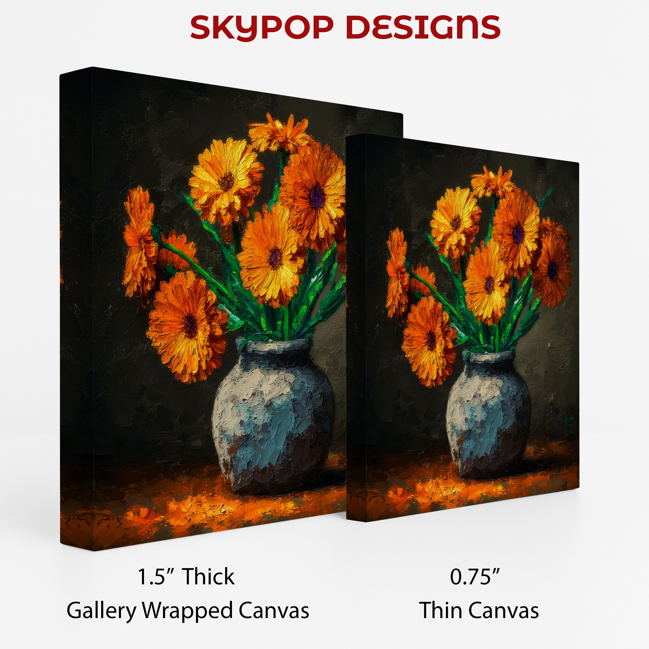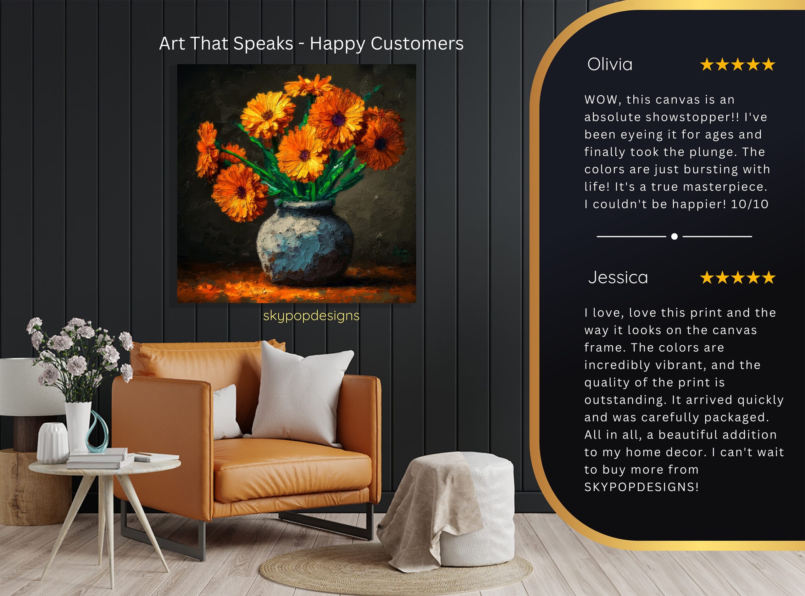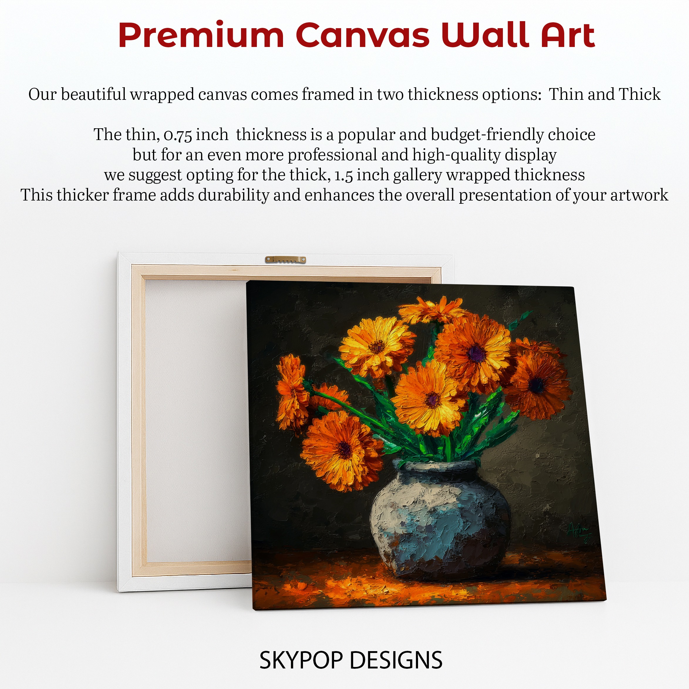 Keywords: Marigold Wall Art, Canvas Art, Impressionism Art, Still Life Art, Nature Art, Rustic Decor, Farmhouse Decor, Traditional Decor, Living Room Art, Dining Room Art, Kitchen Art, Entryway Decor, Orange Flowers, Floral Artwork, Bouquet Art, Vase Art, Vibrant Colors, Joyful Art, Energetic Art, Seasonal Charm, Handcrafted Feel, Housewarming Gift, Birthday Gift, Holiday Gift, Floral Painting, Wall Decor, Country Decor, Botanical Art, Rich Green, Eye-catching Art