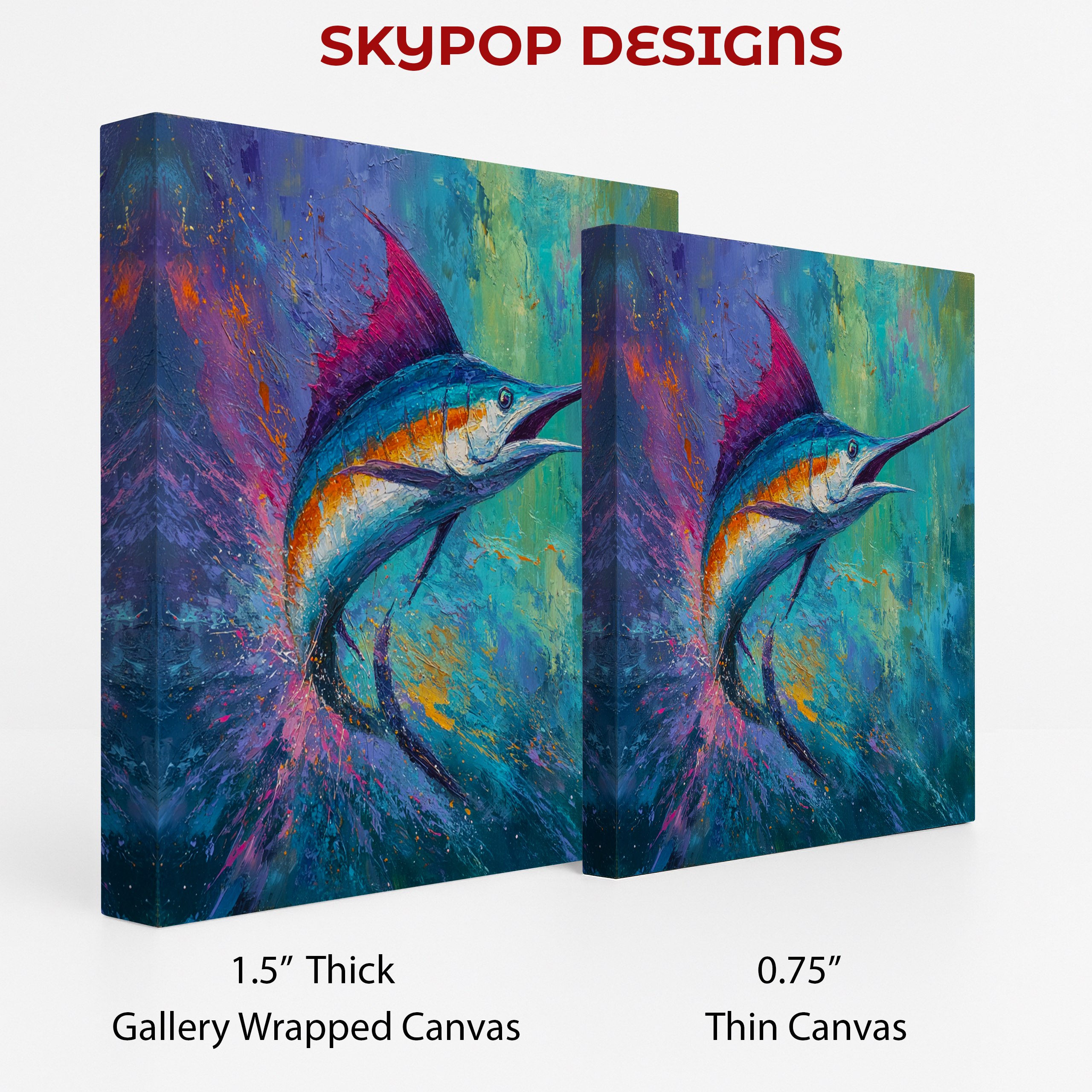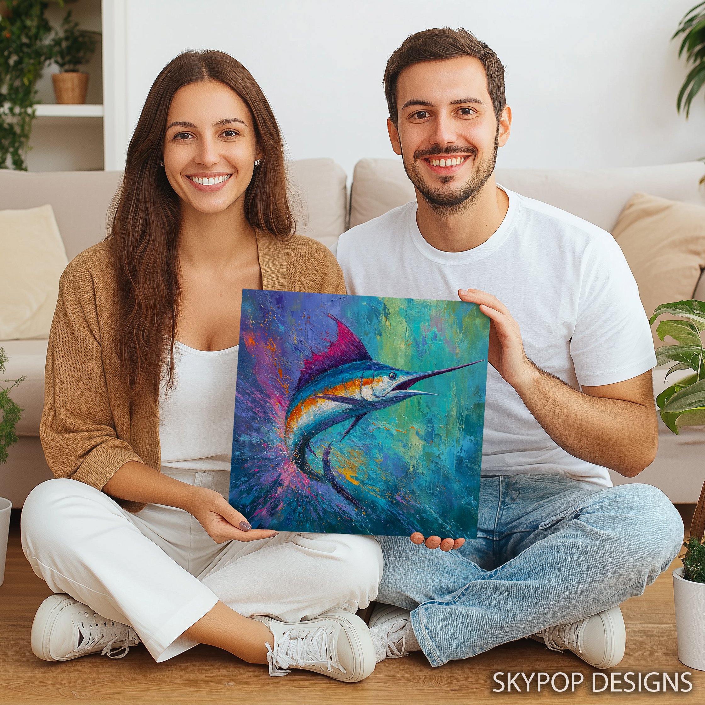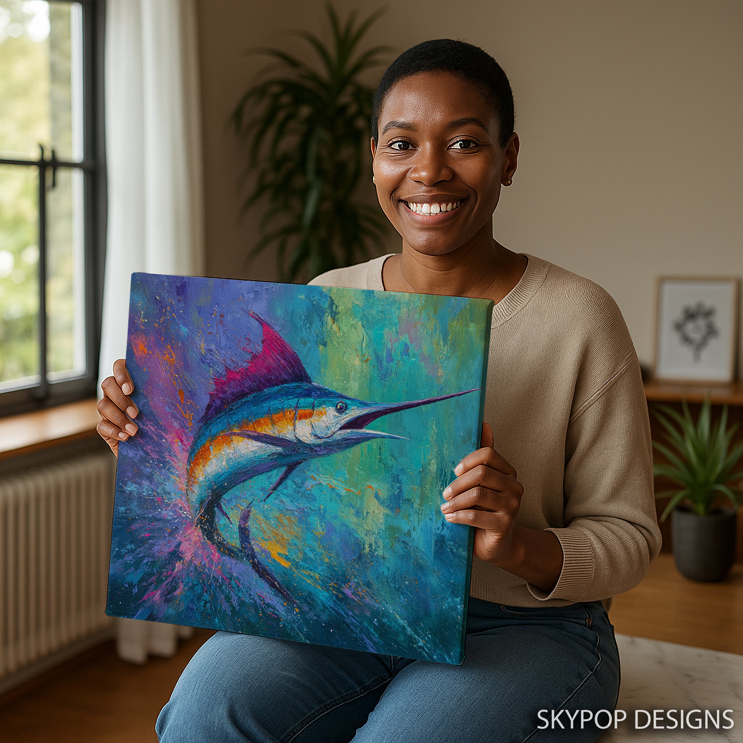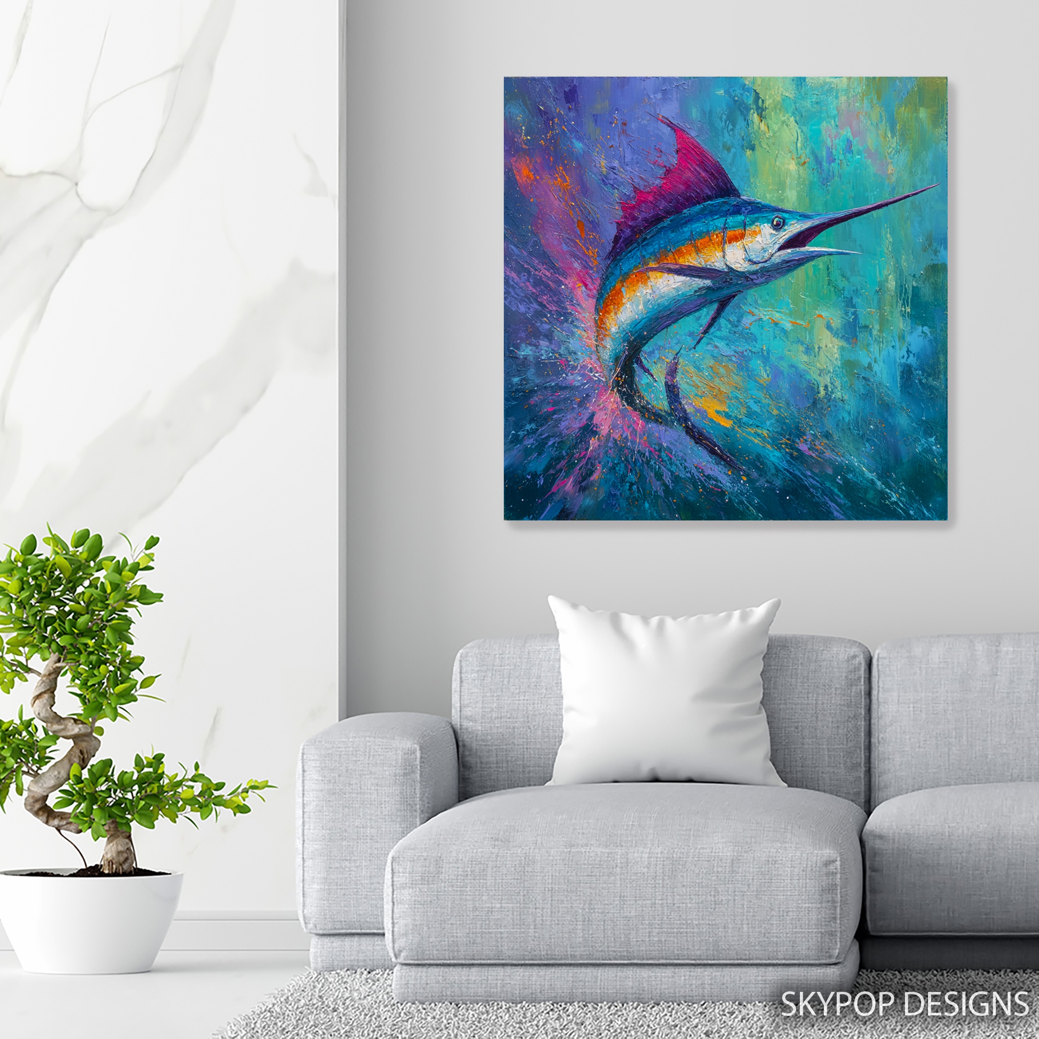 Dive into the vibrant world of ocean life with this stunning marlin canvas wall art. This eye-catching piece showcases a dynamic marlin in vivid blues and turquoise, set against a background of splashing purples and oranges. Perfect for modern coastal decor, this poster brings the energy of the sea into your living room or bedroom. The bold brushstrokes and explosive color palette create a sense of movement, making this canvas art a focal point that transforms any space. Ideal for ocean lovers and fishing enthusiasts, this artwork celebrates the beauty and power of marine life. The large size options available make it suitable for statement walls in open-plan living areas or as a centerpiece in a home office. The mix of cool and warm tones in this piece can enhance various color schemes, from calming blue bathrooms to vibrant bohemian-inspired spaces. High-quality printing ensures every detail of the marlin’s form and the surrounding water spray is captured in stunning clarity. Whether you’re decorating a beach house or bringing a touch of the ocean to an urban apartment, this marlin wall art adds a splash of color and life to your decor. Gift this to a marine biology enthusiast or use it to elevate your own space with its contemporary flair. Transform your room into an underwater paradise with this captivating marlin artwork today.