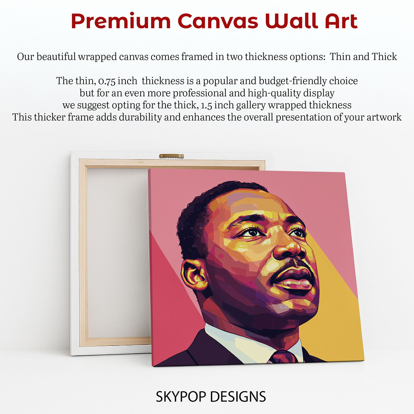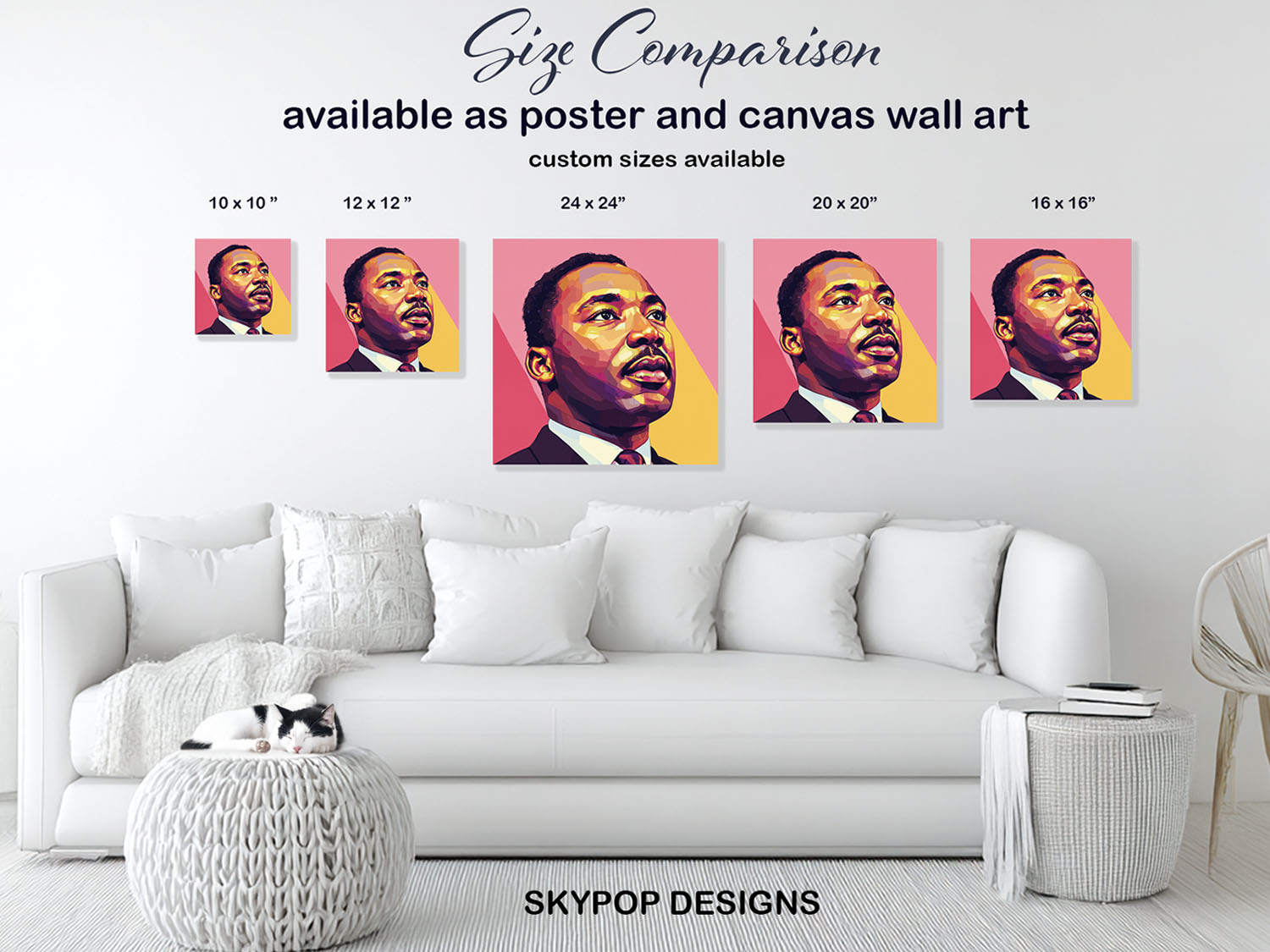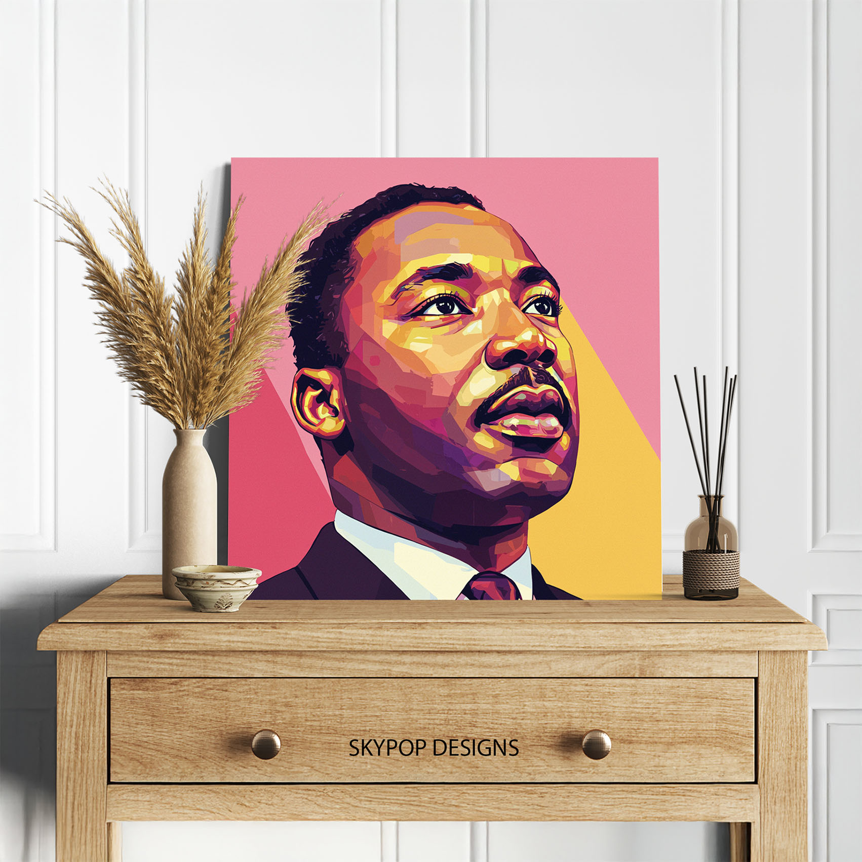 Elevate your space with this striking Martin Luther King Jr. canvas wall art that captures the spirit of inspiration and leadership. This vibrant pop art poster or canvas wall art is perfect for modern living rooms, offices, or libraries, bringing a powerful presence to your decor. The bold multicolor palette of pink, yellow, and purple hues creates a captivating focal point that sparks conversation and conveys strength. Ideal for contemporary and minimalist decor styles, this piece enhances African American art collections with its dynamic portrait. The graphic style of this MLK wall art makes it an eye-catching addition, celebrating a pivotal figure in history. High-quality printing ensures every sharp angle and vivid color is rendered with stunning clarity on this canvas wall art available in various sizes. This inspiring artwork is perfect for educational spaces or as a thoughtful gift for birthdays, Black History Month, or any occasion honoring civil rights and justice. The energetic color scheme adds a touch of modern flair to any room, making it a versatile choice for enhancing home wall decor. Transform your environment with this impactful Martin Luther King Jr. poster that serves as a daily reminder of courage and perseverance. Add this exceptional piece of art to your collection and make a statement with its powerful imagery and artistic execution today.