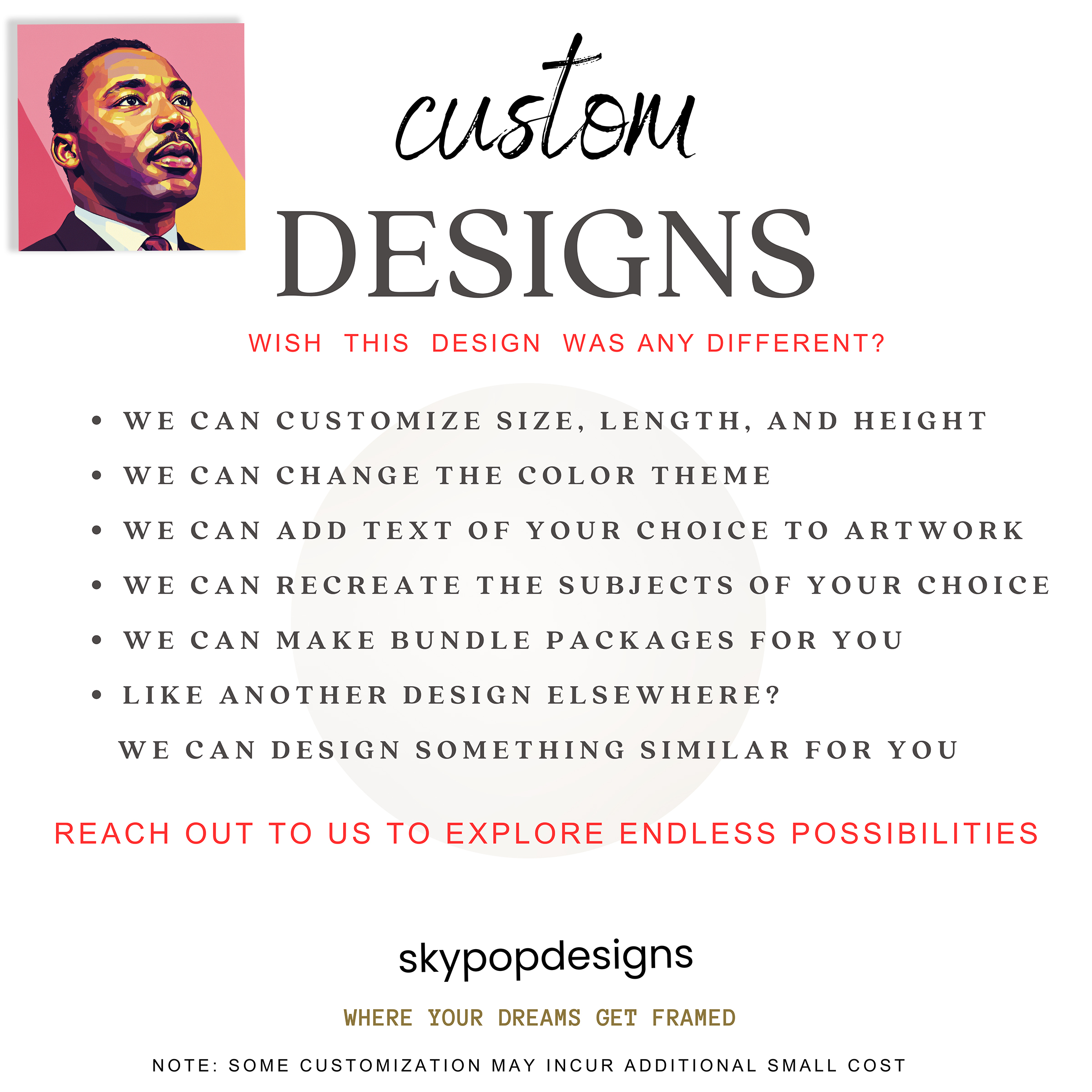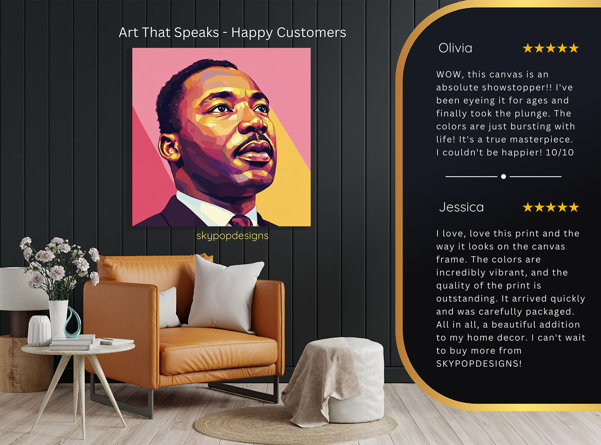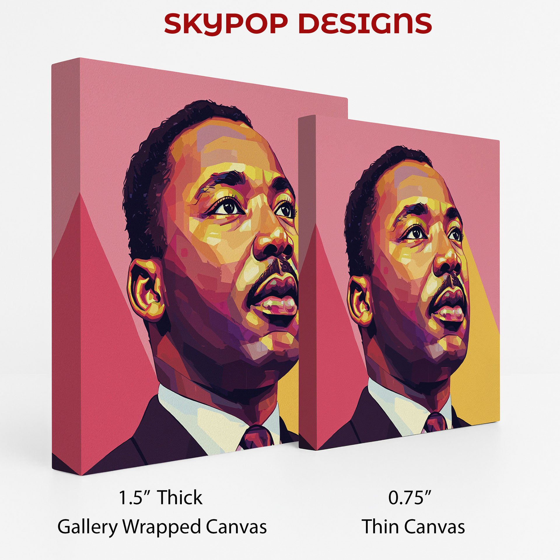 Elevate your space with this striking Martin Luther King Jr. canvas wall art that captures the spirit of inspiration and leadership. This vibrant pop art poster or canvas wall art is perfect for modern living rooms, offices, or libraries, bringing a powerful presence to your decor. The bold multicolor palette of pink, yellow, and purple hues creates a captivating focal point that sparks conversation and conveys strength. Ideal for contemporary and minimalist decor styles, this piece enhances African American art collections with its dynamic portrait. The graphic style of this MLK wall art makes it an eye-catching addition, celebrating a pivotal figure in history. High-quality printing ensures every sharp angle and vivid color is rendered with stunning clarity on this canvas wall art available in various sizes. This inspiring artwork is perfect for educational spaces or as a thoughtful gift for birthdays, Black History Month, or any occasion honoring civil rights and justice. The energetic color scheme adds a touch of modern flair to any room, making it a versatile choice for enhancing home wall decor. Transform your environment with this impactful Martin Luther King Jr. poster that serves as a daily reminder of courage and perseverance. Add this exceptional piece of art to your collection and make a statement with its powerful imagery and artistic execution today.