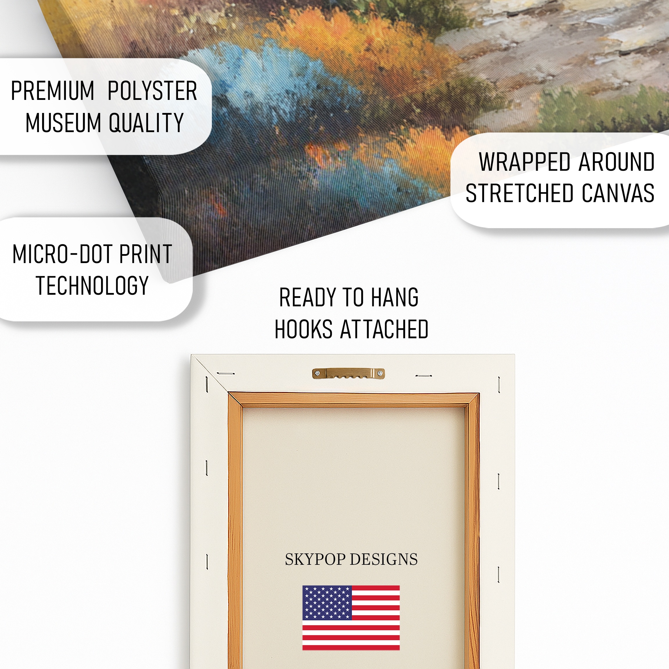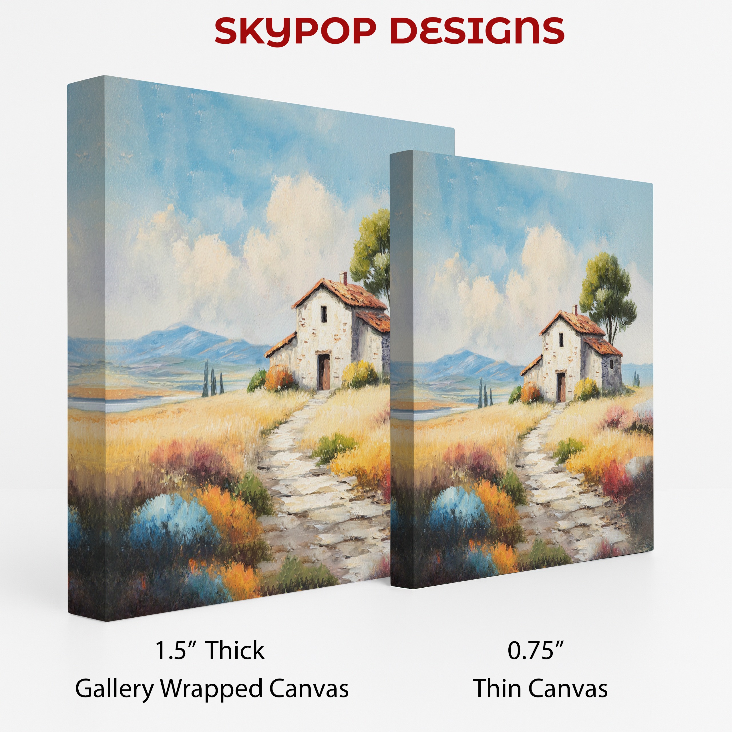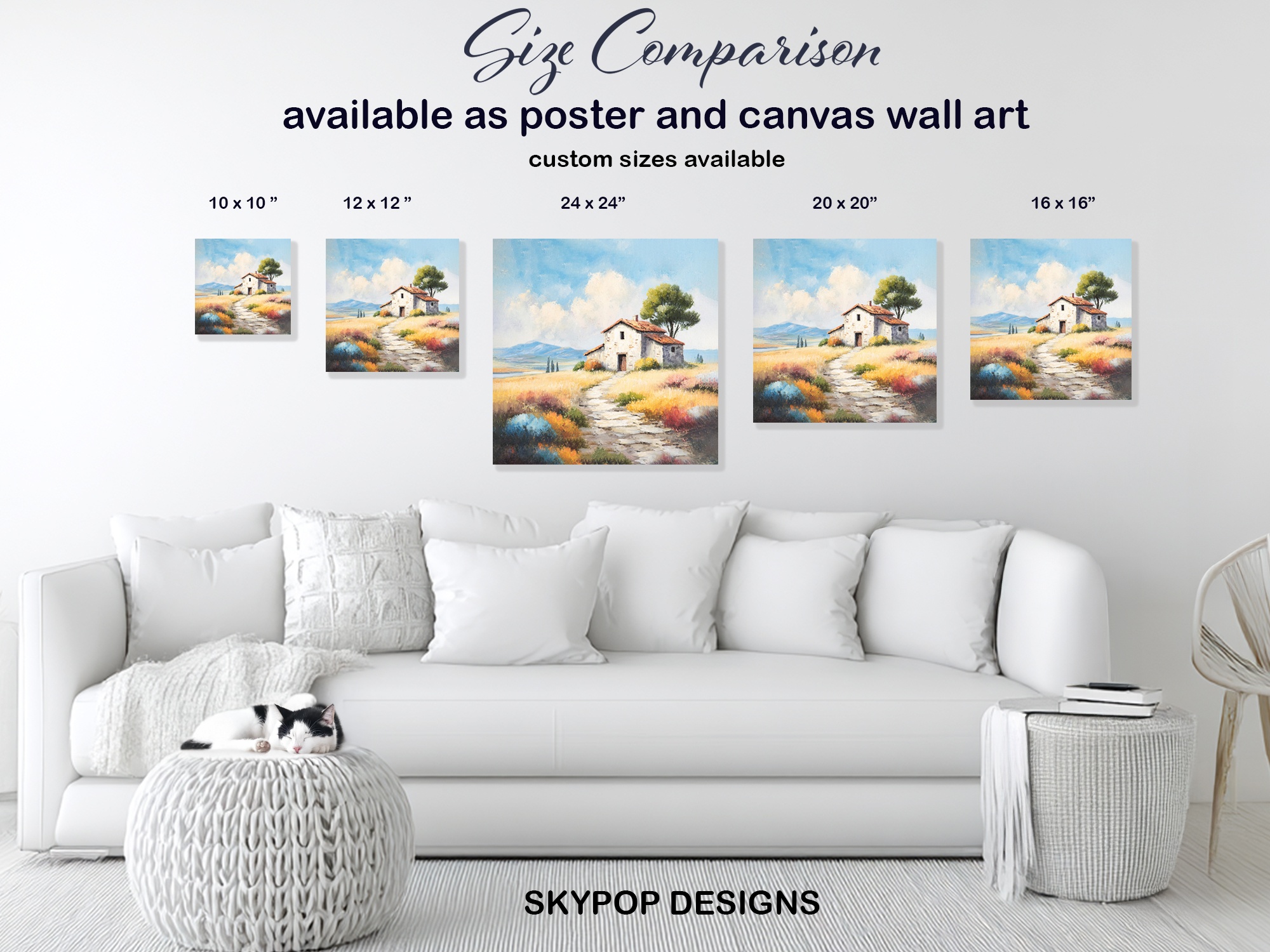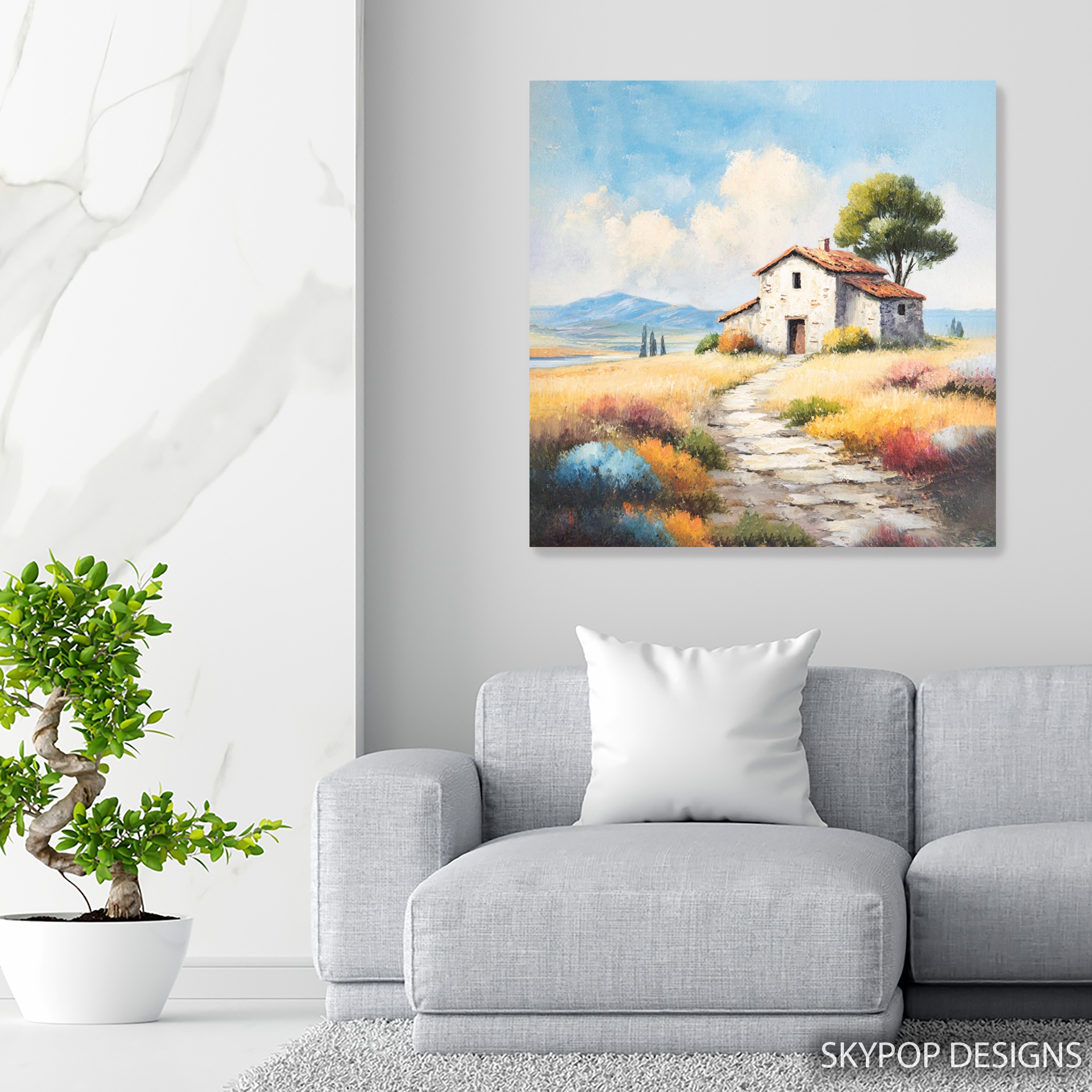 Transform your space with this stunning Mediterranean farmhouse canvas wall art that captures the essence of rustic charm and serene landscapes. This captivating poster showcases a quaint white stone house with a terracotta roof, nestled among golden fields and vibrant wildflowers. The impressionistic brushstrokes bring the scene to life, creating a sense of warmth and tranquility perfect for country-inspired decor. Ideal for living rooms, dining areas, or kitchens, this canvas art adds a touch of Tuscan elegance to any space. The vivid blue sky and distant mountains create depth, while the lush green tree and colorful flora in the foreground add visual interest and texture. This versatile piece works beautifully as a focal point in rustic or farmhouse-style interiors, or as a calming accent in modern spaces. The natural color palette of yellows, blues, and greens evokes feelings of peace and connection to nature, making it a perfect addition to your home decor. Whether you’re looking to refresh your entryway or create a cozy atmosphere in your dining room, this high-quality canvas wall art delivers timeless appeal and rustic charm. Elevate your home’s ambiance with this breathtaking Mediterranean landscape that celebrates the beauty of countryside living and brings a slice of Tuscan paradise into your everyday life.