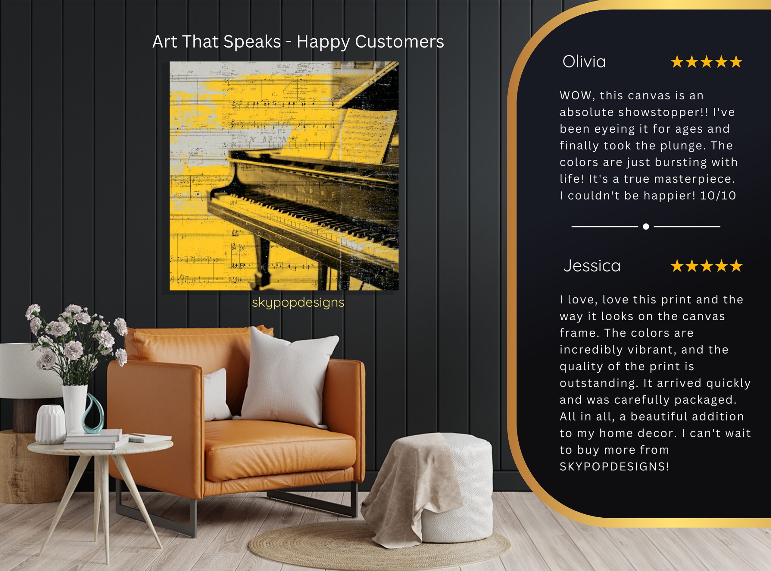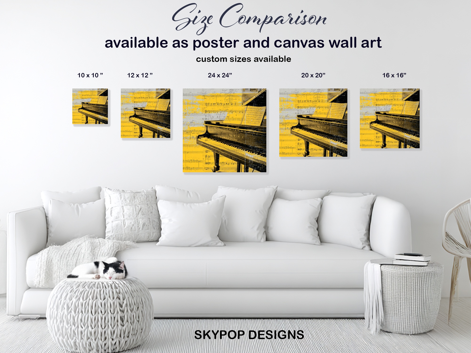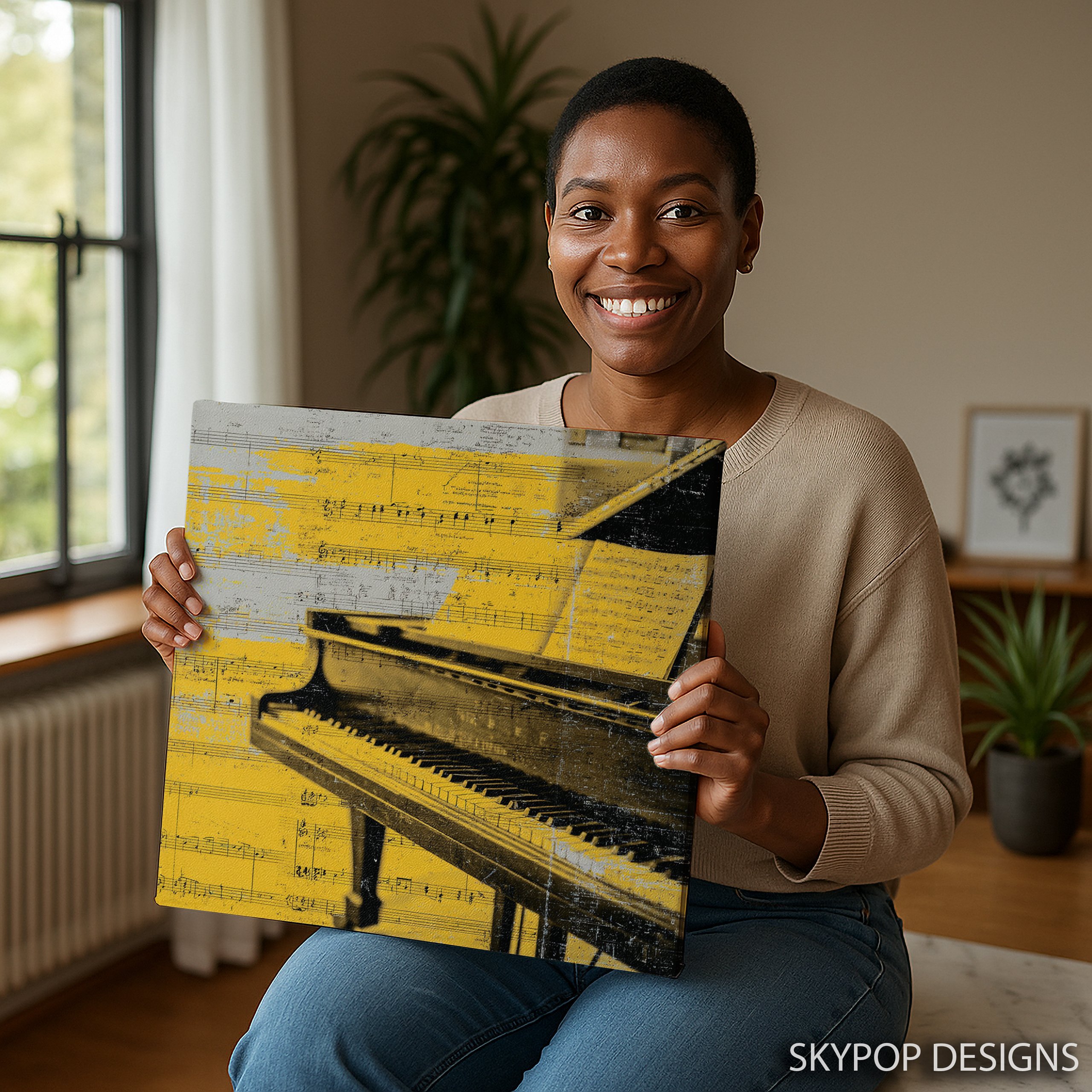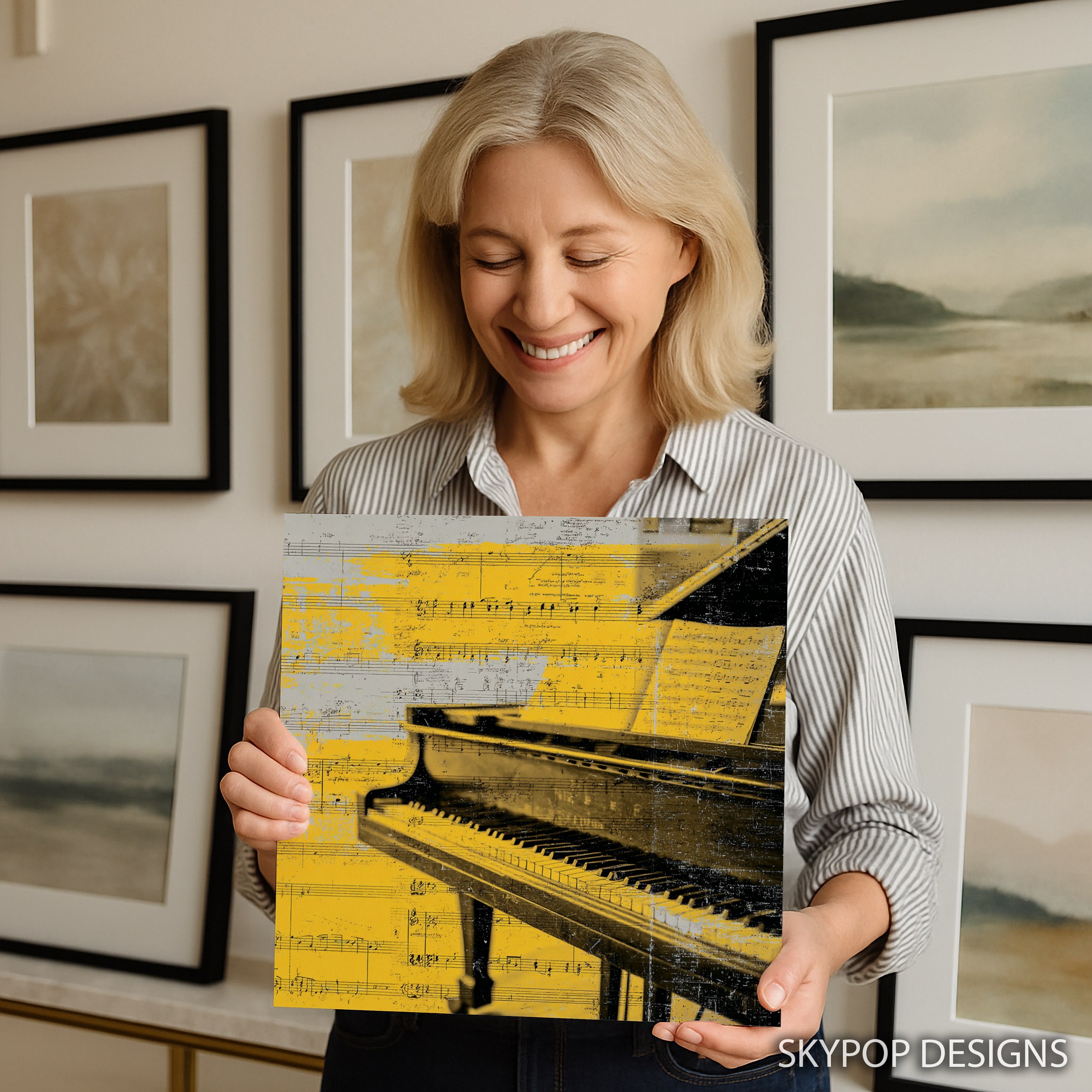 Elevate your space with this striking piano canvas wall art that beautifully merges music and visual artistry. The bold yellow and black color scheme creates a captivating contrast, instantly drawing the eye and making a powerful statement in any room. This modern poster or canvas print showcases a grand piano overlaid with sheet music, perfect for music lovers or anyone seeking to add a touch of sophistication to their decor. The vibrant yellow background infuses energy and warmth, while the crisp black piano keys and musical notation provide structure and depth. Ideal for contemporary living rooms, home offices, or dedicated music rooms, this piece effortlessly blends vintage charm with modern aesthetics. The textured appearance adds a rustic touch, making it versatile enough to complement minimalist or more eclectic interior styles. Whether you’re a pianist, music enthusiast, or simply appreciate unique wall art, this canvas brings harmony to your space. The high-quality printing captures every intricate detail of the sheet music and piano, ensuring a stunning visual experience from any angle. This artwork serves as an excellent conversation starter and can inspire creativity in your home studio or practice space. Transform your walls today with this melodic masterpiece that celebrates the timeless beauty of music and design. A perfect gift for musicians or as a housewarming present, this piano canvas art will resonate with anyone who appreciates the power of music and art combined.