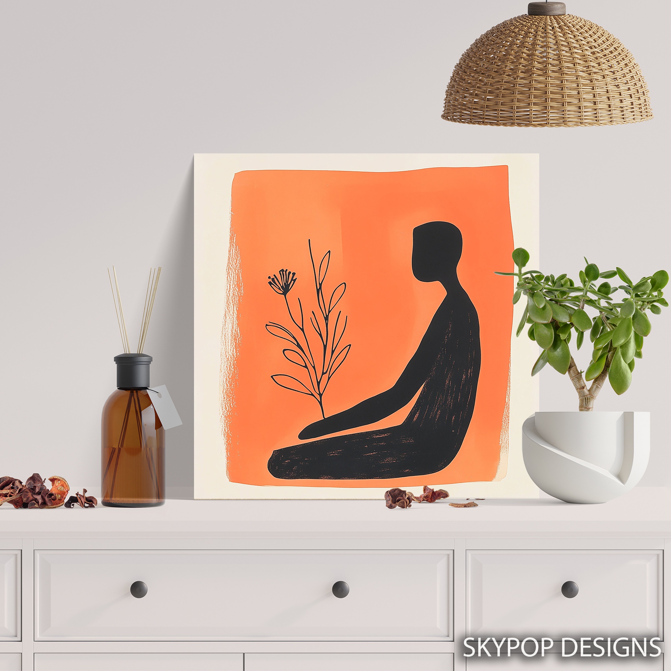 Elevate your space with this striking minimalist canvas wall art featuring a bold silhouette against a vibrant orange background. This contemporary poster seamlessly blends simplicity and sophistication, making it the perfect addition to modern living rooms or serene bedrooms. The stark contrast between the black figure and the warm orange hue creates a captivating visual that draws the eye and sparks conversation. Ideal for those who appreciate Scandinavian design or zen-inspired decor, this piece brings a sense of calm and balance to any room. The delicate flower motif adds a touch of nature, symbolizing growth and renewal in your daily environment. Whether displayed as a standalone statement piece or as part of a gallery wall, this canvas art adapts beautifully to various interior styles. The clean lines and minimalist approach make it a versatile choice for home offices, meditation spaces, or anywhere you want to create a focused, tranquil atmosphere. High-quality printing ensures every detail is crisp and vibrant, from the subtle texture of the orange background to the sleek silhouette. This artwork isn’t just decor; it’s a daily reminder to find beauty in simplicity. Perfect as a housewarming gift or to refresh your own space, this modern wall art transforms rooms with its understated elegance. Embrace the power of minimalist design and bring a touch of contemporary flair to your home today.