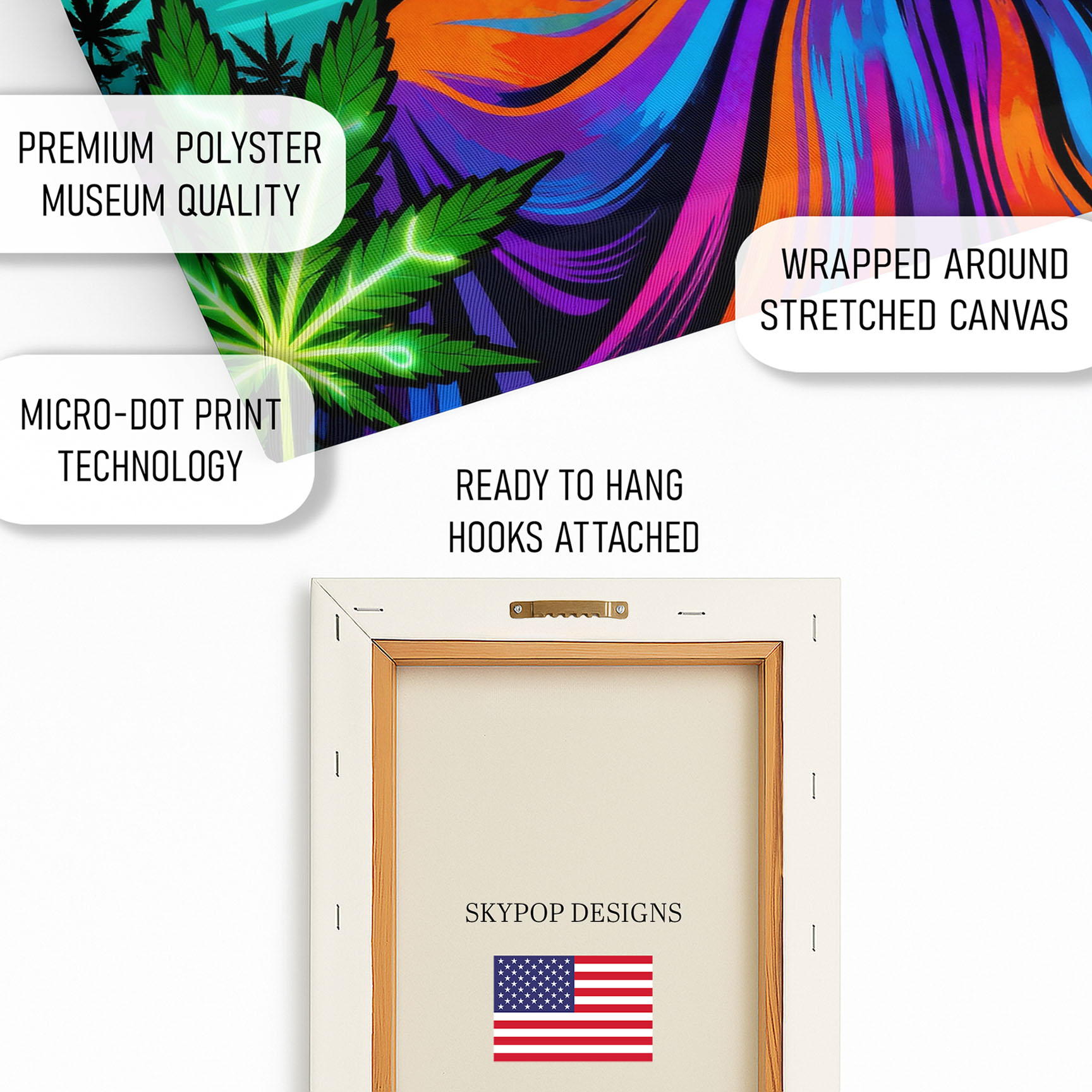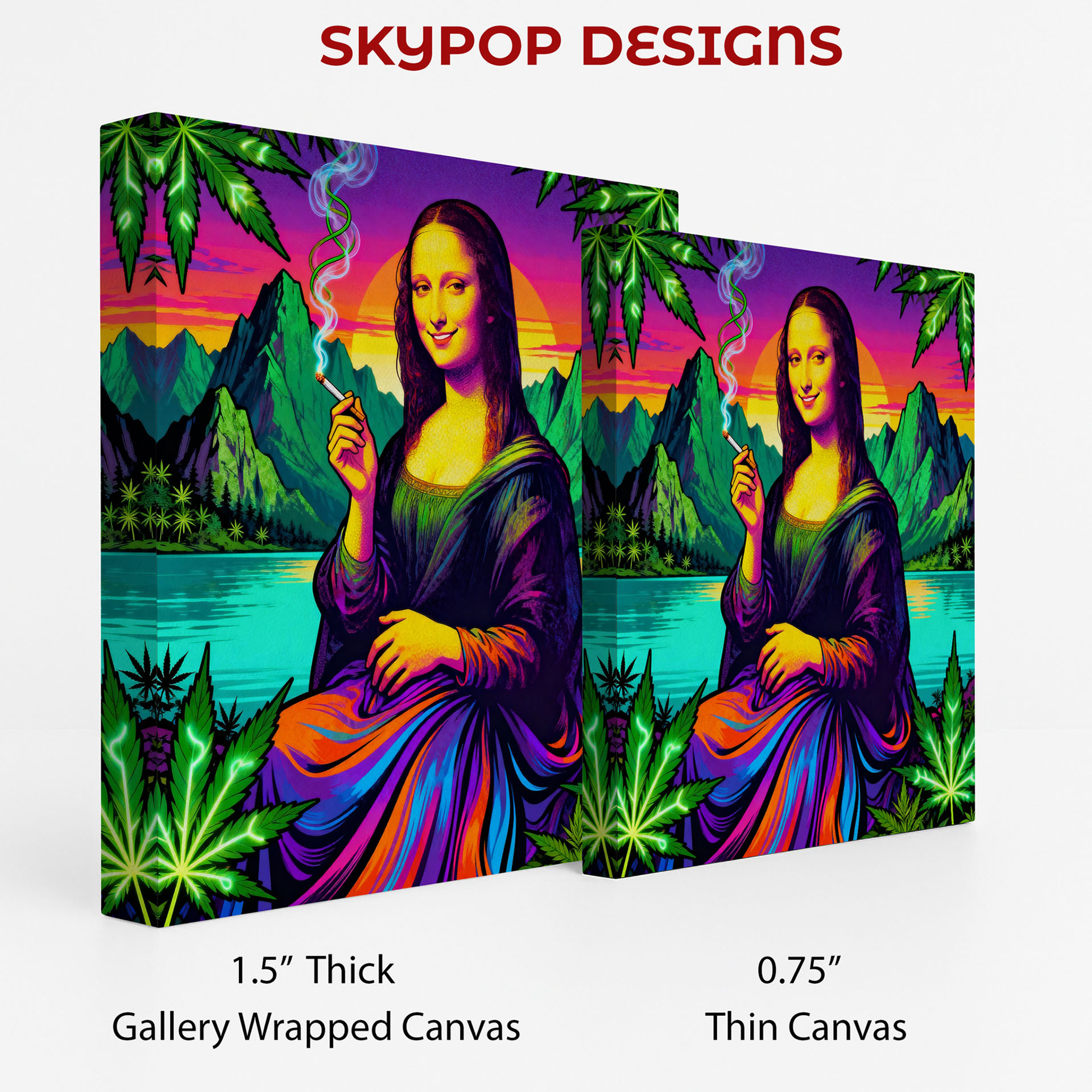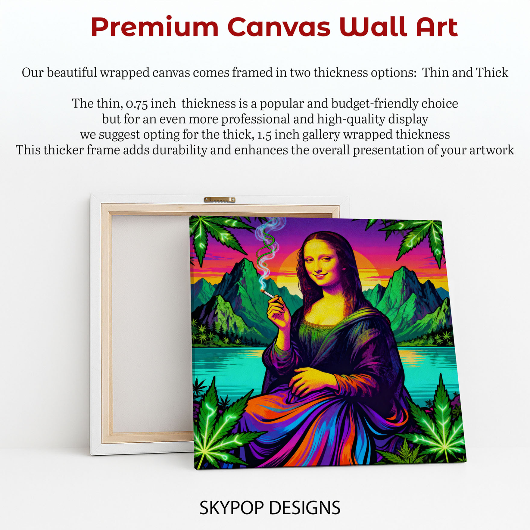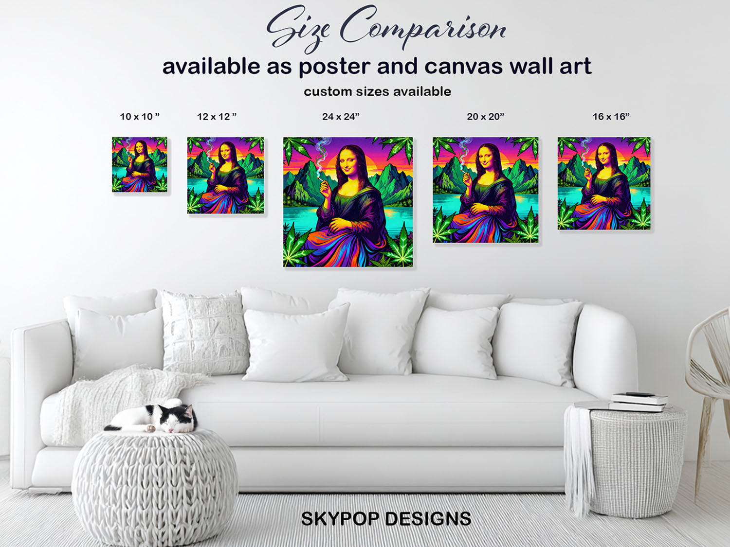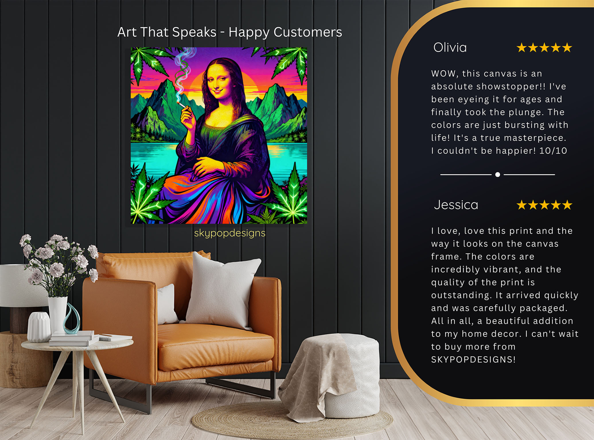 Elevate your space with this vibrant canvas wall art featuring a modern twist on the iconic Mona Lisa. This poster or canvas wall art transforms classic art into a pop art statement, perfect for adding a unique touch to your living room or game room decor. The striking multicolor palette, dominated by vibrant greens and purples with pops of yellow, creates a captivating and energetic focal point. This art piece is ideal for contemporary homes, bohemian settings, or anyone looking to inject personality into their office or bedroom. The bold lines and stylized marijuana leaf motifs bring a fresh, unexpected element to the timeless portrait, making this a true conversation starter. High-quality printing ensures the vivid colors and intricate details of this unique wall art are beautifully rendered. Whether you’re looking to enhance your modern decor or find a truly original gift for a special occasion, this “Mona Lisa’s Chill Vibes Art” canvas wall art offers lasting appeal. Celebrate individuality and artistic reinterpretation with this eye-catching poster. Transform your home into a space that reflects your bold style and appreciation for iconic imagery. Add this stunning piece of pop art canvas wall art to your collection today and inspire a vibrant atmosphere. This is more than just wall art; it’s a statement.