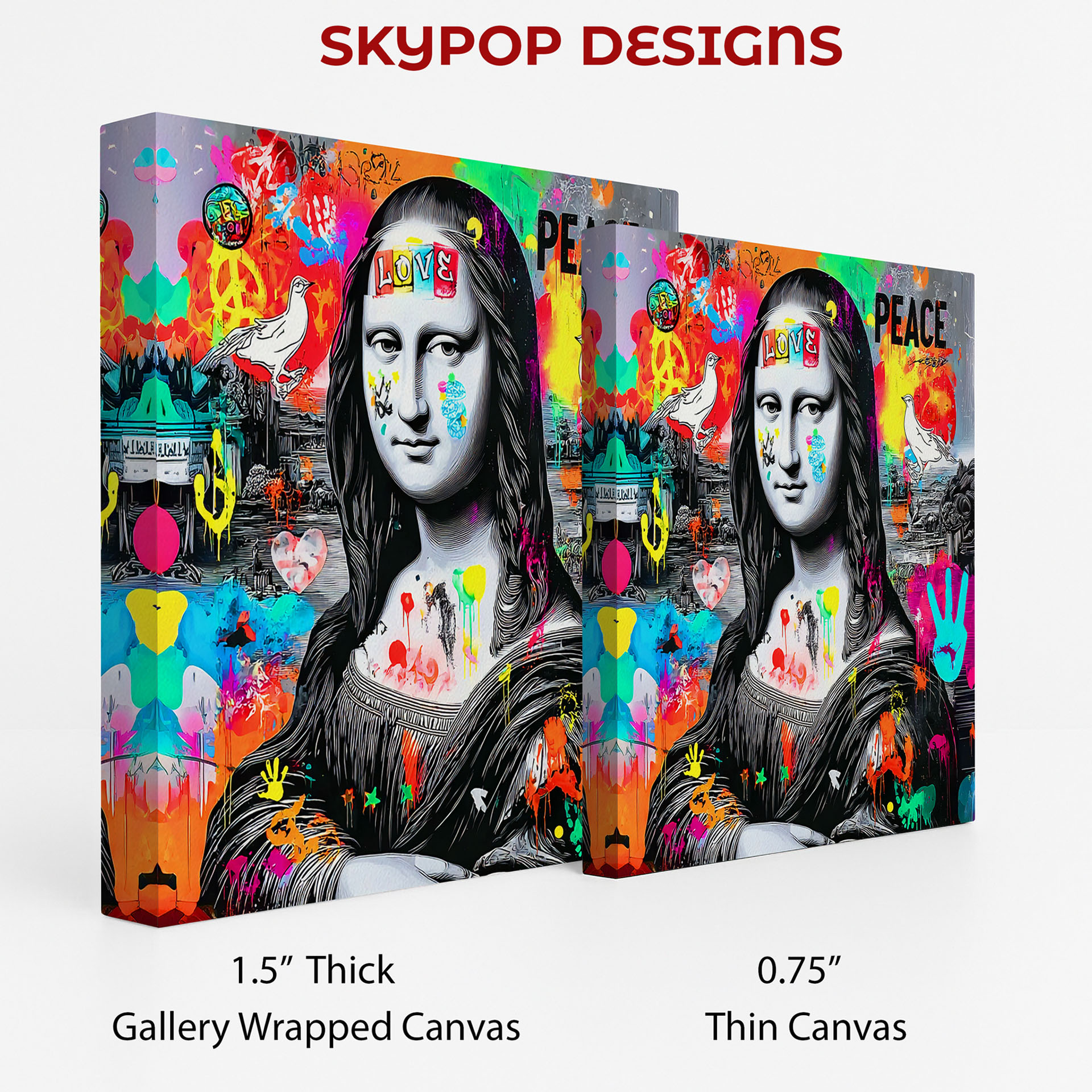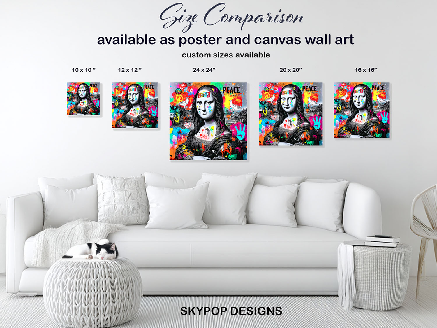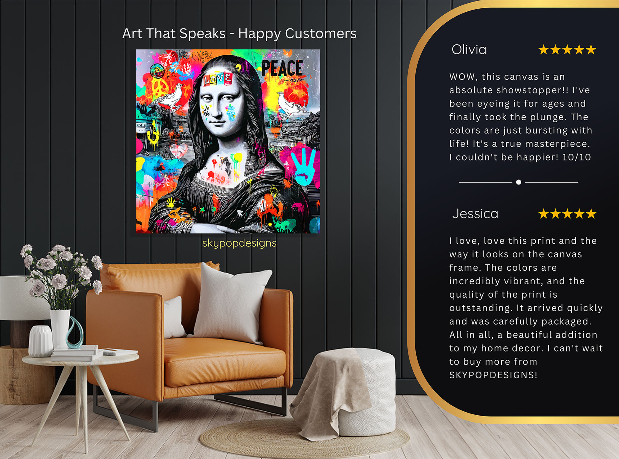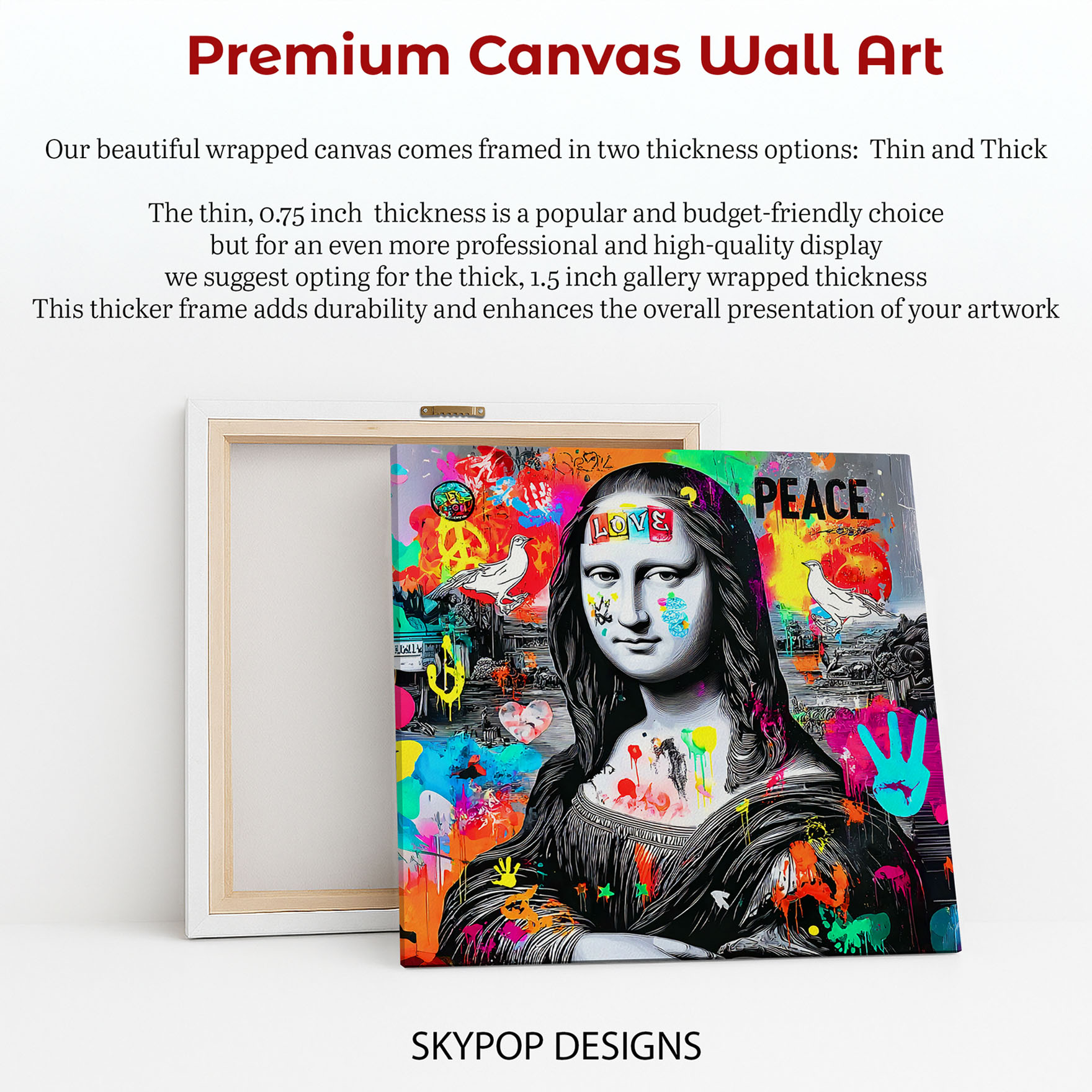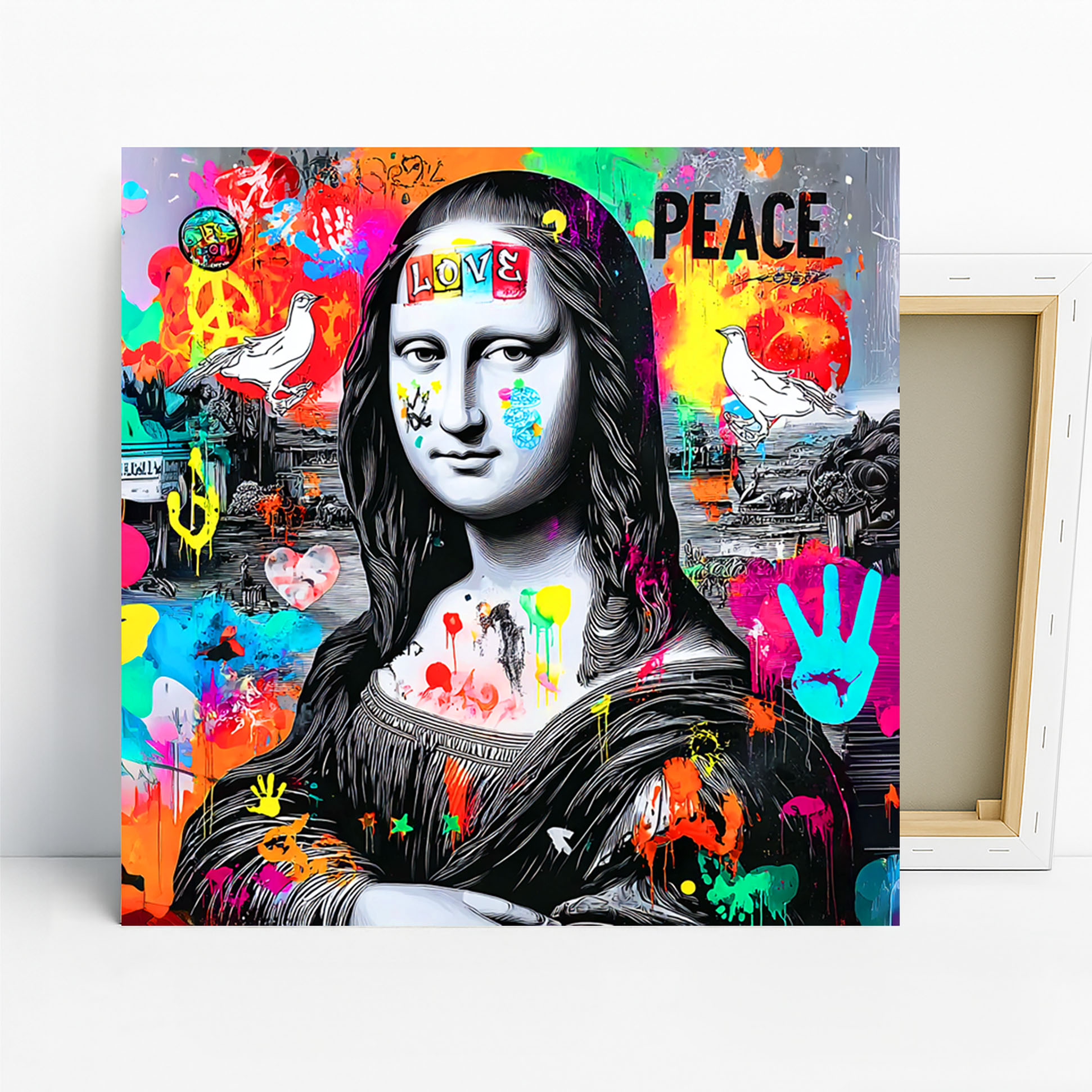 Elevate your space with this vibrant Mona Lisa canvas wall art, a striking fusion of classic artistry and bold street art. This captivating poster or canvas wall art transforms any room into a dynamic gallery, perfect for modern living rooms or eclectic bedrooms. Vibrant pops of multicolor, pink, and yellow contrast with the iconic black and white portrayal, creating a visually stunning statement. This artwork celebrates peace and love with symbols like doves and the word PEACE prominently displayed, making it ideal for inspiring spaces like offices or entryways. The energetic graffiti elements and bold colors inject a playful yet profound message into contemporary decor, making this wall art a true conversation starter. Whether you’re drawn to pop art’s iconic style or street art’s raw energy, this piece offers a unique way to express individuality. High-quality printing ensures the intricate details and vivid colors are preserved for a lasting impact. This canvas wall art is a perfect gift for art lovers, birthdays, or housewarmings, bringing a touch of modern sophistication and positive vibes. Transform your home with this eye-catching Mona Lisa print, a testament to enduring art reimagined for today’s world. Make a bold statement with this unique blend of classic and contemporary that will inspire and delight for years to come. Get your Mona Lisa’s Peace and Love canvas art today and infuse your home with personality and style.