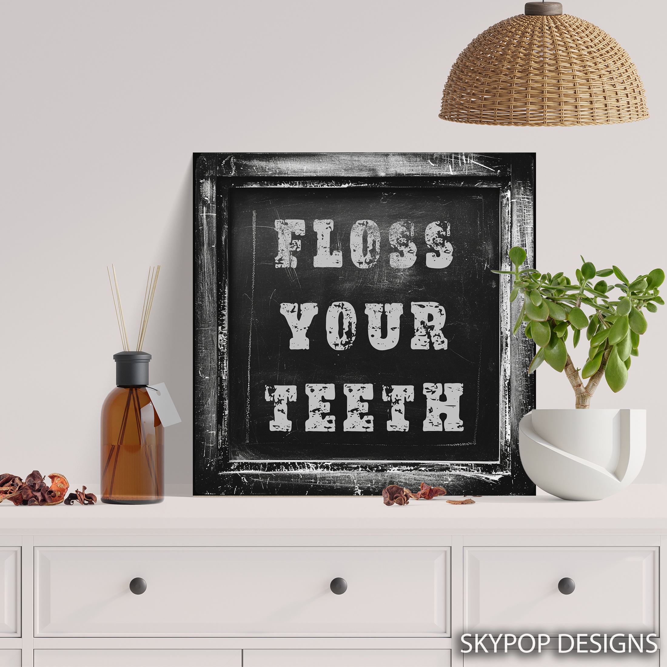 Transform your space with this powerful motivational canvas wall art featuring the bold message “FLOSS YOUR TEETH” in a gritty, urban-inspired design. This striking poster captures the essence of street art and vintage aesthetics, making it a perfect addition to contemporary living rooms or industrial-style offices. The distressed white lettering against a dark chalkboard background creates a high-contrast, eye-catching effect that demands attention and sparks conversation. Ideal for those who appreciate edgy, unconventional decor, this canvas art piece adds a touch of rebellious charm to any room. The weathered texture and rough-edged typography give the artwork an authentic, lived-in feel, perfect for urban loft spaces or modern bedrooms seeking character. Use this unique wall art to inject personality into minimalist interiors or to complement existing industrial decor themes. The universal message serves as a quirky daily reminder, making it a great gift for dental professionals or anyone with a sense of humor. Available in various sizes, this versatile canvas print adapts easily to different wall spaces, from cozy apartments to spacious game rooms. The monochromatic color scheme ensures it pairs well with any existing color palette, while the bold design makes a statement that’s impossible to ignore. Elevate your home or office decor with this edgy, motivational artwork that combines urban grit with a touch of whimsy. Transform your walls and inspire smiles with this unique piece of typographic art today.