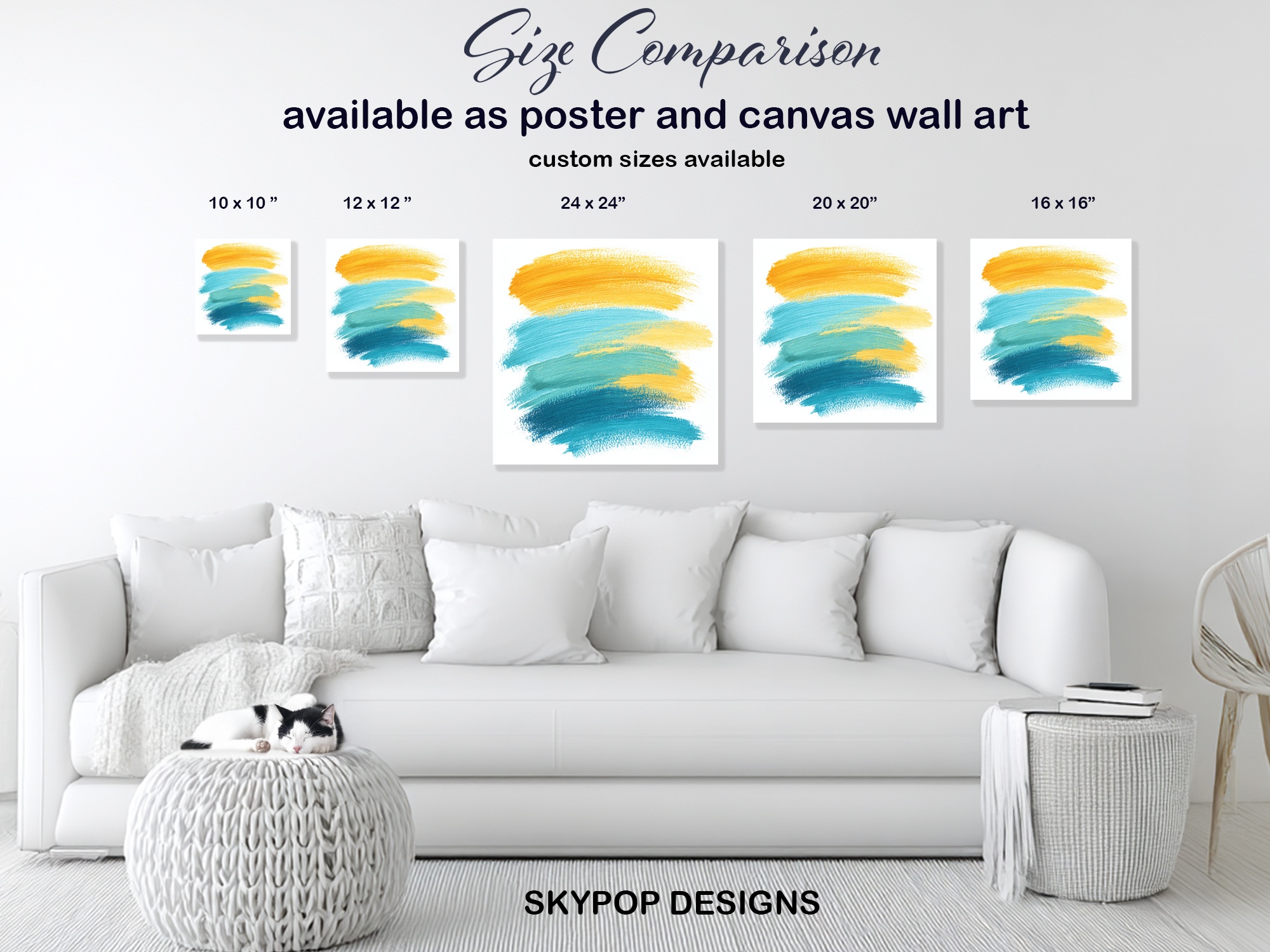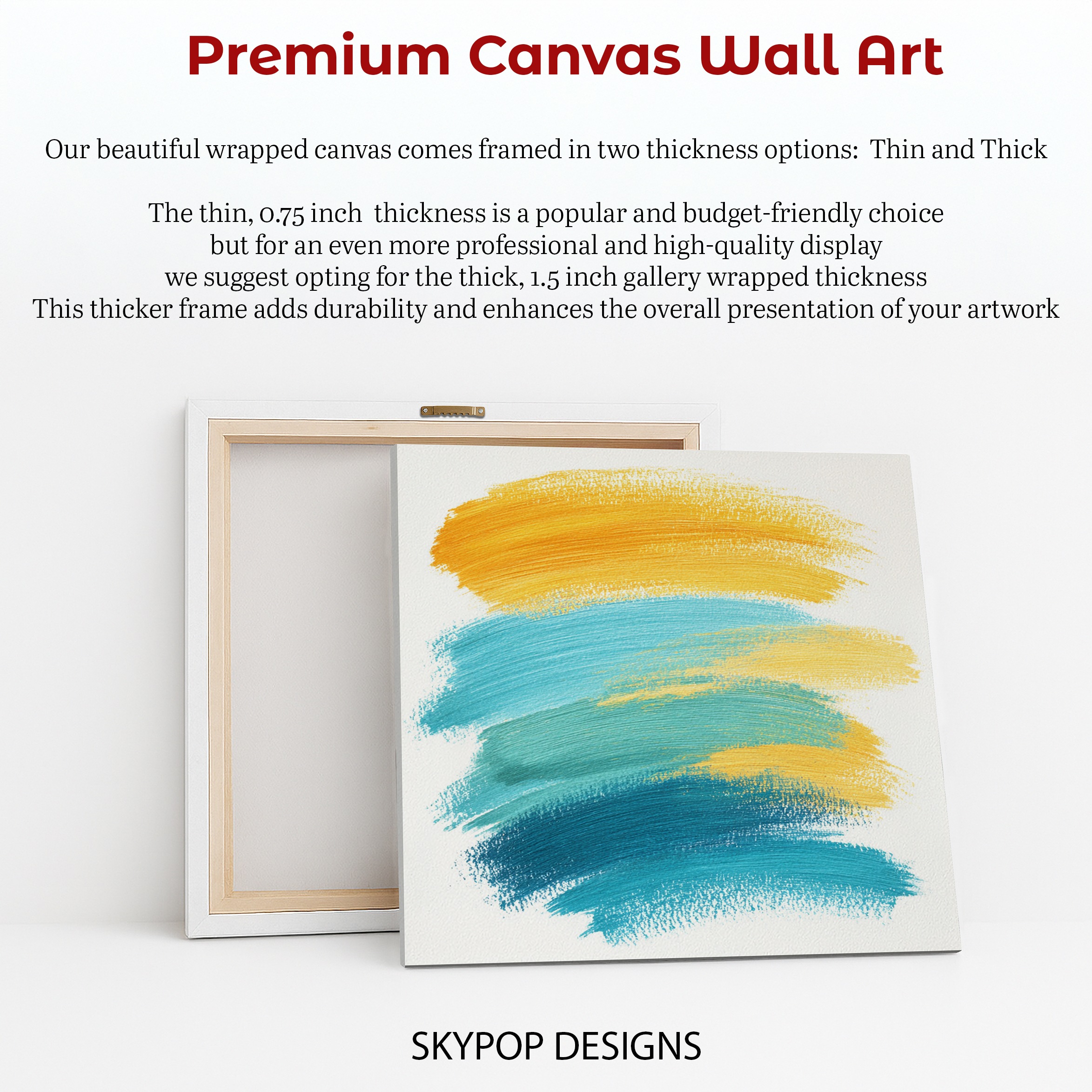 Bring the calming essence of a beach sunset into your home with this stunning abstract ocean canvas wall art. The vibrant brushstrokes of gold and yellow blend seamlessly into soothing blues and teals, creating a captivating visual that instantly transforms any space. Perfect for modern living rooms or coastal-inspired bedrooms, this eye-catching poster adds a pop of color and serenity to your walls. The contemporary style and minimalist approach make it an ideal choice for those looking to elevate their home decor with a touch of sophistication. As a versatile piece, this canvas art works beautifully in bathrooms for a spa-like atmosphere or in home offices to inspire creativity and calm. The interplay of warm and cool tones evokes the feeling of a peaceful sunset over the water, bringing a sense of tranquility to your daily life. Whether you’re a beach lover or simply appreciate the beauty of nature-inspired art, this piece offers a perfect balance of energy and relaxation. Suitable for various room sizes, this high-quality wall art makes a statement in any setting. Give your space an instant refresh or surprise a friend with a thoughtful housewarming gift that captures the essence of coastal living. Transform your walls and create a focal point that sparks conversation and admiration. Bring the beauty of an ocean sunset into your home today with this mesmerizing abstract canvas art.