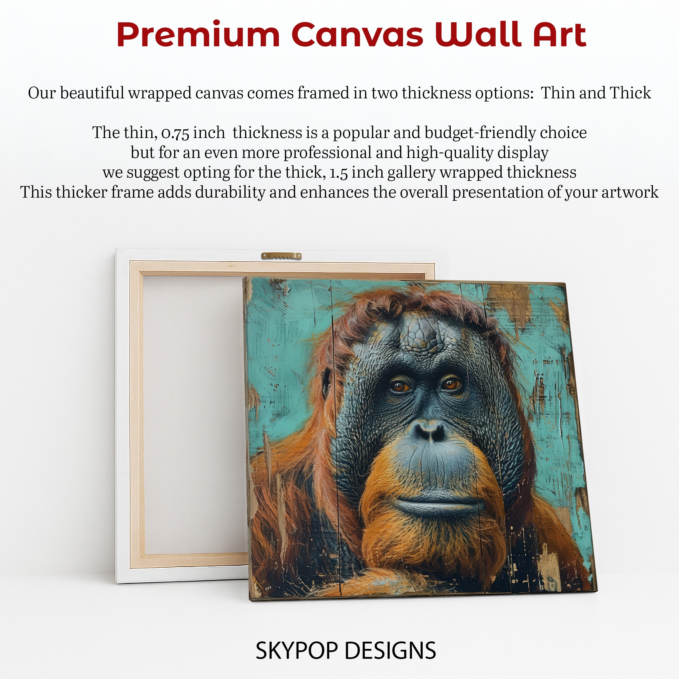 Keywords: Orangutan Wall Art, Canvas Print, Animal Art, Nature Art, Contemporary Art, Modern Decor, Rustic Decor, Living Room Art, Bedroom Decor, Office Wall Art, Entryway Decor, Brown Teal Art, Multicolor Wall Art, Orangutan Portrait, Wildlife Art, Home Decor, Statement Piece, Fine Art Print, Wall Decor, Textured Art, Soulful Gaze, Nature Lover Gift, Wildlife Enthusiast, Artistic Decor, Indoor Jungle, Bold Artwork, Eye-Catching Art, Unique Wall Art, Modern Animal Art, Canvas Wall Art