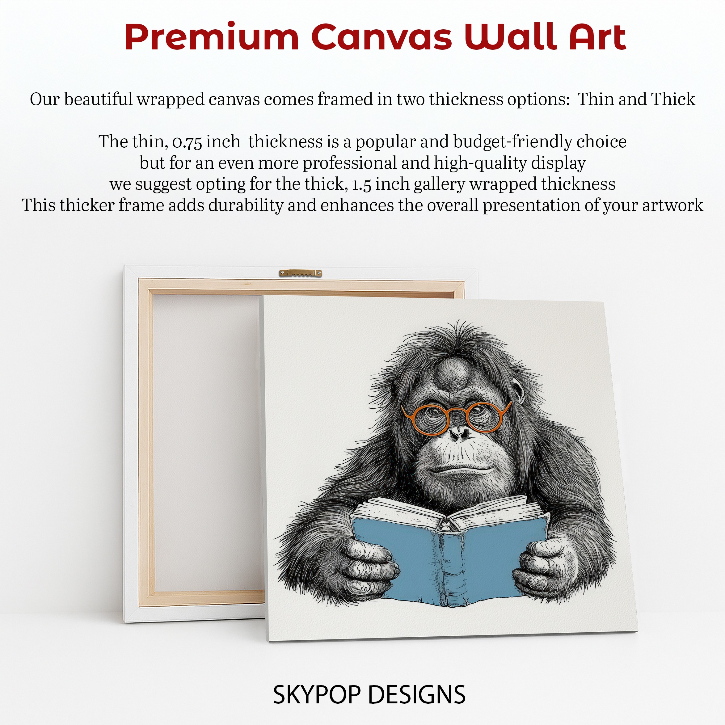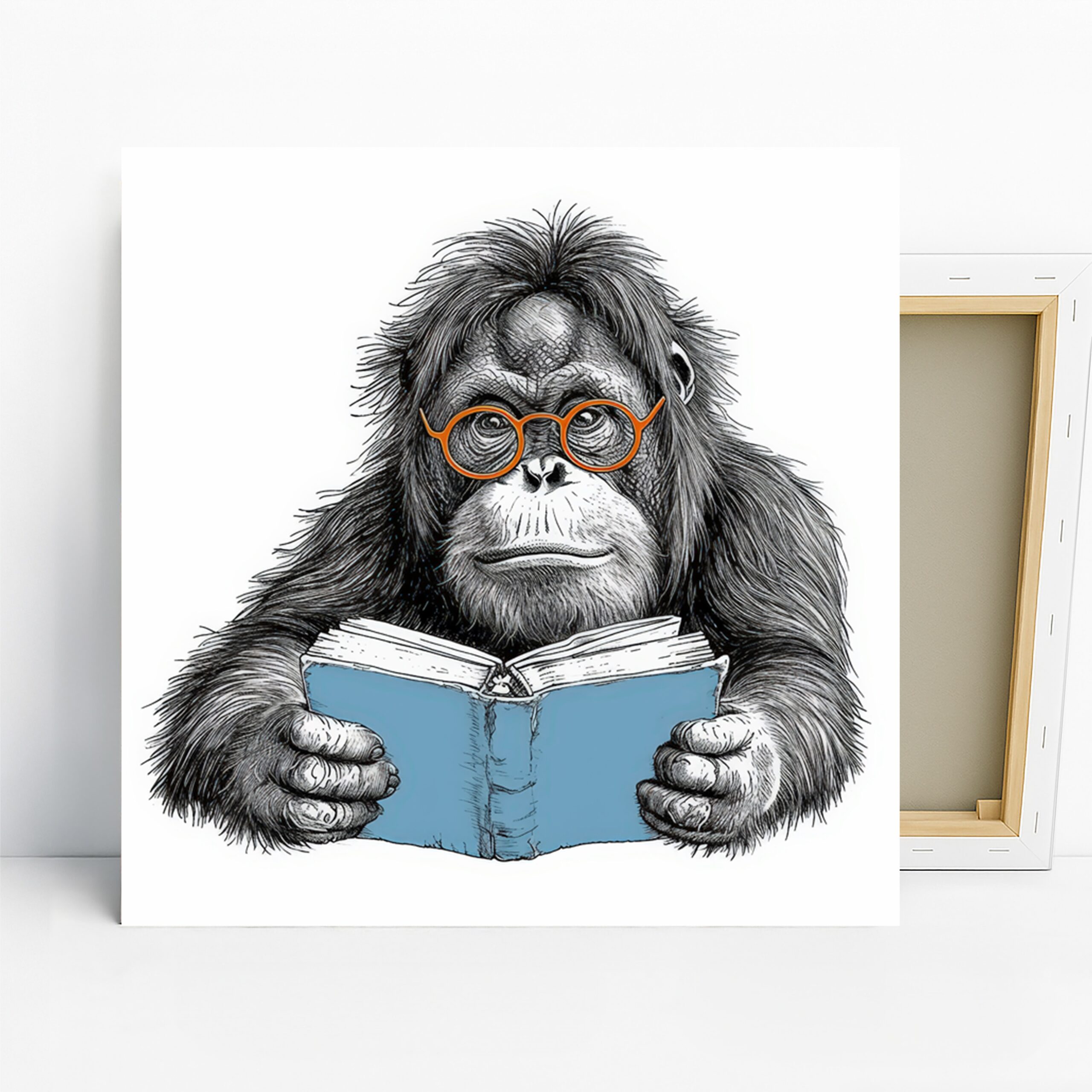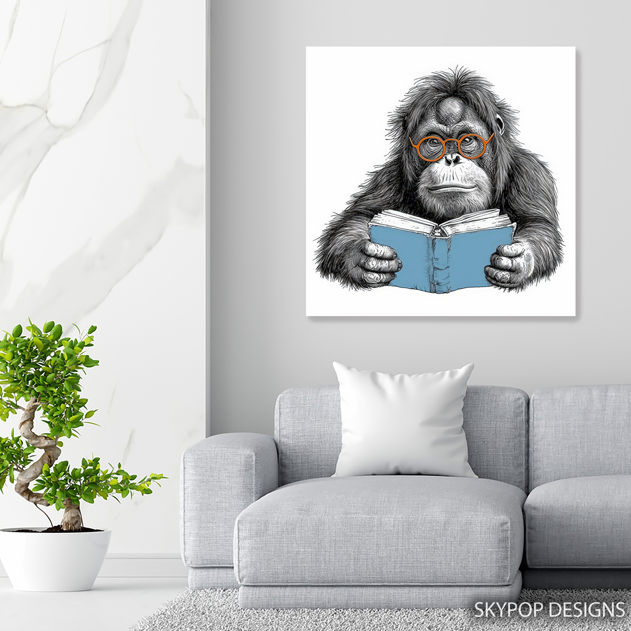Transform your space with this captivating Orangutan reading canvas wall art. This striking piece showcases a whimsical orangutan engrossed in a book, complete with stylish orange glasses, offering a unique blend of intelligence and charm. The detailed sketch-like quality combined with the subtle blue of the book creates a visually engaging poster that is perfect for any modern living room or a cozy library. This orangutan wall art is ideal for adding personality to contemporary or bohemian decor styles, making a sophisticated statement in your office or bedroom. The contrast between the detailed rendering of the orangutan and the minimalist blue background enhances its impact, bringing a touch of thoughtful contemplation to your home. This versatile canvas print serves as a wonderful conversation starter and a great gift for book lovers, animal enthusiasts, or anyone looking to elevate their home decor with something truly special. High-quality printing ensures the fine details of the artwork, from the orangutan’s expressive eyes to the texture of the fur, are beautifully preserved. Whether you are looking for modern wall decor or a unique piece to inspire your study, this orangutan artwork provides both aesthetic appeal and intellectual charm. Elevate your surroundings with this distinctive piece of animal art that celebrates curiosity and individuality. Add this eye-catching orangutan poster to your collection and bring a touch of refined whimsy to your walls today.