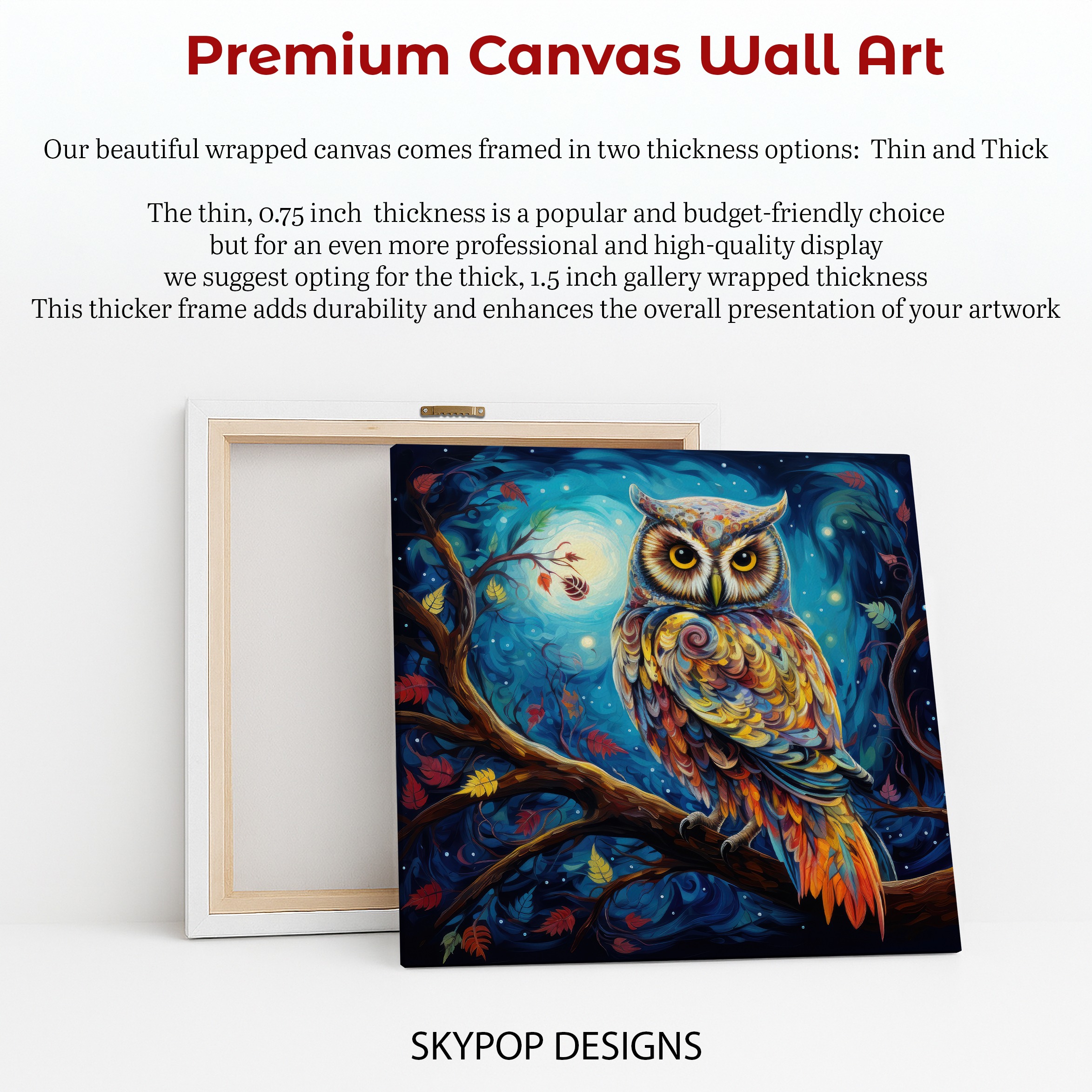 Keywords: Owl Canvas Art, Nature Art, Animal Art, Abstract Art, Bohemian Decor, Contemporary Decor, Modern Decor, Living Room Art, Bedroom Wall Art, Office Decor, Entryway Art, Multicolor Wall Art, Blue Yellow Art, Orange Accent Art, Whimsical Art, Owl Print, Moonlit Scene, Forest Art, Wildlife Art, Home Decor, Wall Decor, Canvas Print, Gift for Home, Housewarming Gift, Unique Artwork, Artistic Flair, Night Sky Art, Enchanting Decor, Vibrant Colors, Inspirational Art