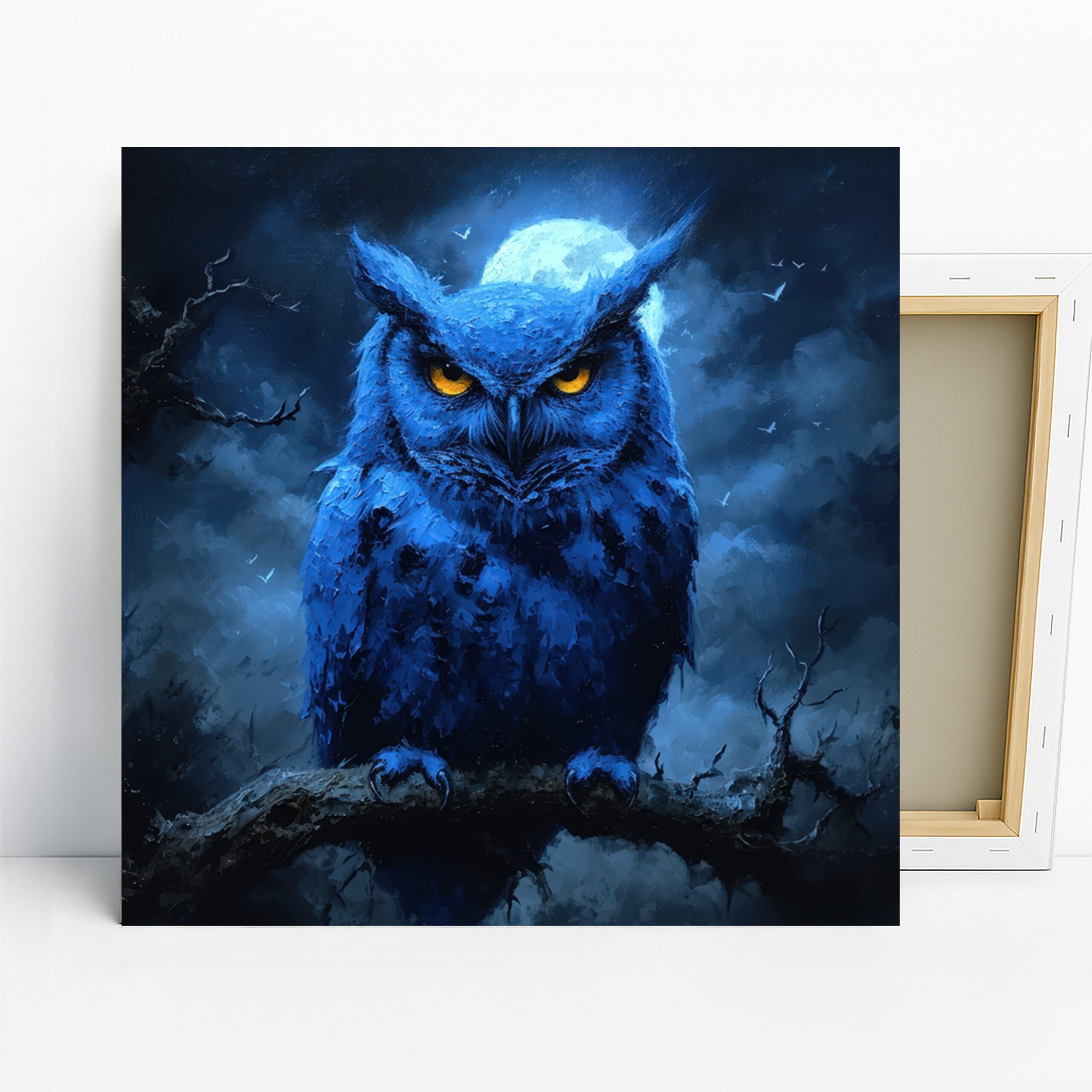 Transform your space with this striking owl canvas wall art, featuring a captivating owl with piercing yellow eyes against a deep blue, moonlit backdrop. The textured brushwork and abstract rendering create a powerful visual statement, perfect for adding a touch of mystique to any modern or contemporary living room. This stunning poster or canvas wall art will elevate your bedroom or office decor, bringing a sense of nocturnal beauty and intrigue. The rich blue hues evoke feelings of calm and mystery, enhanced by the vibrant contrast of the owl’s illuminated eyes, making it a truly mesmerizing piece of wall decor. Ideal for those who appreciate minimalist yet impactful art, this owl imagery provides a sophisticated focal point for your home. It’s a fantastic gift option for nature lovers or anyone seeking to add unique wall art to their collection, celebrating the enigmatic charm of the owl. This high-quality canvas print captures the depth and mood of the original artwork, ensuring it remains a conversation starter. Create an atmosphere of serene contemplation or powerful presence with this versatile artwork, a true statement piece for your home. Embrace the allure of the night sky and the wisdom of the owl with this captivating canvas wall art. Elevate your interior design with the enduring appeal of animal-themed art, designed to inspire and enchant. Discover the magic of this owl artwork and make your walls come alive with personality and style.