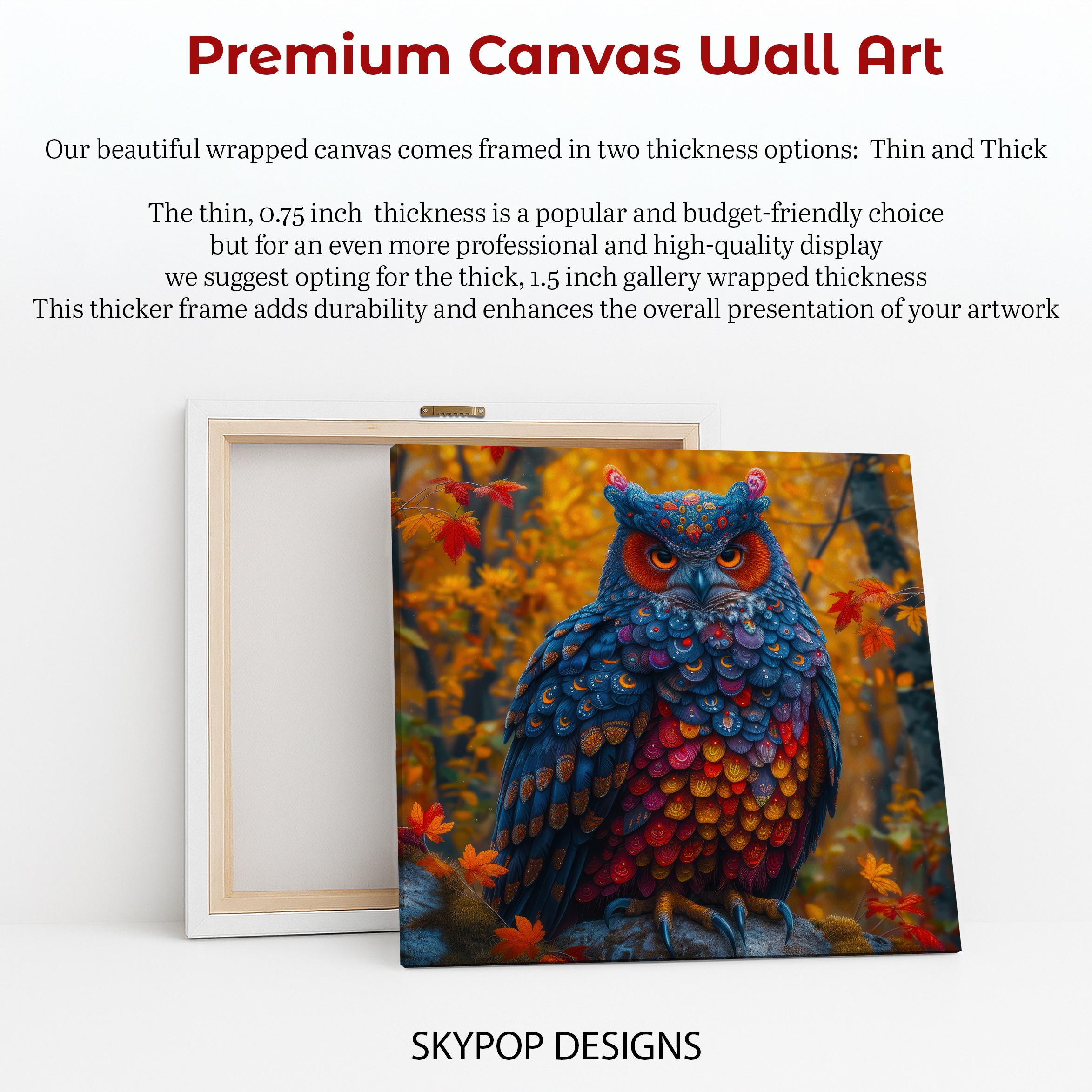 Transform your home with this captivating owl canvas wall art, featuring a majestic owl in a vibrant autumn forest. This striking piece of nature art, also available as a poster, showcases the owl’s intricately detailed feathers in a multicolor palette of blues, oranges, and reds, creating a truly unique focal point. The rich colors evoke feelings of warmth, mystery, and the vibrant energy of fall, making this canvas wall art perfect for adding a touch of magic to any space. Ideal for bohemian or traditional decor styles, this artwork can elevate your living room, bedroom, or dining room with its stunning visual appeal. The detailed craftsmanship of this owl poster captures the essence of wildlife art, making it a conversation starter and a source of inspiration. Whether you’re looking for a statement piece for your entryway or a cozy addition to your bedroom, this versatile artwork fits seamlessly into various interior designs. Its vibrant hues and artistic composition offer a sense of wonder and will enhance your home’s atmosphere. This high-quality print makes a thoughtful gift for nature lovers or anyone seeking to bring the beauty of the outdoors inside. Elevate your wall decor collection with this exceptional owl artwork, a perfect blend of animal artistry and natural splendor. Bring the captivating beauty of autumn into your home with this exquisite owl canvas wall art today.