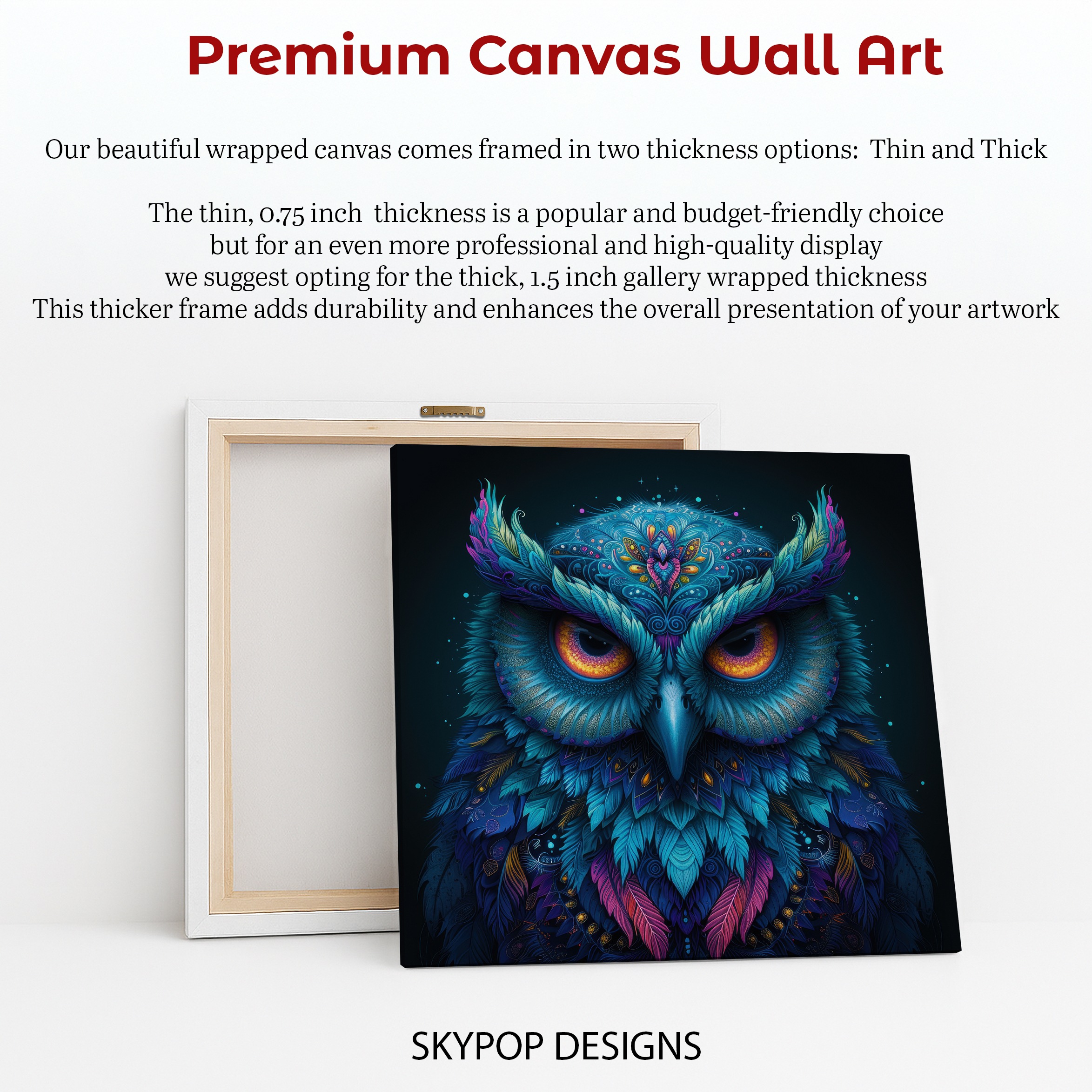 Transform your living space with this stunning owl canvas wall art, a captivating piece that blends abstract and nature art with a mystical allure. This intricate owl poster features a symphony of blues, purples, and gold, creating a vibrant and eye-catching focal point ideal for bohemian or contemporary decor styles. The detailed, almost surreal patterns on the owl’s feathers evoke a sense of wonder and wisdom, making this canvas wall art perfect for your living room, bedroom, or office. Its striking color palette brings a touch of the extraordinary to any room, offering a mood-enhancing visual experience. This versatile artwork is a perfect gift for nature lovers or anyone seeking unique wall decor for housewarmings or birthdays. Showcase your love for the natural world with this beautiful owl canvas art, designed to impress and inspire. The rich hues and imaginative design will elevate your home’s atmosphere, adding a touch of magic to your interior. Invest in this high-quality poster and let the wisdom of the owl transform your environment. This striking piece of animal art is sure to be a conversation starter and a cherished addition to your home decor collection. Elevate your walls today with this extraordinary owl artwork.