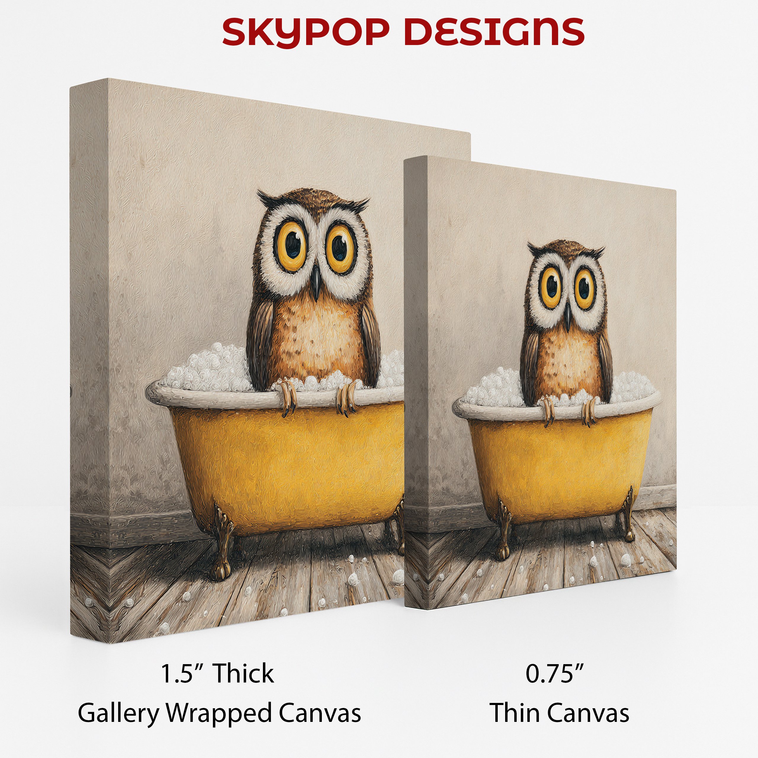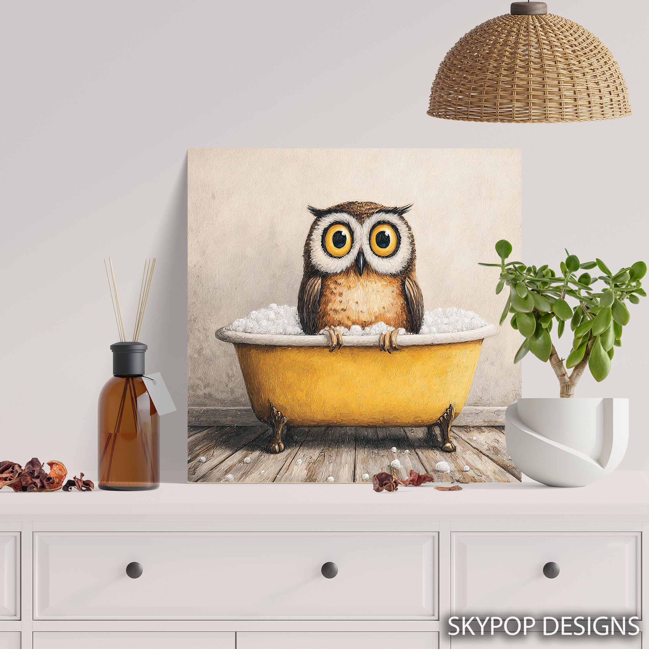 Elevate your space with this adorable owl bath canvas wall art that’s sure to bring a smile to your face. This whimsical poster features a wide-eyed owl perched in a bright yellow bathtub, creating an unexpected and charming scene. Perfect for modern bathrooms or children’s bedrooms, this unique piece adds a playful touch to any room’s decor. The owl’s expressive yellow eyes and fluffy brown feathers contrast beautifully with the crisp white bubbles, creating a visually striking composition. Ideal for animal lovers and those with a quirky sense of style, this canvas art effortlessly blends humor with contemporary design. The minimalist background allows the owl and bathtub to take center stage, making it a versatile addition to various color schemes. Whether you’re looking to add a pop of color to your living room or create a fun focal point in your bathroom, this owl artwork delivers. The high-quality printing captures every detail, from the owl’s textured feathers to the smooth curves of the bathtub. Give your home a personality boost with this conversation-starting piece that’s sure to delight guests of all ages. Transform your space today with this charming owl bath wall art that celebrates the lighter side of life.