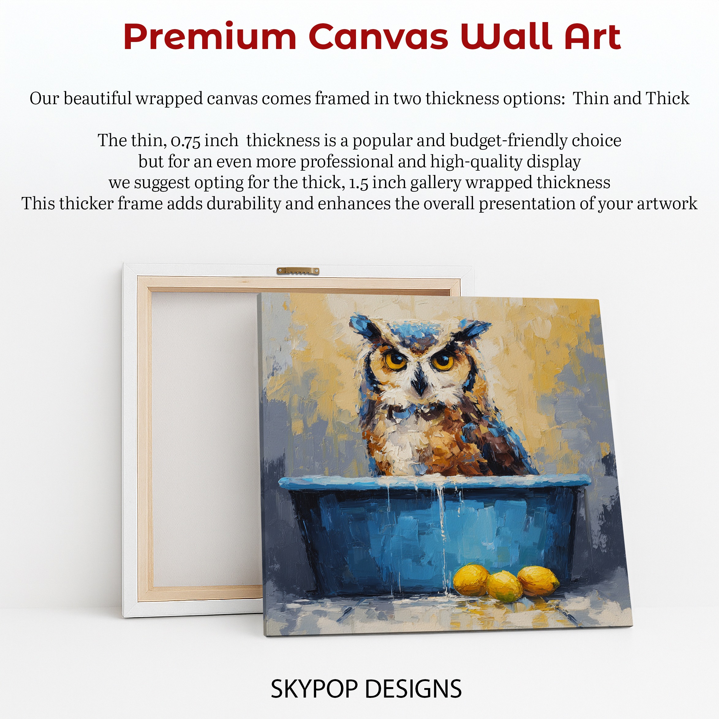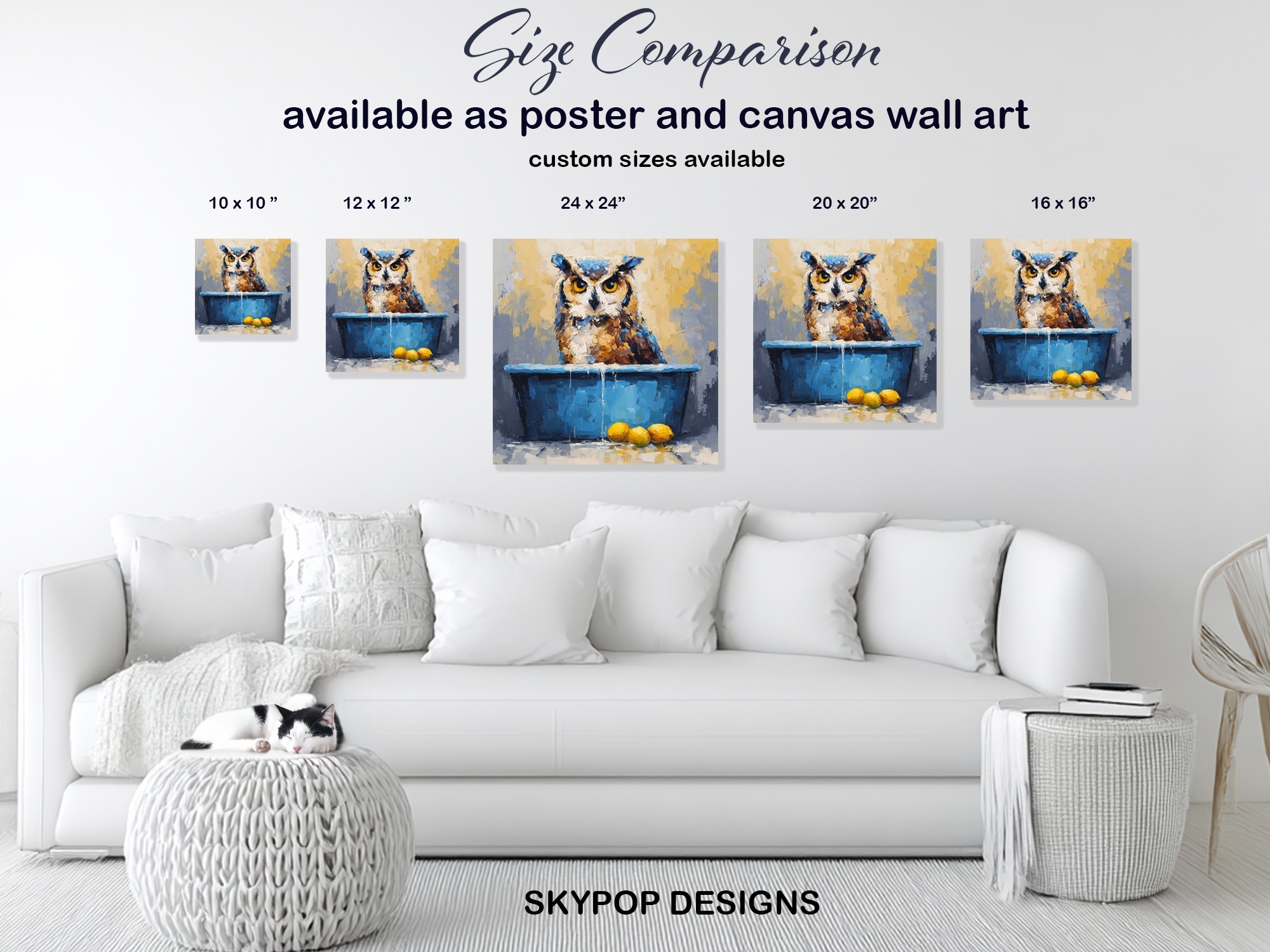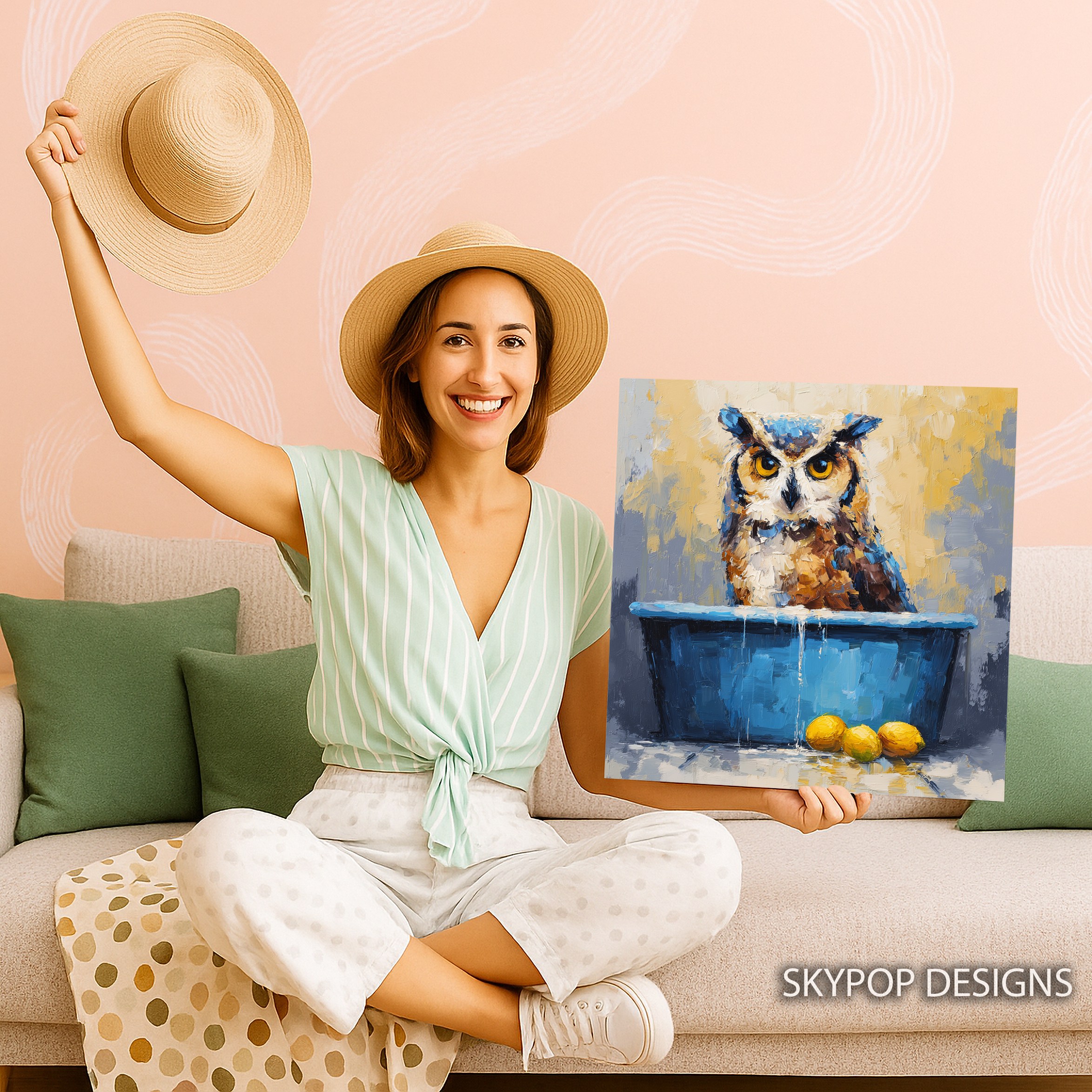 Keywords: Owl canvas art, Bathing owl print, Whimsical owl art, Impressionism owl painting, Animal wall art, Modern home decor, Bohemian living room art, Contemporary bedroom art, Blue and yellow art, Brown owl artwork, Cute animal poster, Bathroom wall decor, Children’s room art, Humorous art print, Warm color accent, Playful wall art, Textured canvas art, Statement wall art, Unique home accent, Gift for owl lovers, Housewarming gift idea, Birthday gift art, Art for nature lovers, Charming wall decor, Vibrant color art, Bold brushstrokes print, Serene wall art, Joyful home decor, Owl bath canvas, Whimsical bath art
