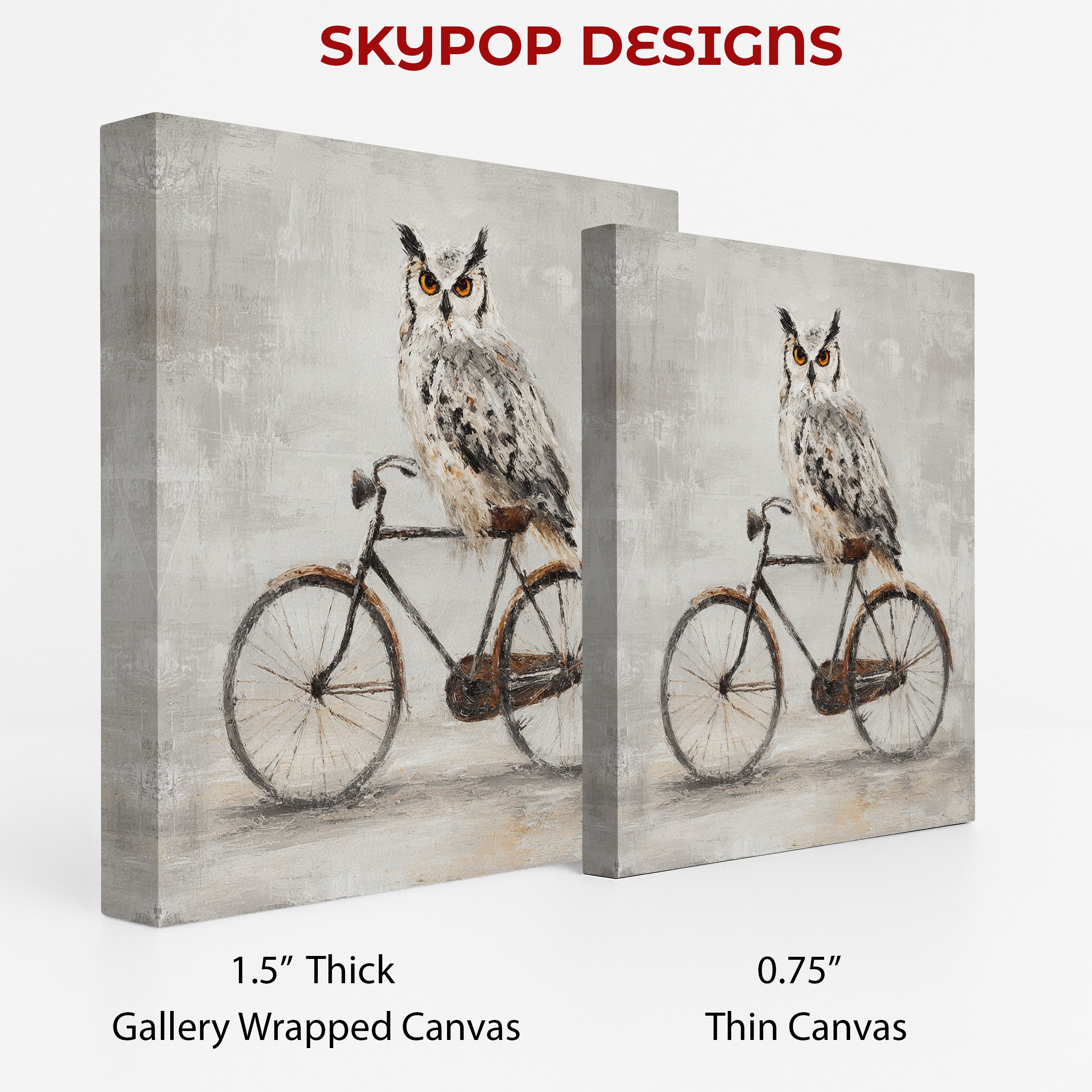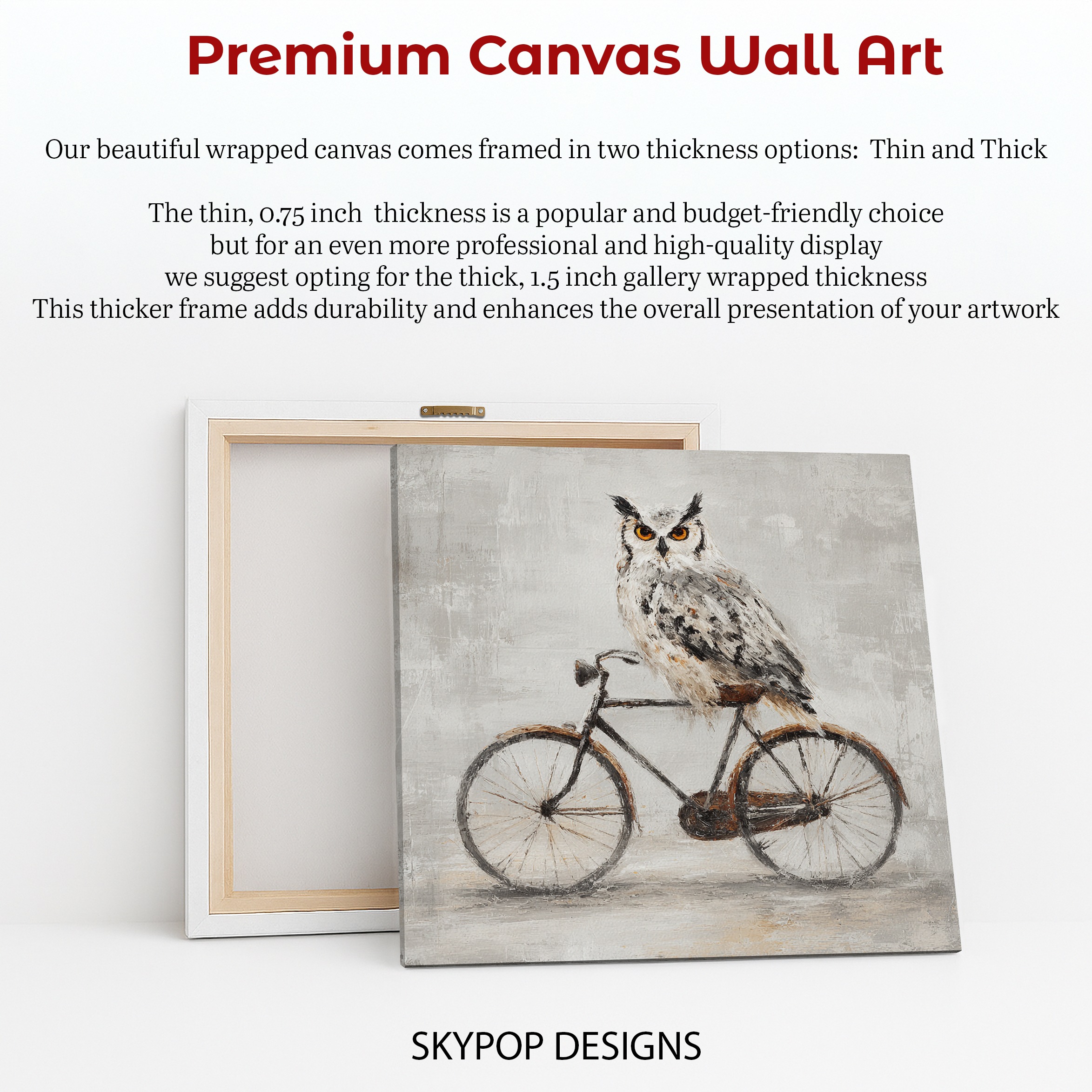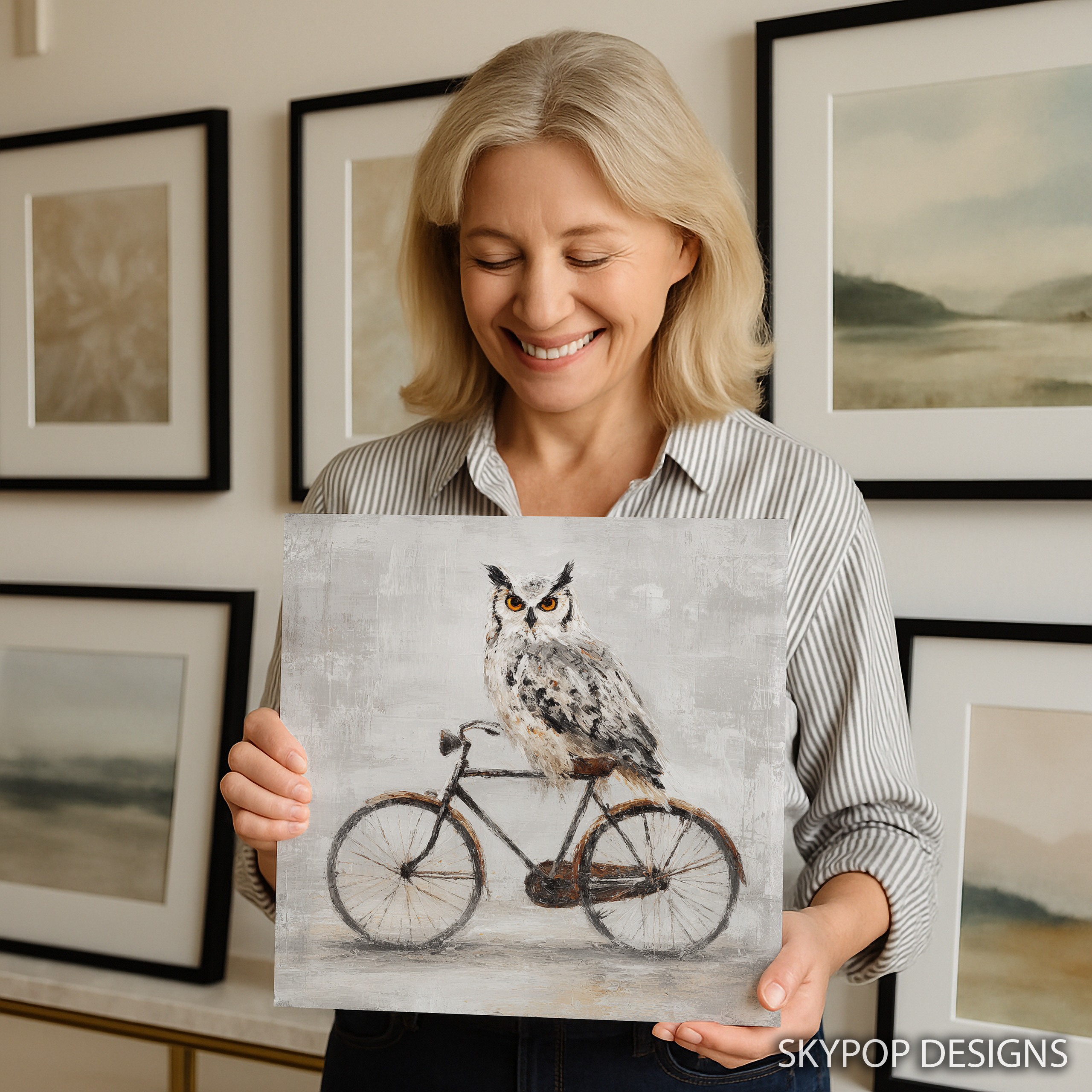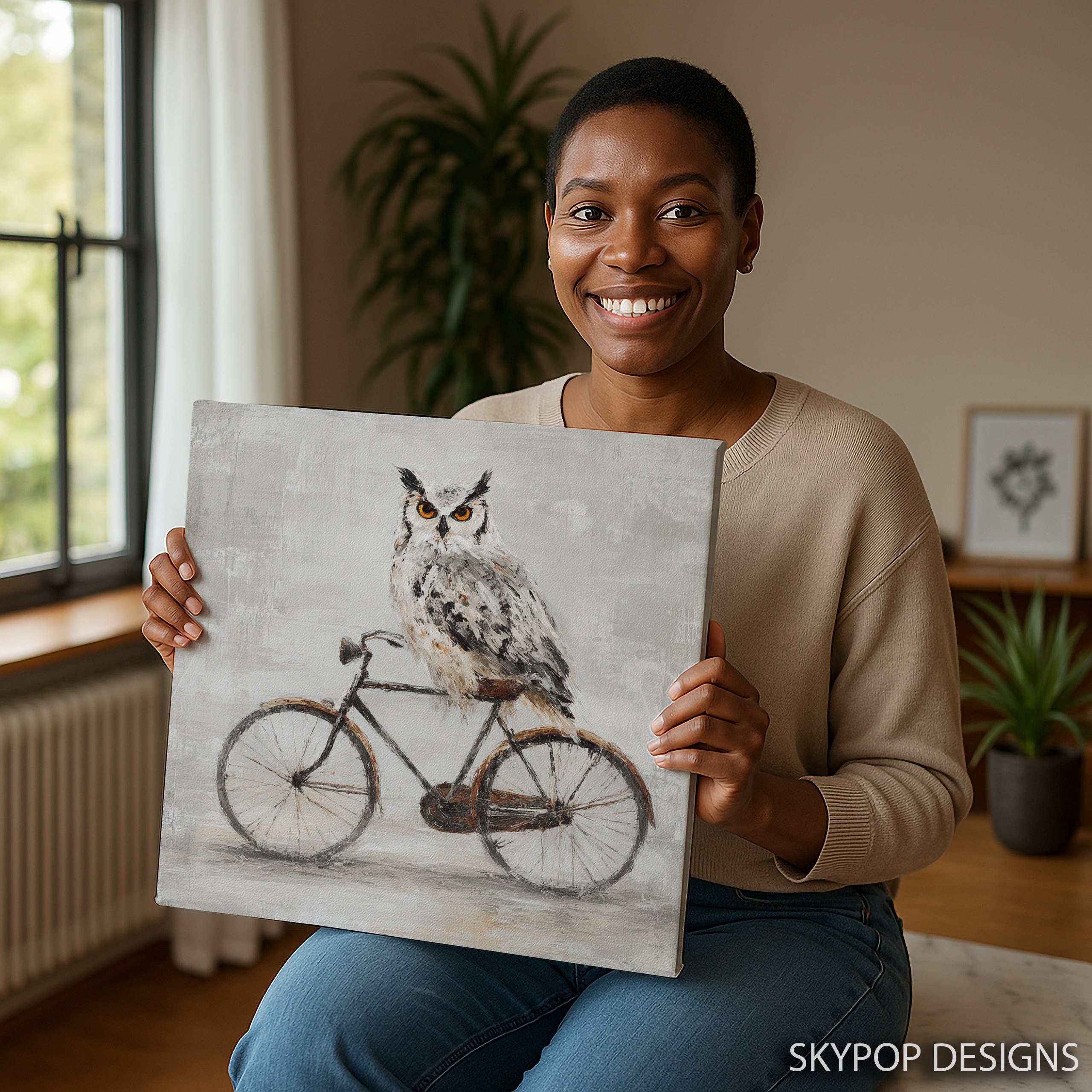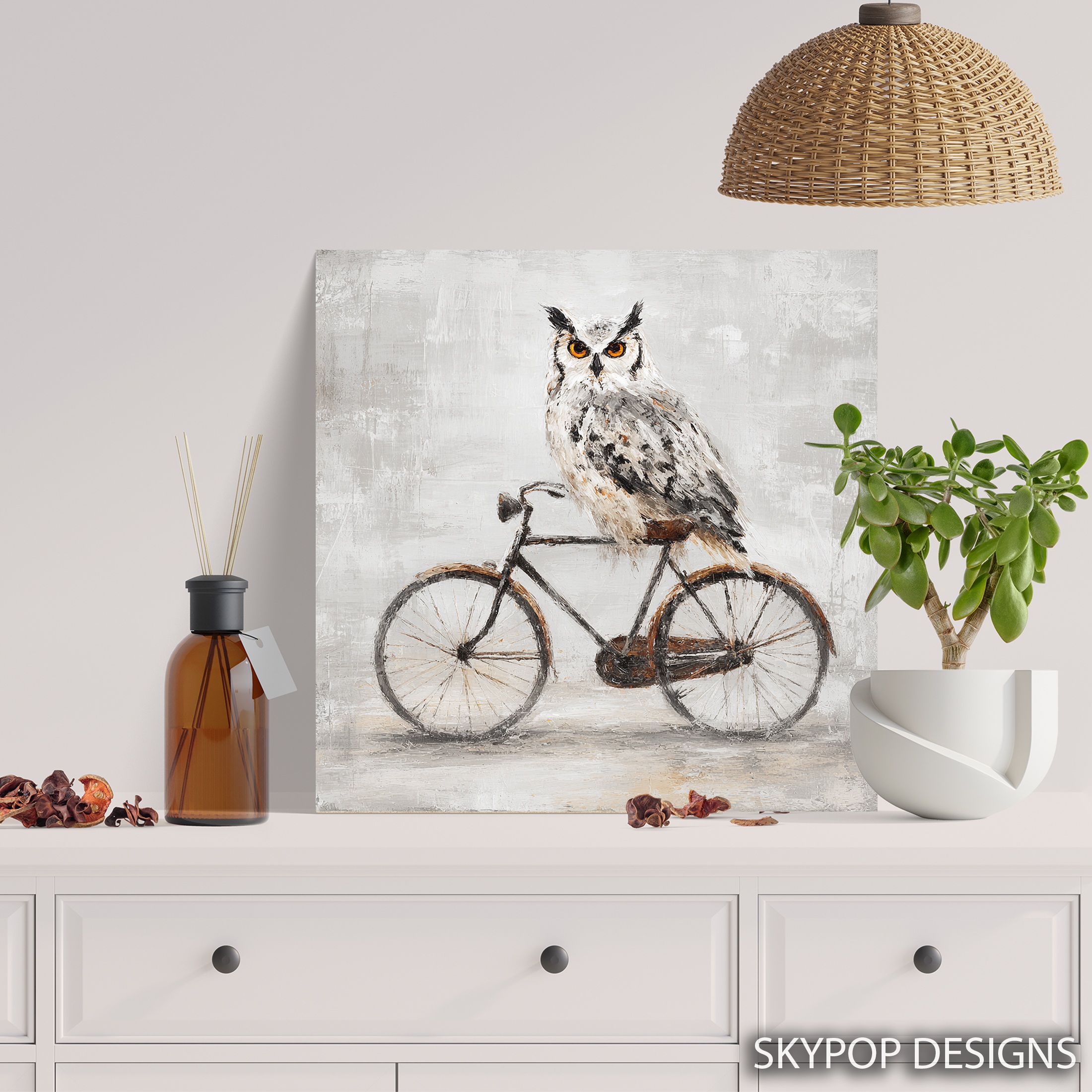 Transform your space with this captivating owl on bicycle canvas wall art, blending whimsy and modern charm. This striking poster features a majestic owl perched atop a vintage bicycle, creating an unexpected and eye-catching focal point for any room. Perfect for contemporary living rooms or eclectic office spaces, this unique wall art adds character and intrigue to your decor. The owl’s piercing orange eyes and detailed feathers contrast beautifully against the rustic bicycle, symbolizing wisdom and adventure in one compelling image. Ideal for animal lovers and cycling enthusiasts alike, this canvas art piece sparks conversation and adds personality to minimalist or rustic interiors. The textured brushwork and muted color palette give depth and sophistication to the composition, ensuring this wall art remains engaging from every angle. Great as a housewarming gift or to refresh your seasonal decor, this versatile artwork adapts effortlessly to various interior styles. High-quality printing captures every intricate detail, from the owl’s expressive face to the bicycle’s vintage charm. Whether displayed in a cozy bedroom, modern home office, or playful children’s room, this piece brings a touch of nature and nostalgia to your walls. Elevate your home’s atmosphere with this unique blend of animal art and contemporary style that celebrates the unexpected. Make this quirky owl and bicycle artwork the highlight of your wall art collection today.