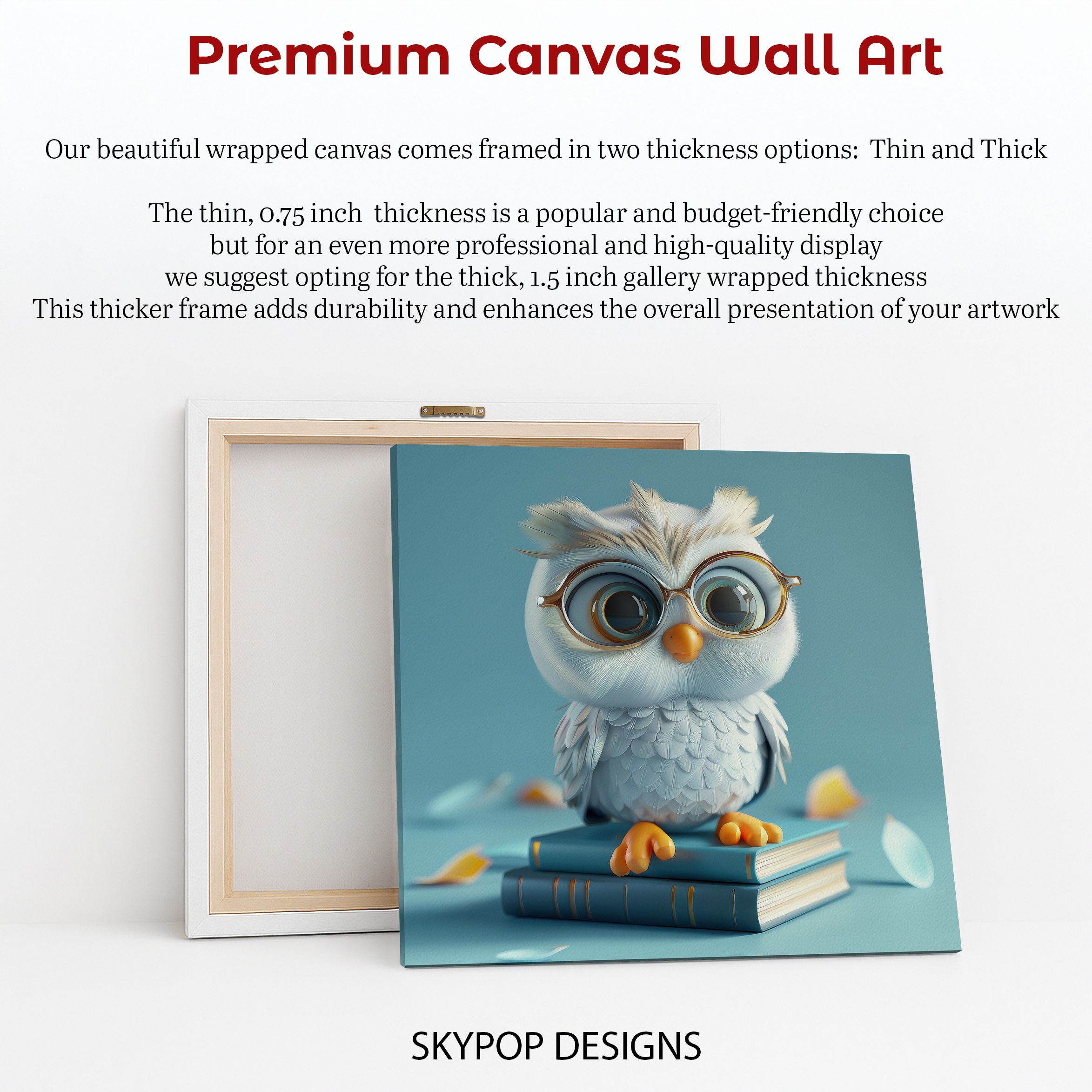 Transform your space with this adorable owl canvas wall art, perfect for sparking imagination and joy. This charming owl poster features a cute, wise owl perched on a stack of blue books, creating a whimsical and engaging piece of wall decor. The soft blue and white color palette, accented with pops of yellow from fallen leaves, evokes a sense of calm and intellectual curiosity. This canvas wall art is ideal for a child’s room, a cozy reading nook, or a stimulating office space. The playful, stylized design makes it a standout addition to any modern or Scandinavian decor. Whether you’re looking for a unique wall art print to celebrate the love of reading or a delightful gift for a student’s birthday, this owl artwork delivers charm and personality. The high-quality print captures the detail of the owl’s fluffy feathers and big, curious eyes, making it a captivating focal point. Enhance your home with this delightful poster that brings a touch of nature and whimsy to your interior design. Available in various sizes, this owl wall art is printed on premium canvas for lasting beauty. Elevate your decor with this inspirational piece that celebrates learning and the wonder of childhood. Make your walls talk with this sweet owl art, a perfect blend of cute animal art and sophisticated interior styling. Bring a smile to your face and add this enchanting owl canvas today.