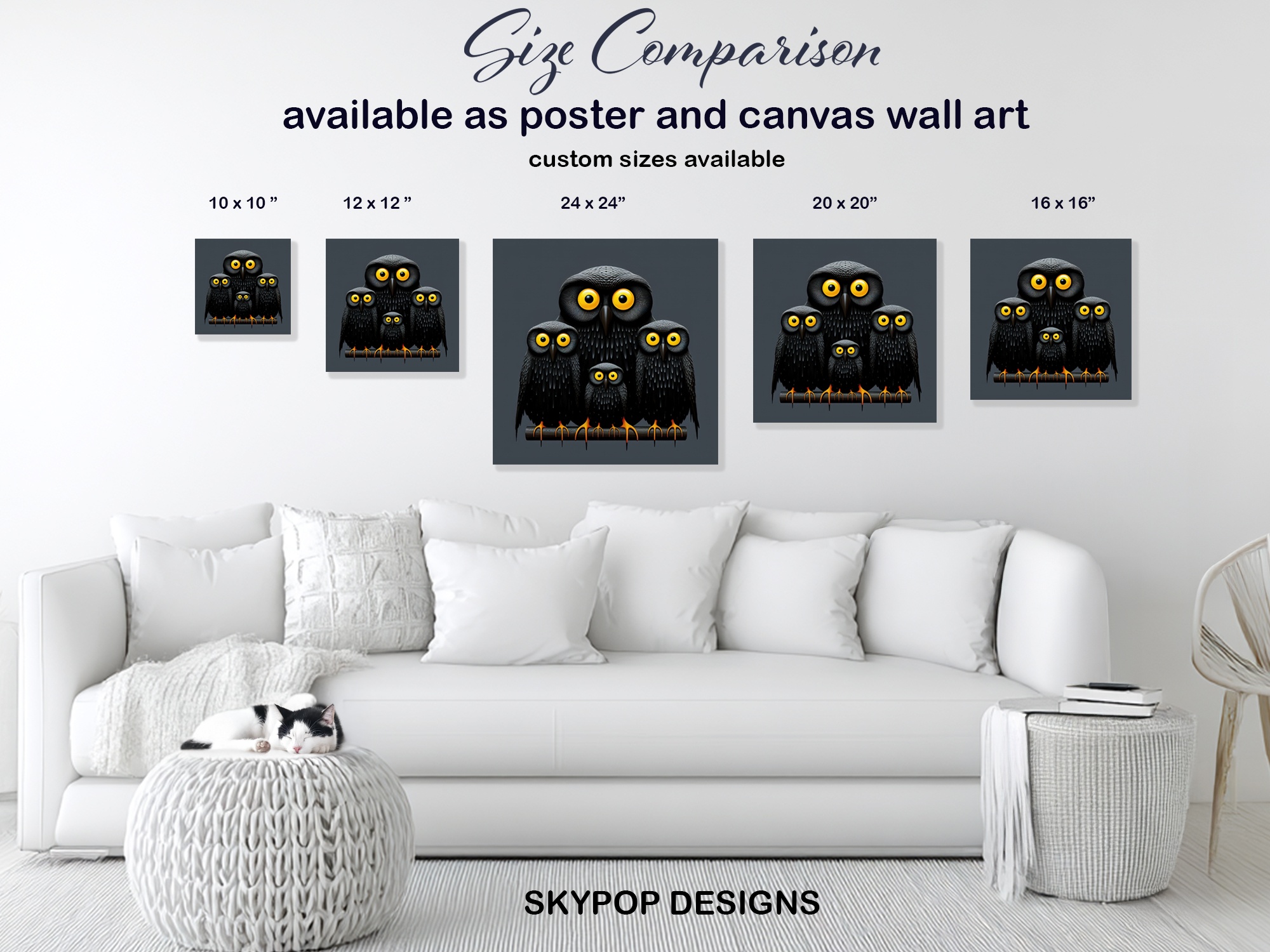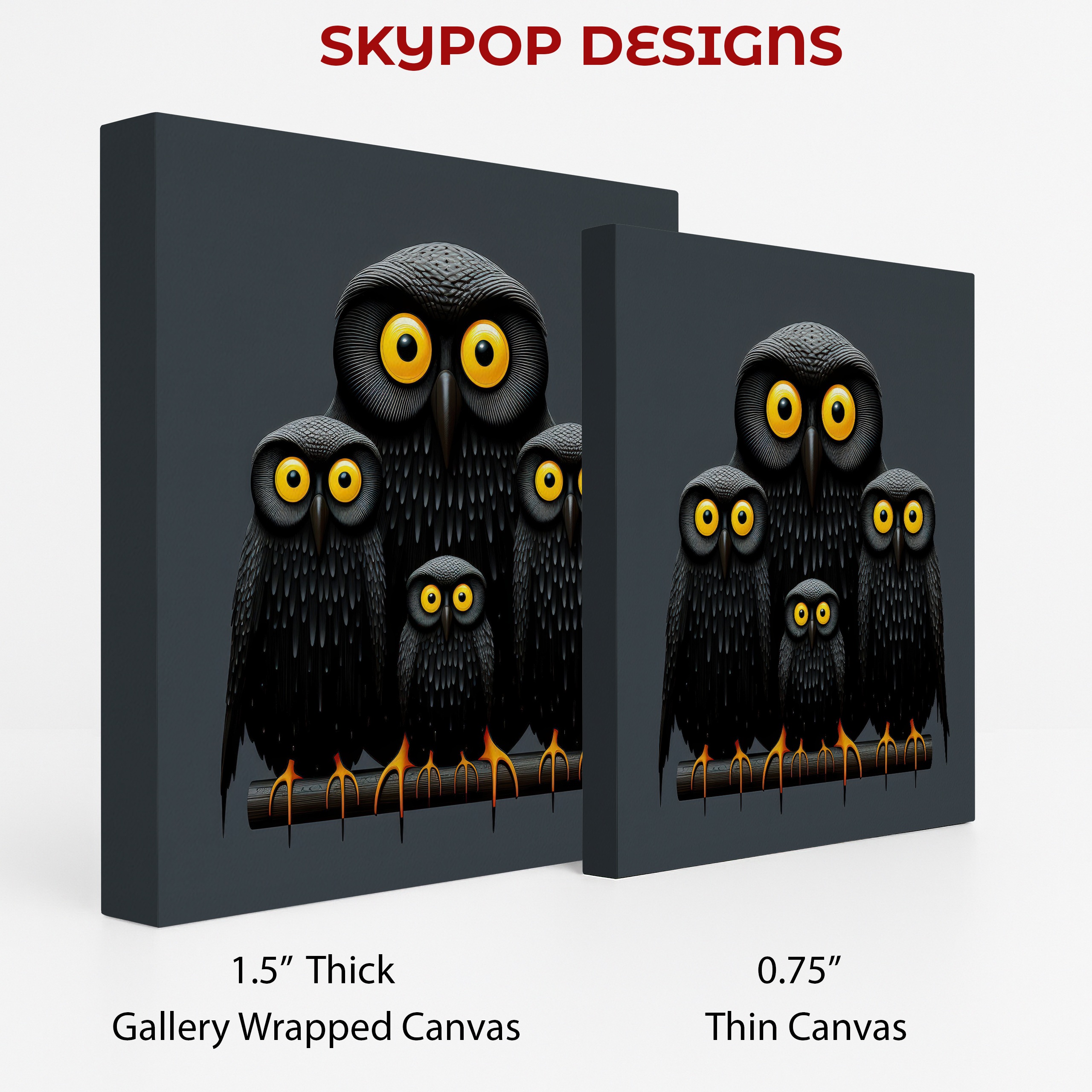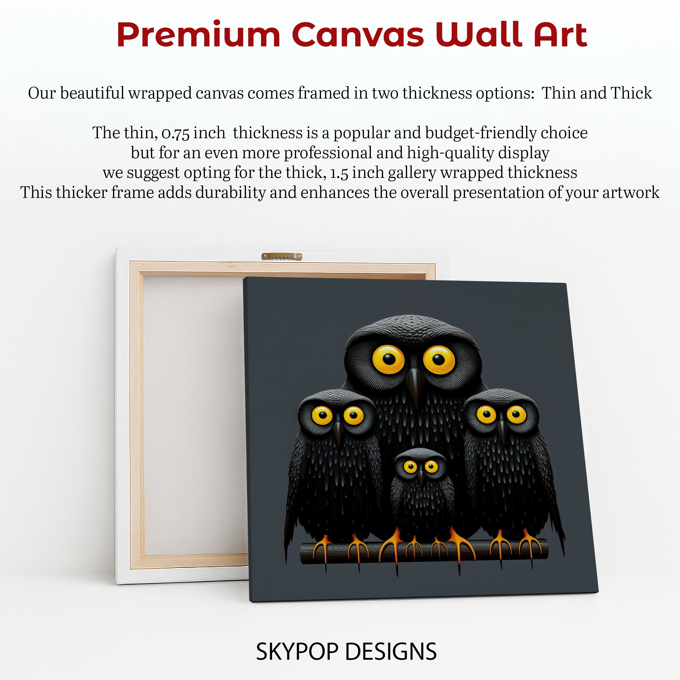 Keywords: owl art, owl family art, canvas wall art, nature art, modern art, contemporary art, whimsical art, black owl, yellow eyes, grey background, multicolor art, home decor, living room art, bedroom decor, entryway art, office decor, minimalist decor, eclectic decor, animal art, striking owl, unique art, wall decor, art print, owl poster, housewarming gift, birthday present, holiday gift, owl lover gift, art enthusiast gift, animal wall art