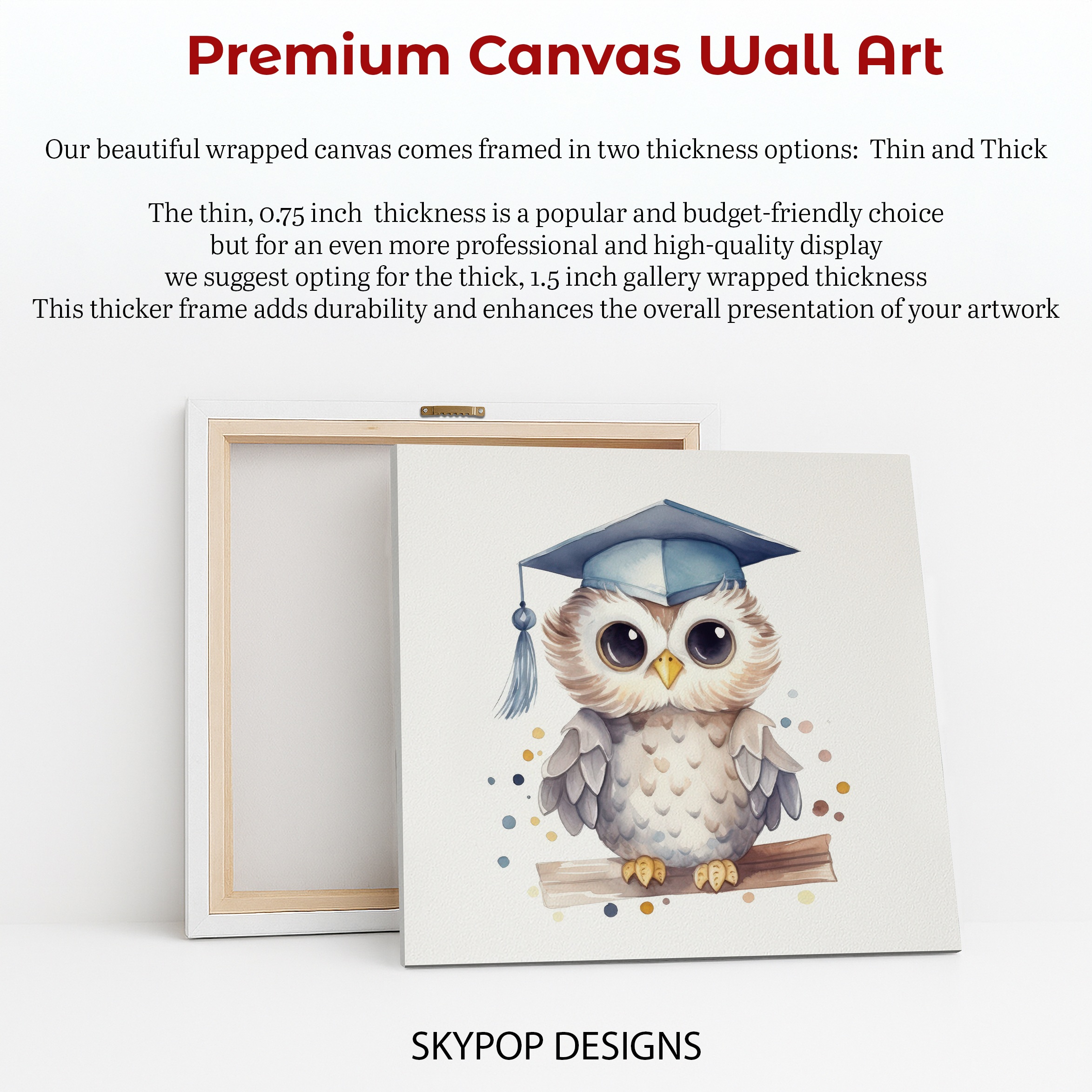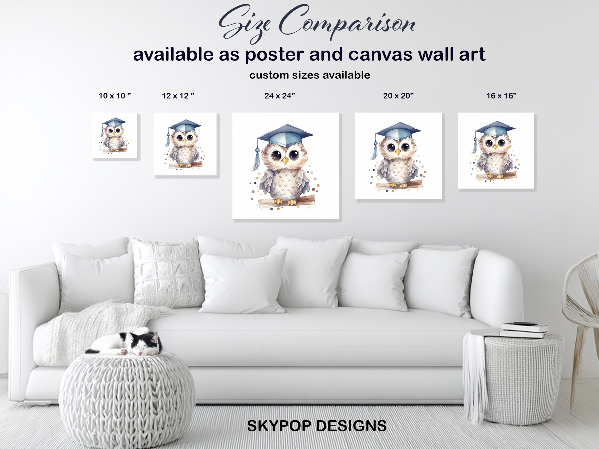 Transform your space with this adorable owl canvas wall art featuring a charming owl wearing a graduation cap. This delightful piece is perfect for celebrating academic achievements and adds a whimsical touch to any room. This owl poster or canvas wall art is a fantastic gift for graduation, birthdays, or any book lover, bringing a sense of accomplishment and joy. The soft blues and natural browns create a calming yet vibrant atmosphere, ideal for a child’s bedroom, nursery, or playroom. Its contemporary style blends seamlessly with bohemian or modern decor, making it a versatile addition to your home. The watercolor effect gives this owl print a unique, artistic feel that will capture attention. Showcase your love for learning and nature with this heartwarming wall art. It’s a perfect statement piece to elevate your living room or office space. This high-quality canvas wall art ensures lasting beauty, transforming your walls into a source of inspiration. Brighten up your home with this captivating owl artwork that symbolizes wisdom and new beginnings. Make this inspiring owl poster the focal point of your decor collection today and celebrate every milestone.