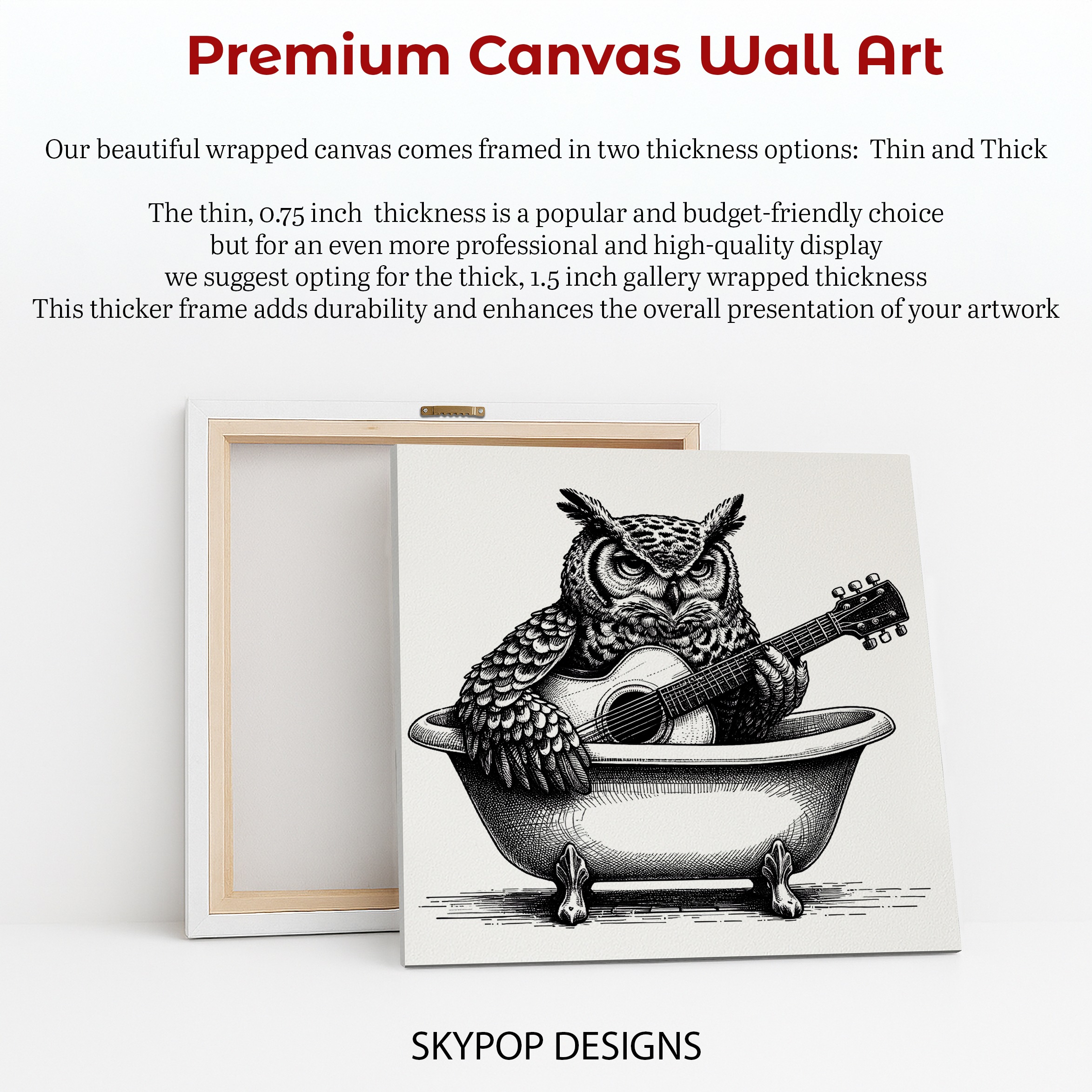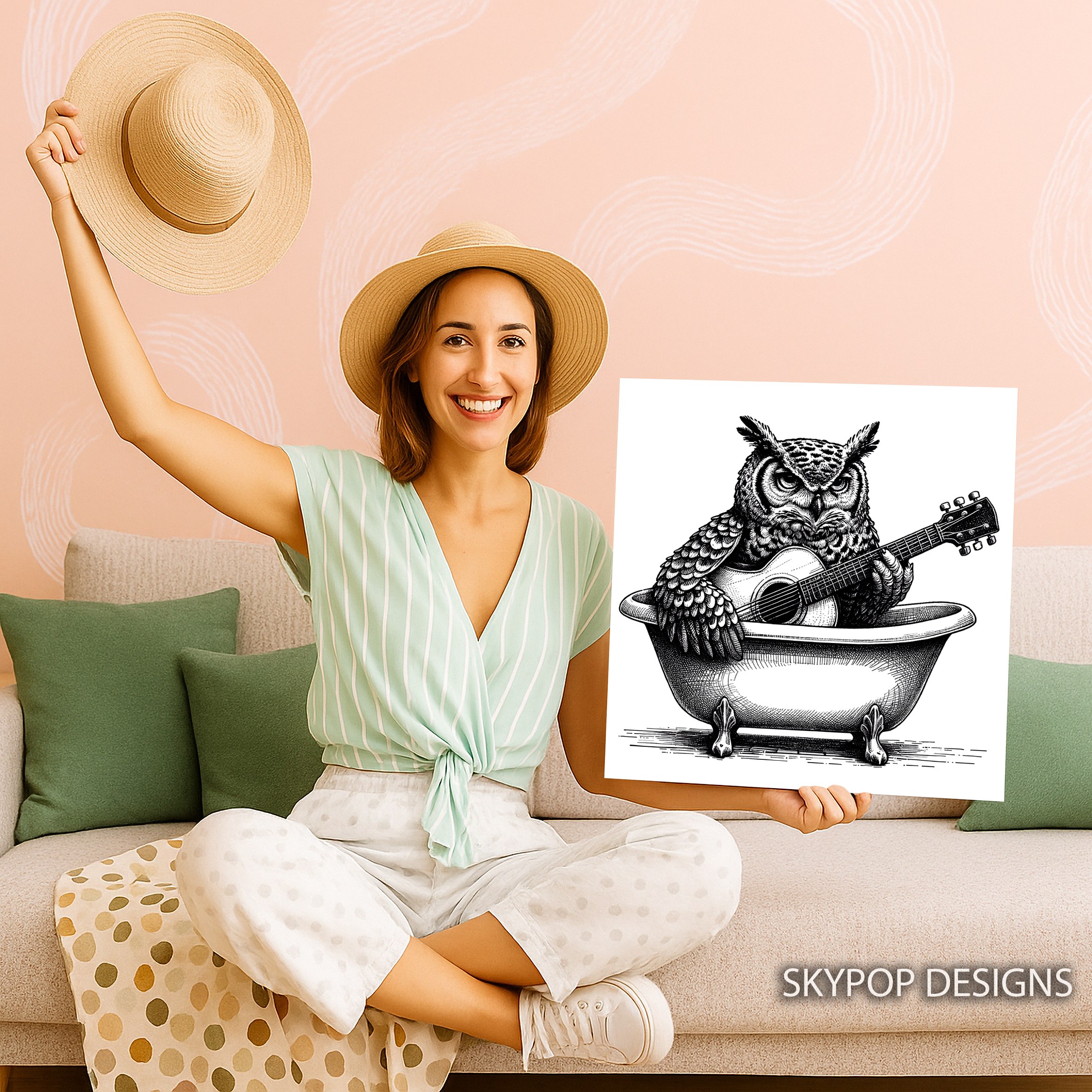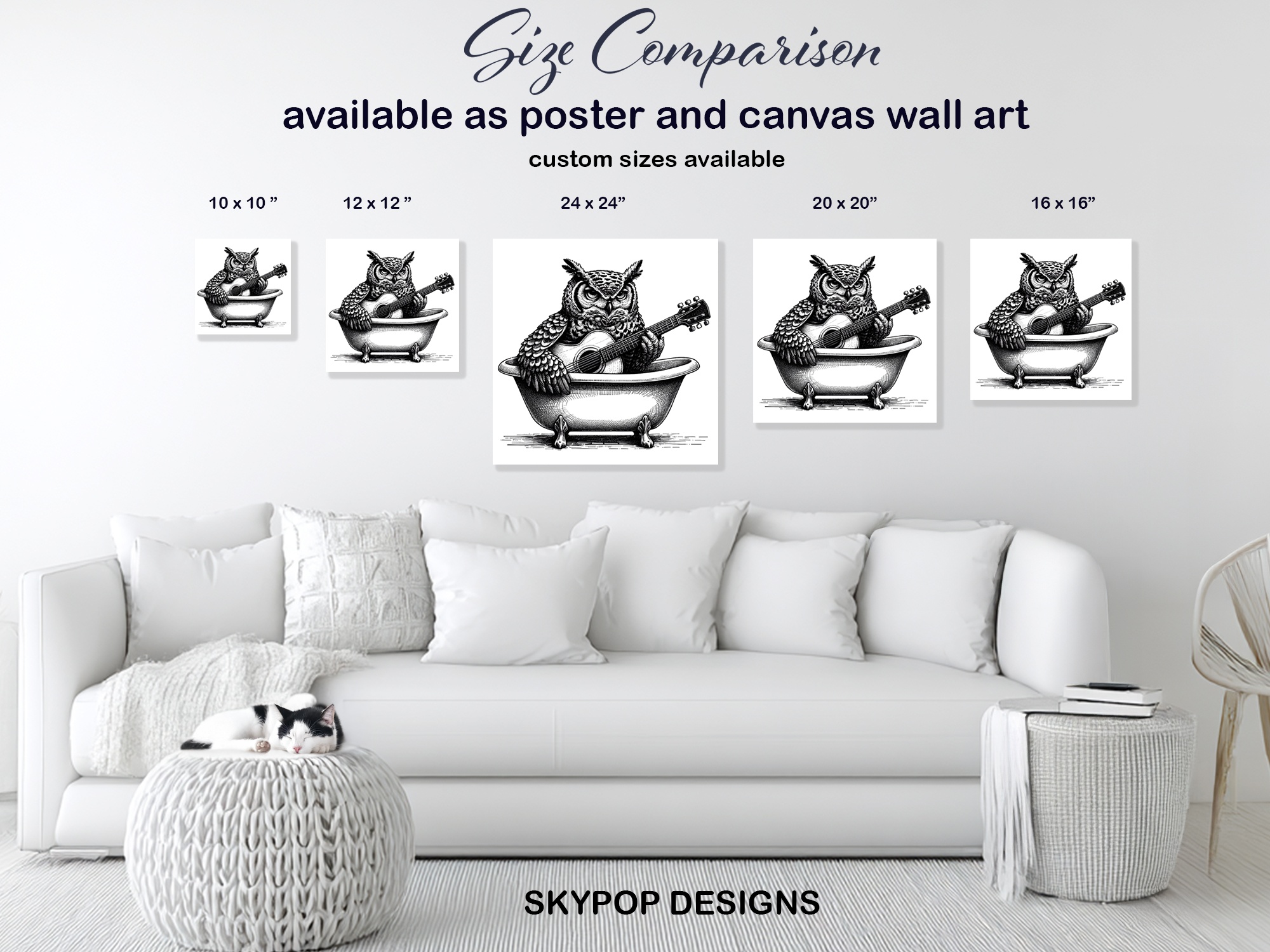 Transform your space with this whimsical owl guitar bathtub canvas wall art that’s sure to make a splash in any room. This striking poster features a detailed black and white illustration of an owl perched in a vintage clawfoot bathtub, strumming an acoustic guitar. Perfect for music lovers and animal enthusiasts alike, this unique piece adds a touch of humor and charm to contemporary living rooms or modern bathrooms. The intricate linework and bold contrast create a captivating focal point that draws the eye and sparks conversation. Ideal for bohemian decor, this canvas art blends quirky animal imagery with musical elements, making it a versatile addition to bedrooms, offices, or creative spaces. The owl’s intense gaze and ruffled feathers convey a sense of wisdom and creativity, while the unexpected bathtub setting adds a playful twist. This poster is a great gift for musicians, owl lovers, or anyone with an appreciation for offbeat art. The high-quality printing ensures every feather and guitar string is crisp and clear, allowing viewers to appreciate the artist’s skill. Whether you’re looking to add some personality to a minimalist space or complement an eclectic gallery wall, this owl guitar bathtub art is sure to make a statement. Elevate your home decor with this eye-catching blend of nature and music-inspired art that celebrates the unexpected. Bring a touch of whimsy to your walls and transform your room today with this unforgettable owl artwork.